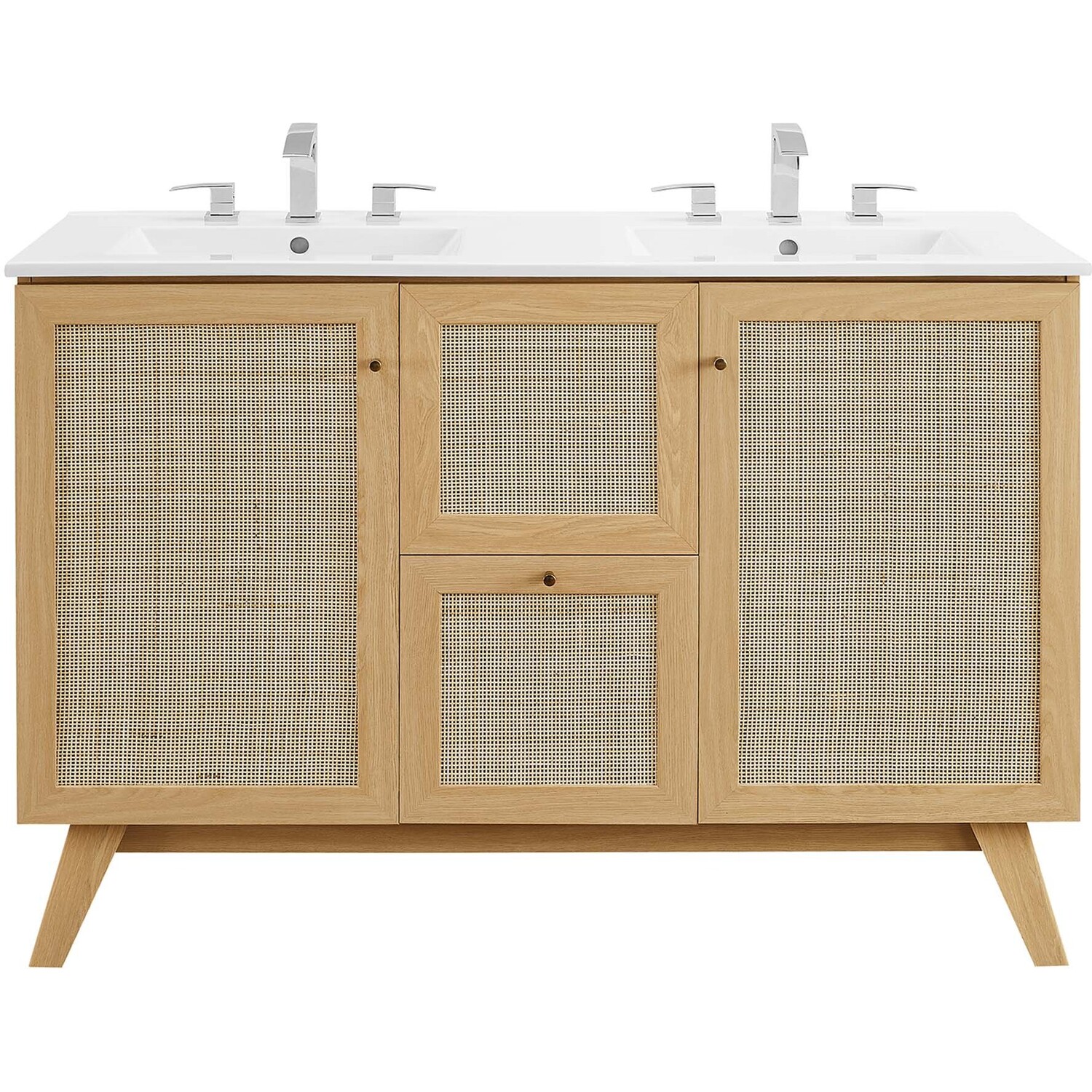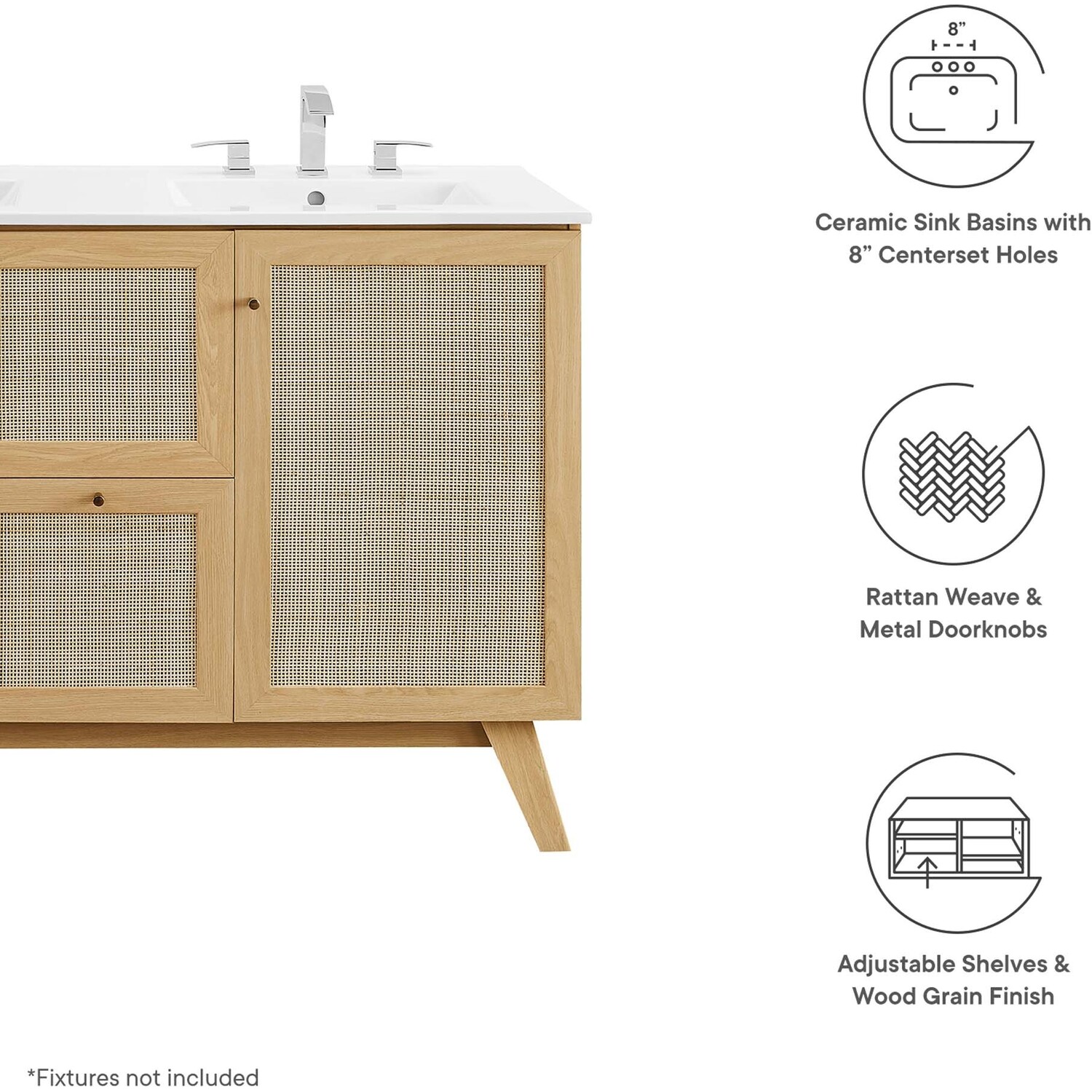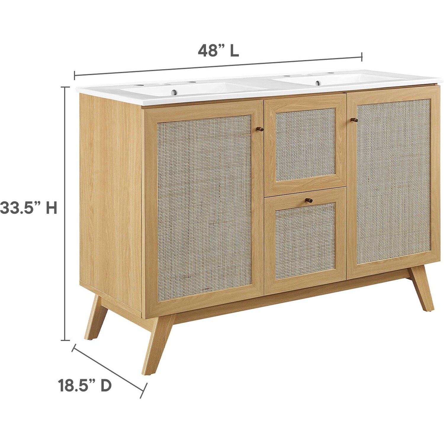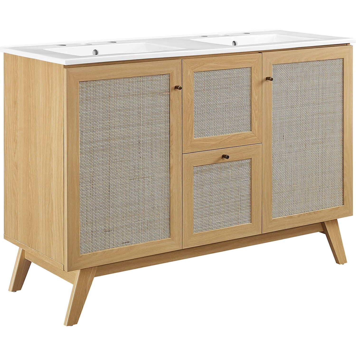 Introduce refreshing style to your restroom with the Soma 48” Double Sink Bathroom Vanity. Showcasing a beautiful rattan weave on the cupboard doors and drawer fronts, this vanity cabinet brings organic aesthetics and modern functionality to any bathroom or powder room. Crafted from durable MDF and particleboard with a natural wood grain finish, this vanity boasts two ceramic basins with 8-inch centerset holes and an integrated countertop. This vanity features two cupboards with two drawers nestled in between, one thoughtfully spacious and the other decorative and non-functional. Inside each cupboard there’s an adjustable shelf, providing easy customization for arranging towels, toiletries, and bathroom necessities. Complete with metal doorknobs with a brushed gold finish and soft-close hinges, this bathroom vanity cabinet is designed for quiet and effortless functionality. Resting on splayed legs, the Soma Bathroom Vanity includes non-marking foot caps to protect flooring. Assembly required. Fixtures not included. Weight Capacity: 200 lbs.MDF and Particleboard