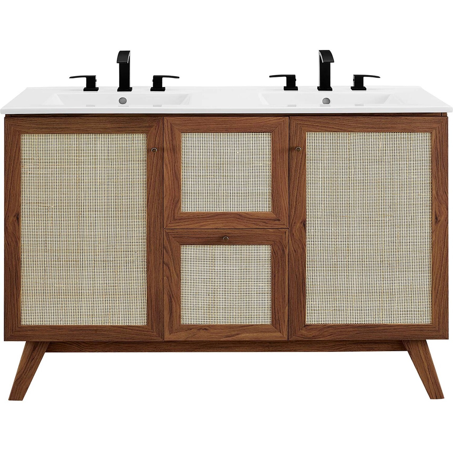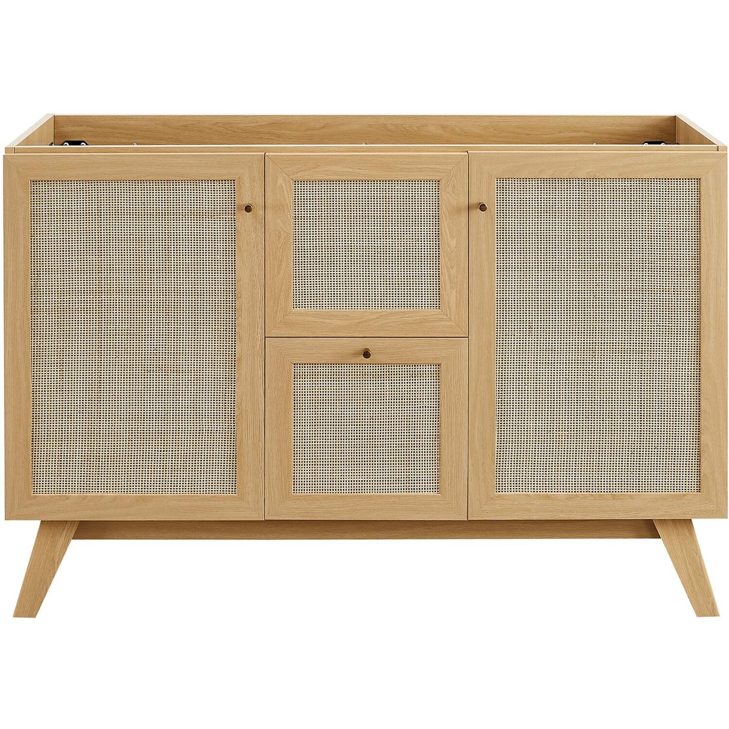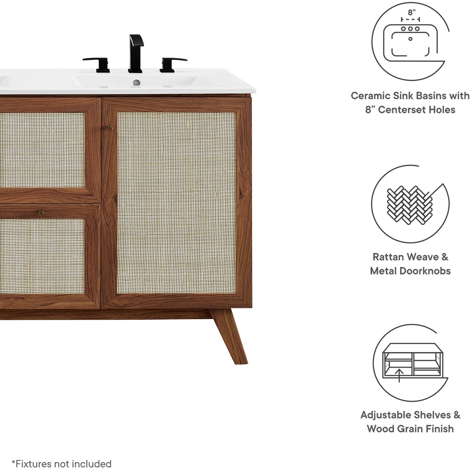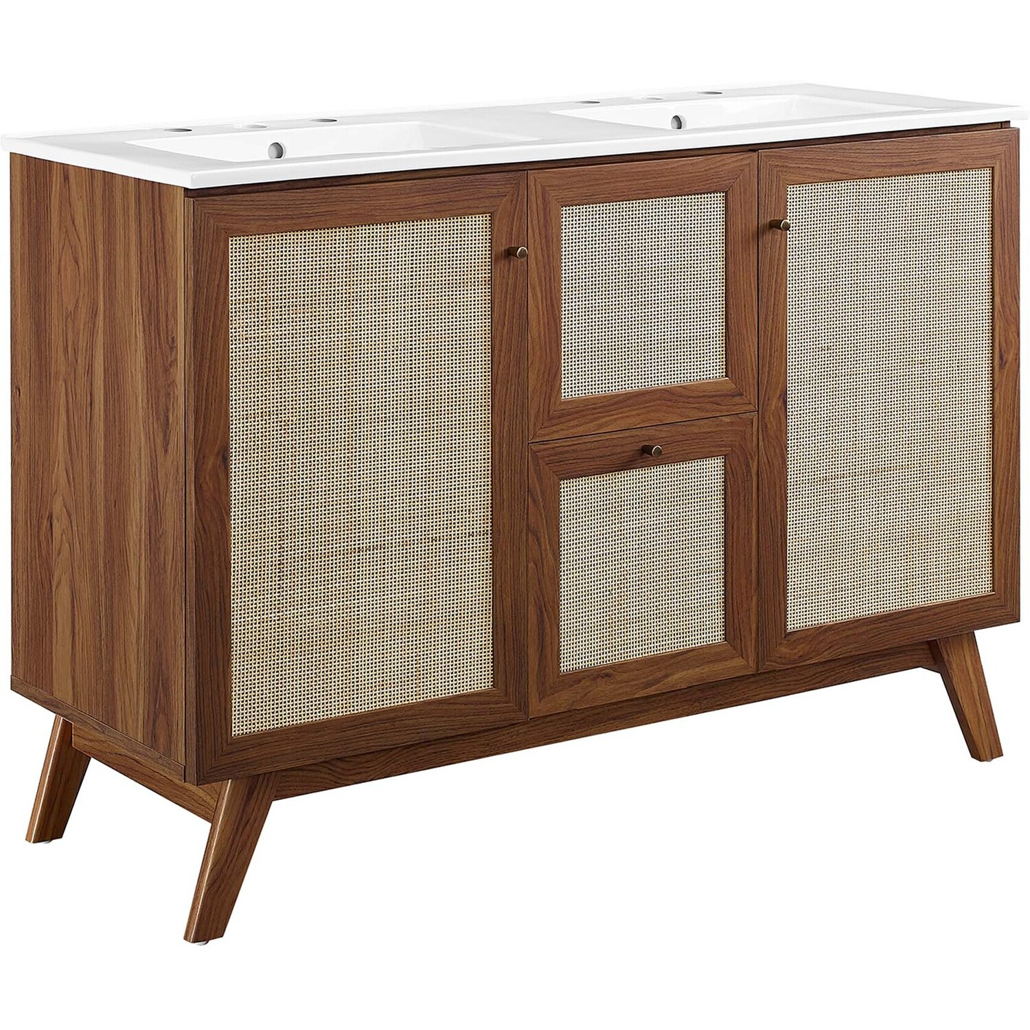 Introduce refreshing style to your restroom with the Soma 48” Double Sink Bathroom Vanity. Showcasing a beautiful rattan weave on the cupboard doors and drawer fronts, this vanity cabinet brings organic aesthetics and modern functionality to any bathroom or powder room. Crafted from durable MDF and particleboard with a natural wood grain finish, this vanity boasts two ceramic basins with 8-inch centerset holes and an integrated countertop. This vanity features two cupboards with two drawers nestled in between, one thoughtfully spacious and the other decorative and non-functional. Inside each cupboard there’s an adjustable shelf, providing easy customization for arranging towels, toiletries, and bathroom necessities. Complete with metal doorknobs with a brushed gold finish and soft-close hinges, this bathroom vanity cabinet is designed for quiet and effortless functionality. Resting on splayed legs, the Soma Bathroom Vanity includes non-marking foot caps to protect flooring. Assembly required. Fixtures not included. Weight Capacity: 200 lbs.MDF and Particleboard