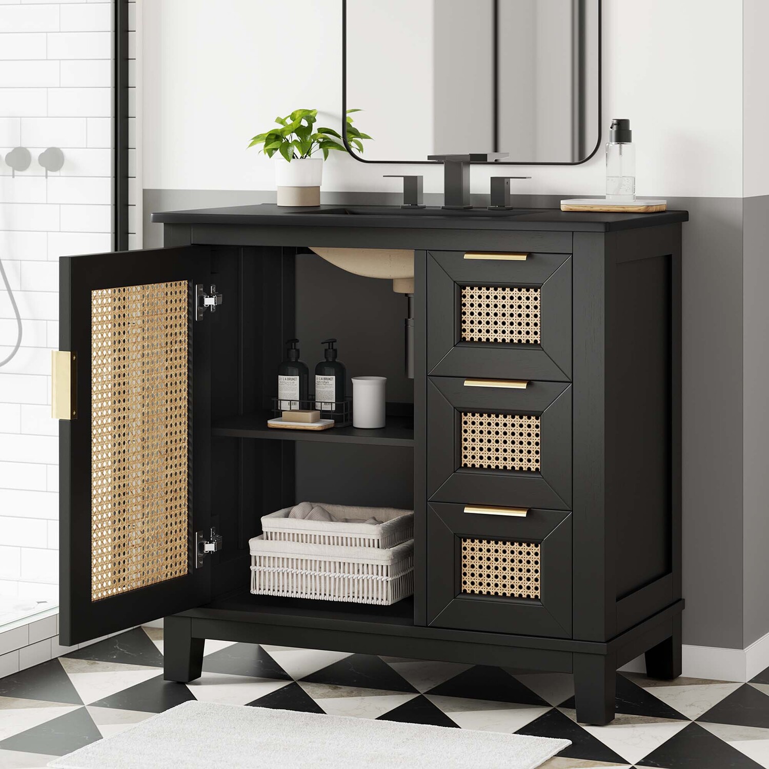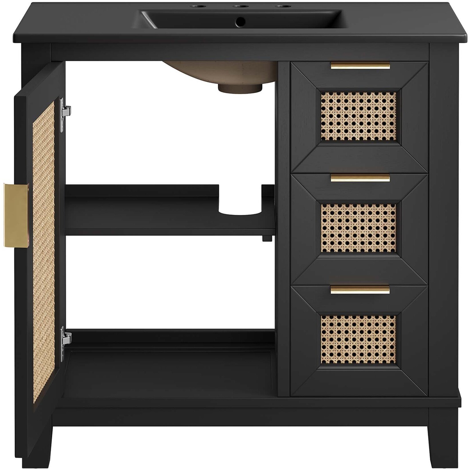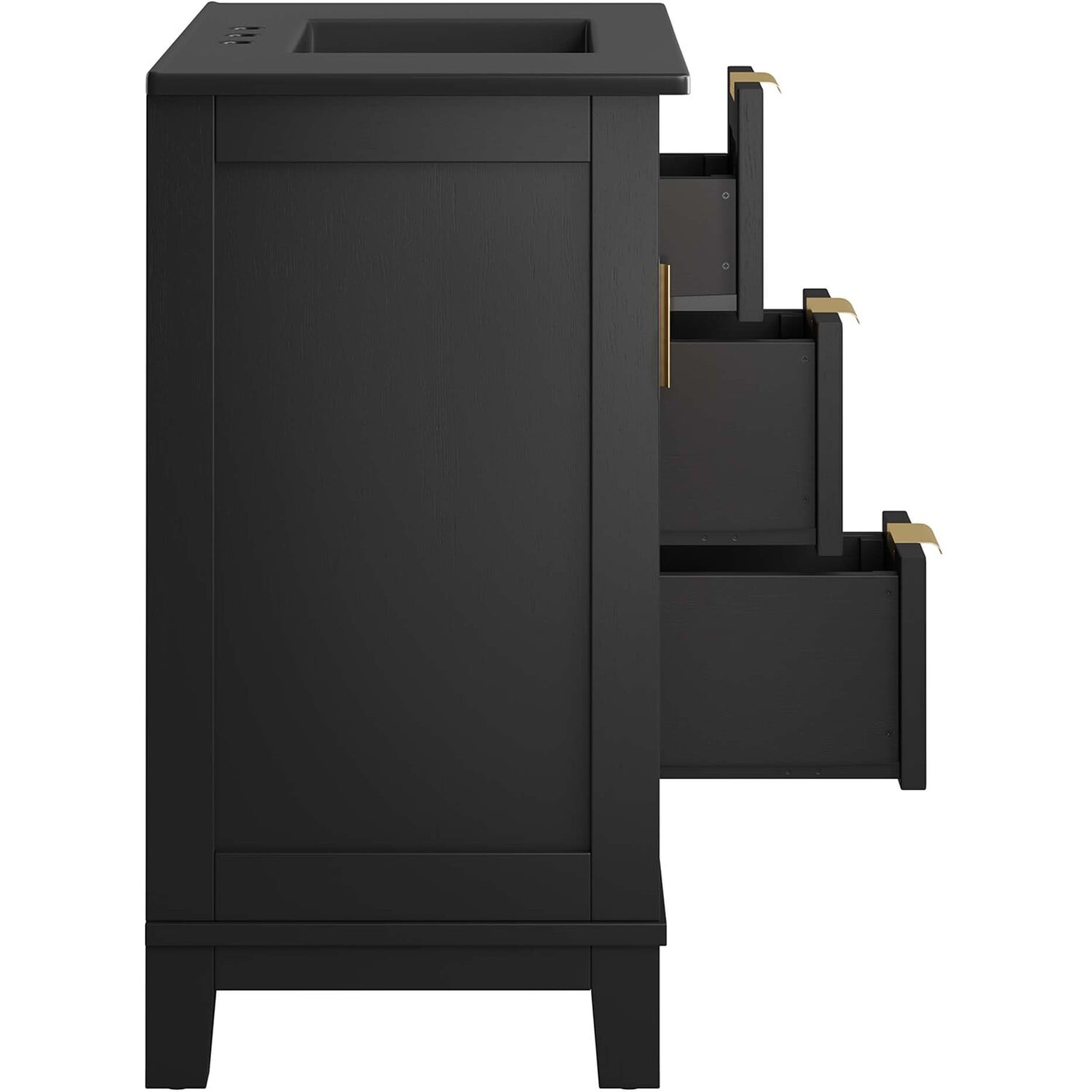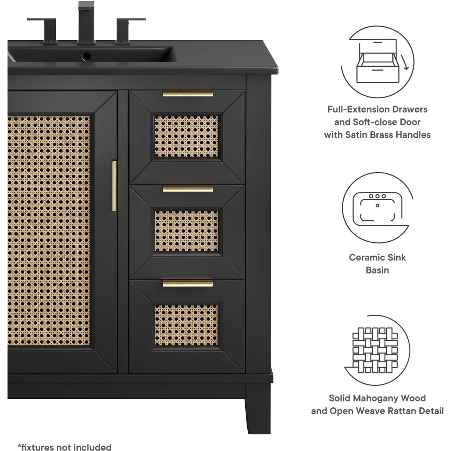 With its clean lines, smooth surfaces, and contemporary angles, the Dixie 36” Bathroom Vanity introduces a layer of modern sophistication to any bathroom space. Crafted from solid Mahogany wood, it stands firm on slightly tapered legs and is fitted with a sleek ceramic basin boasting an integrated countertop and 8-inch centerset faucet holes. This vanity features one cabinet door, concealing a height-adjustable shelf with a cut-out design to accommodate plumbing, and three adjacent drawers, enhancing functionality and storage space. All compartments are tastefully adorned with satin brass handles and equipped with soft close hinges, for a smooth experience. Optimizing storage for a variety of bathroom essentials, from towels to toiletries, the Dixie Bathroom Vanity ensures that everything is conveniently at hand. It includes non-marking foot caps for floor protection. Sink basin and fixtures not included. Assembly required. Weight Capacity: 200 lbsSolid Mahogany Wood