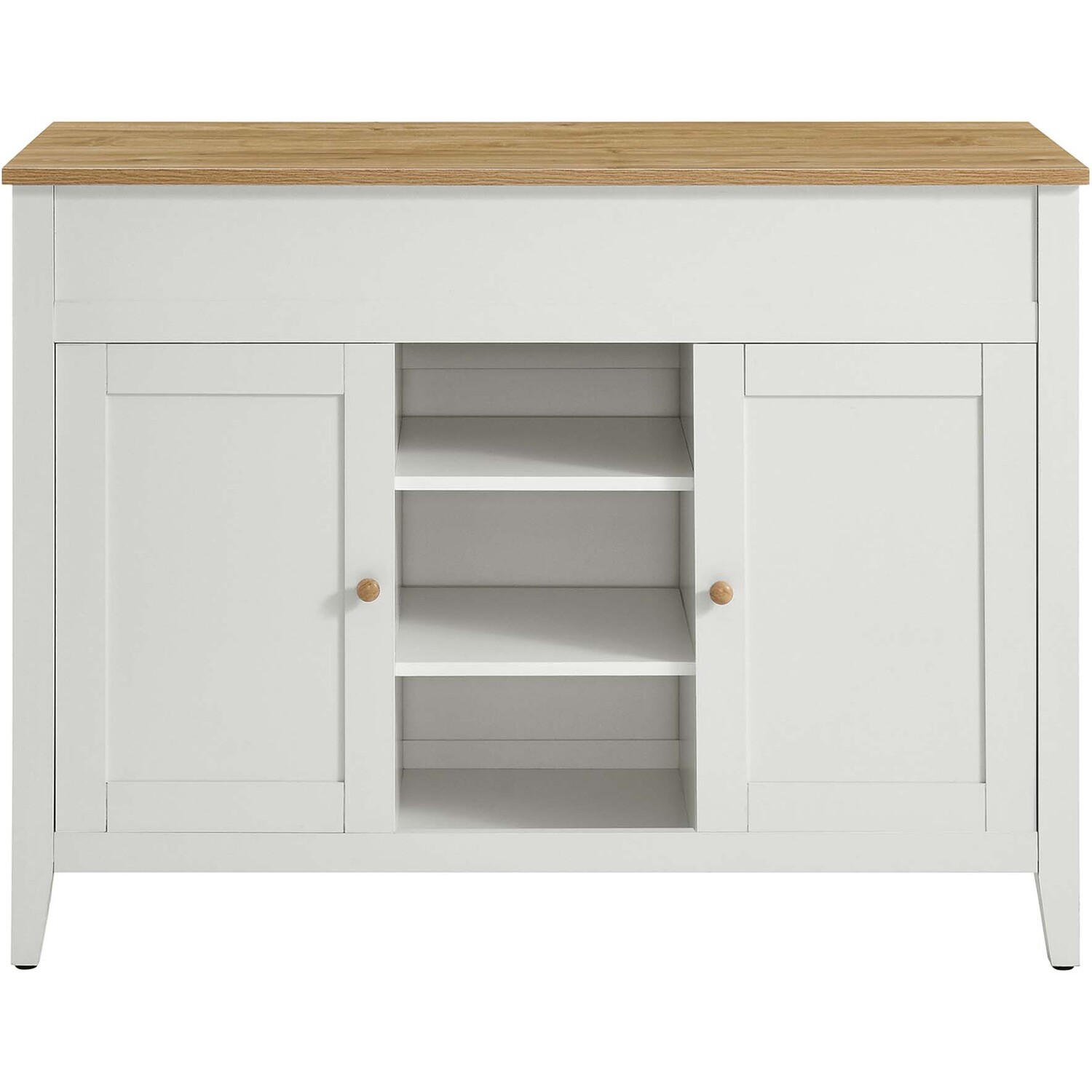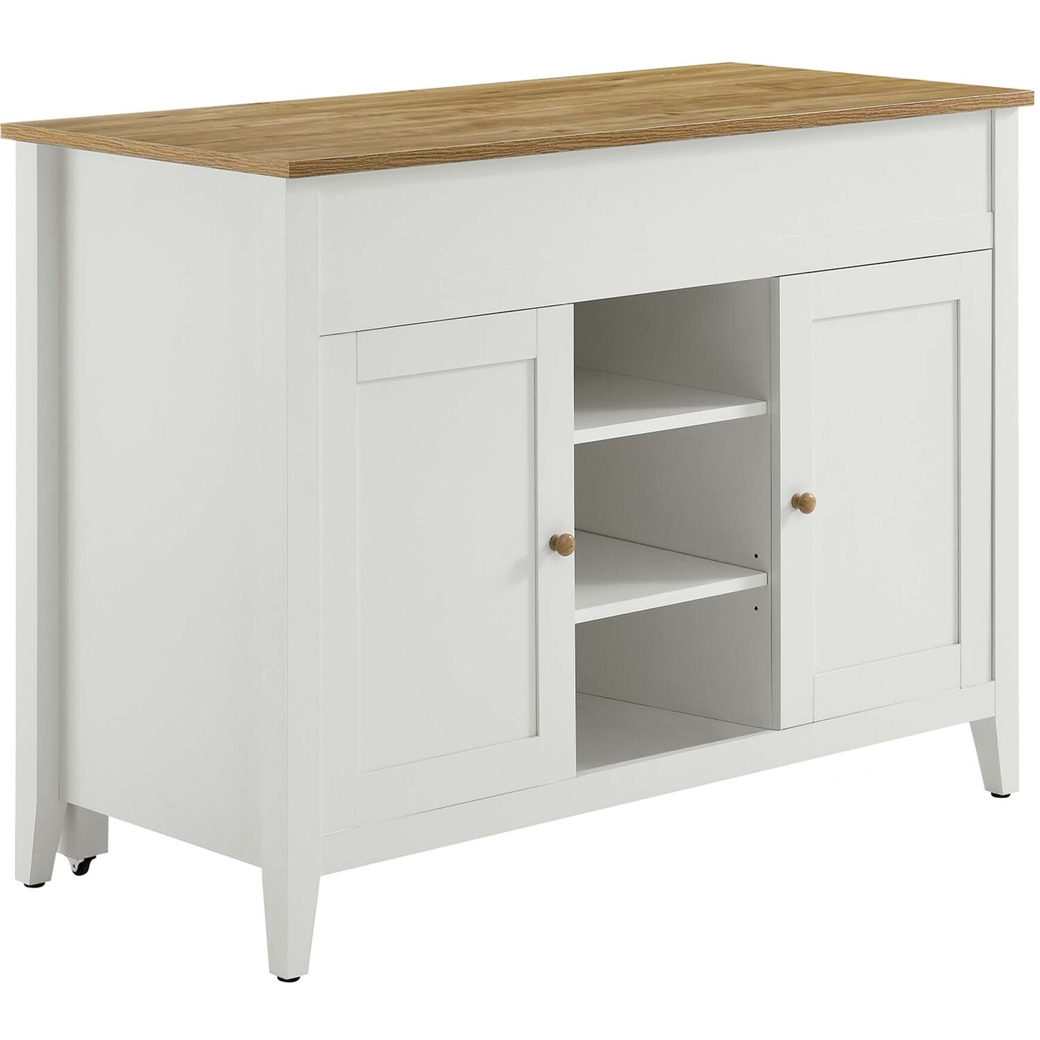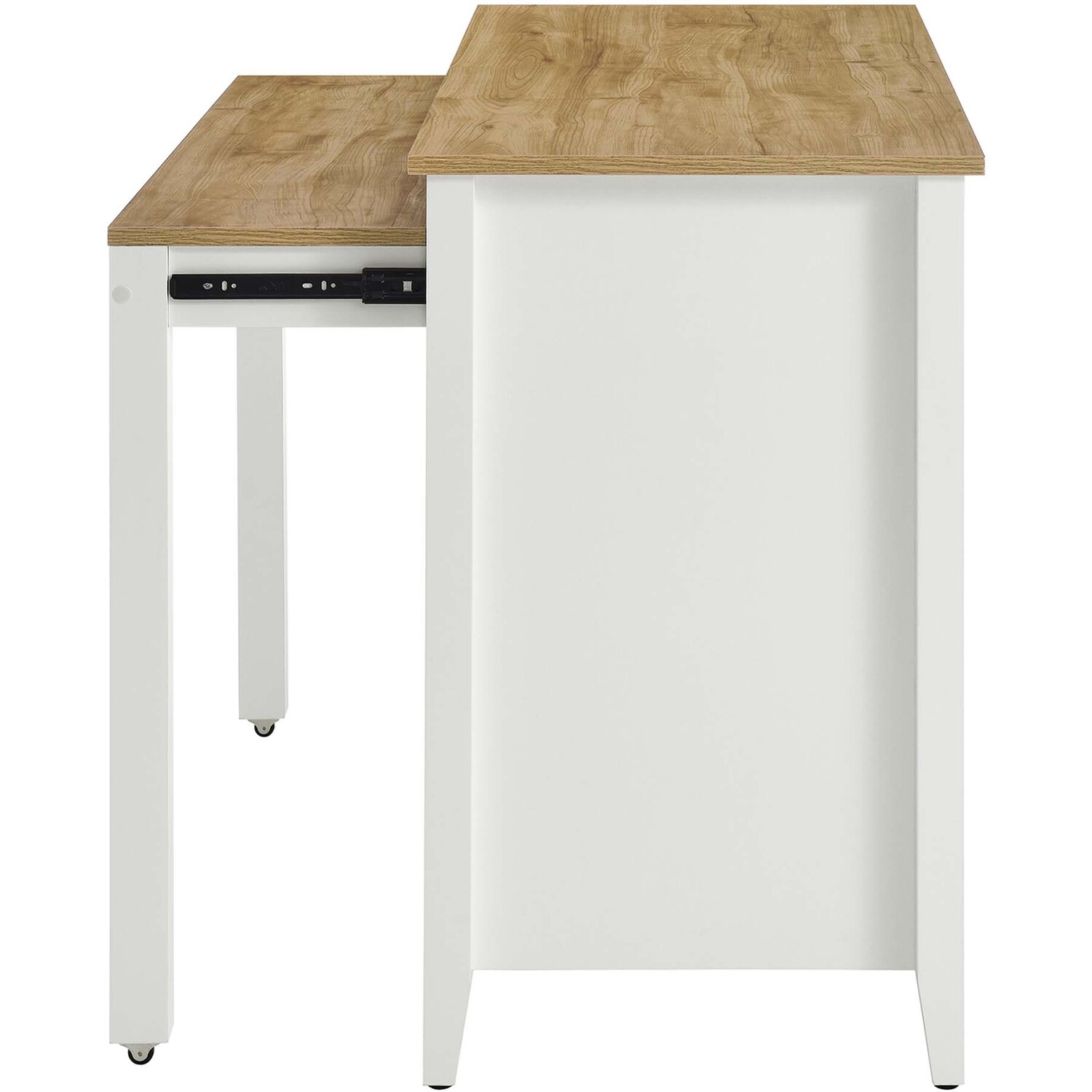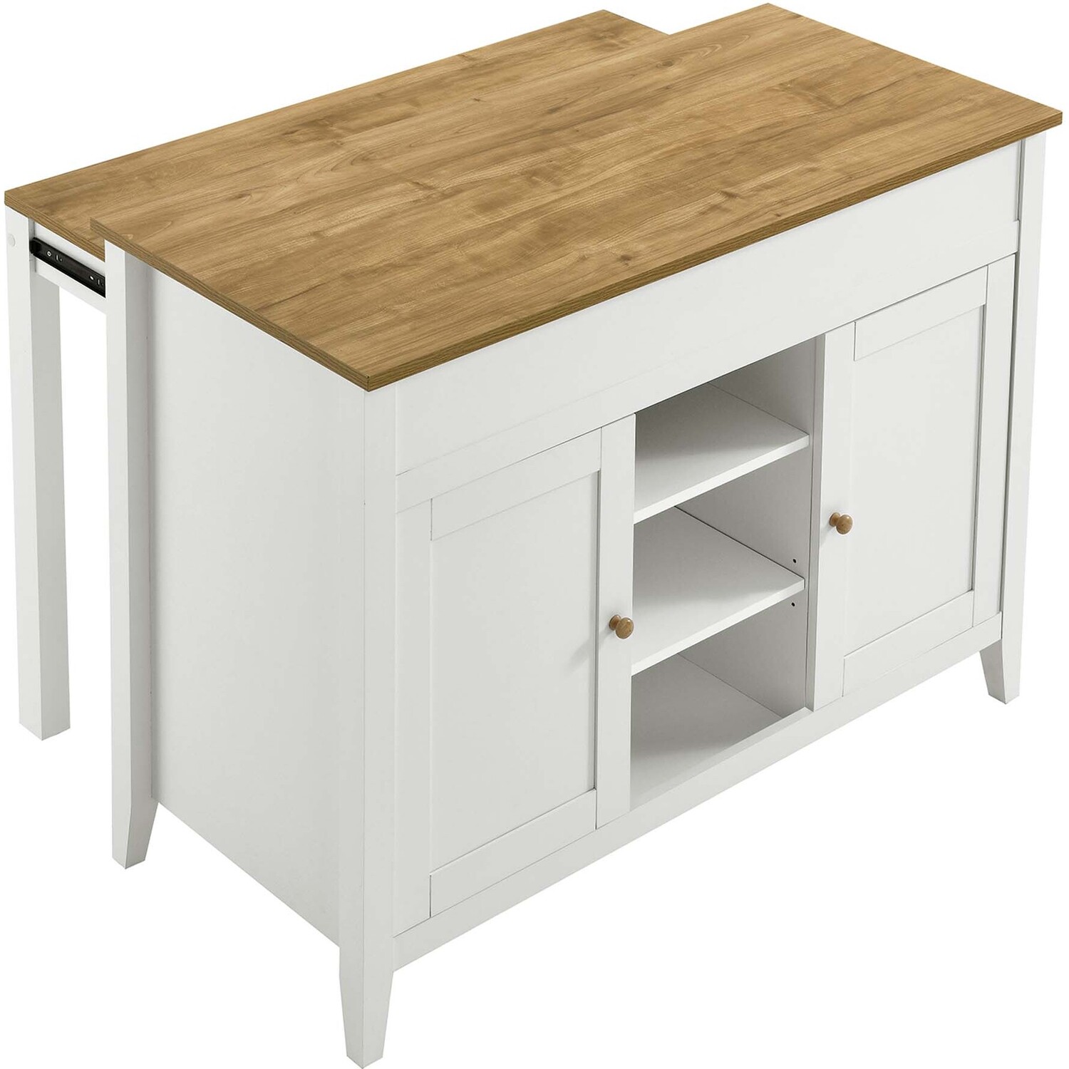 The Garland Kitchen Island seamlessly combines functionality with a timeless modern aesthetic, making it a must-have for any contemporary kitchen. This rustic kitchen island with a pull out table and built-in storage is durably crafted from particleboard, MDF, and paper laminate. It features a butcher block-inspired countertop with a rich wood grain finish, perfect for modern farmhouse kitchen island settings. Its thoughtful design offers ample kitchen storage, with two concealed compartments and an open area ideal for displaying items or storing everyday ingredients. The adjustable cabinet shelves accommodate cookware, kitchen essentials, tableware, cookbooks, and more, keeping everything you need conveniently within reach. This kitchen island also boasts a distinctive pull-out table on caster wheels, providing extra space for food preparation and seating for two bar stools. When not in use, it can be conveniently tucked away. Serving as a butcher block island, a prep counter, or extra counter space in a kitchenette, the Garland Kitchen Island is a versatile and stylish addition to your culinary space. Assembly required. Includes non-marking foot pads to protect flooring. Weight Capacity: 200 lbs.Timeless Kitchen Island