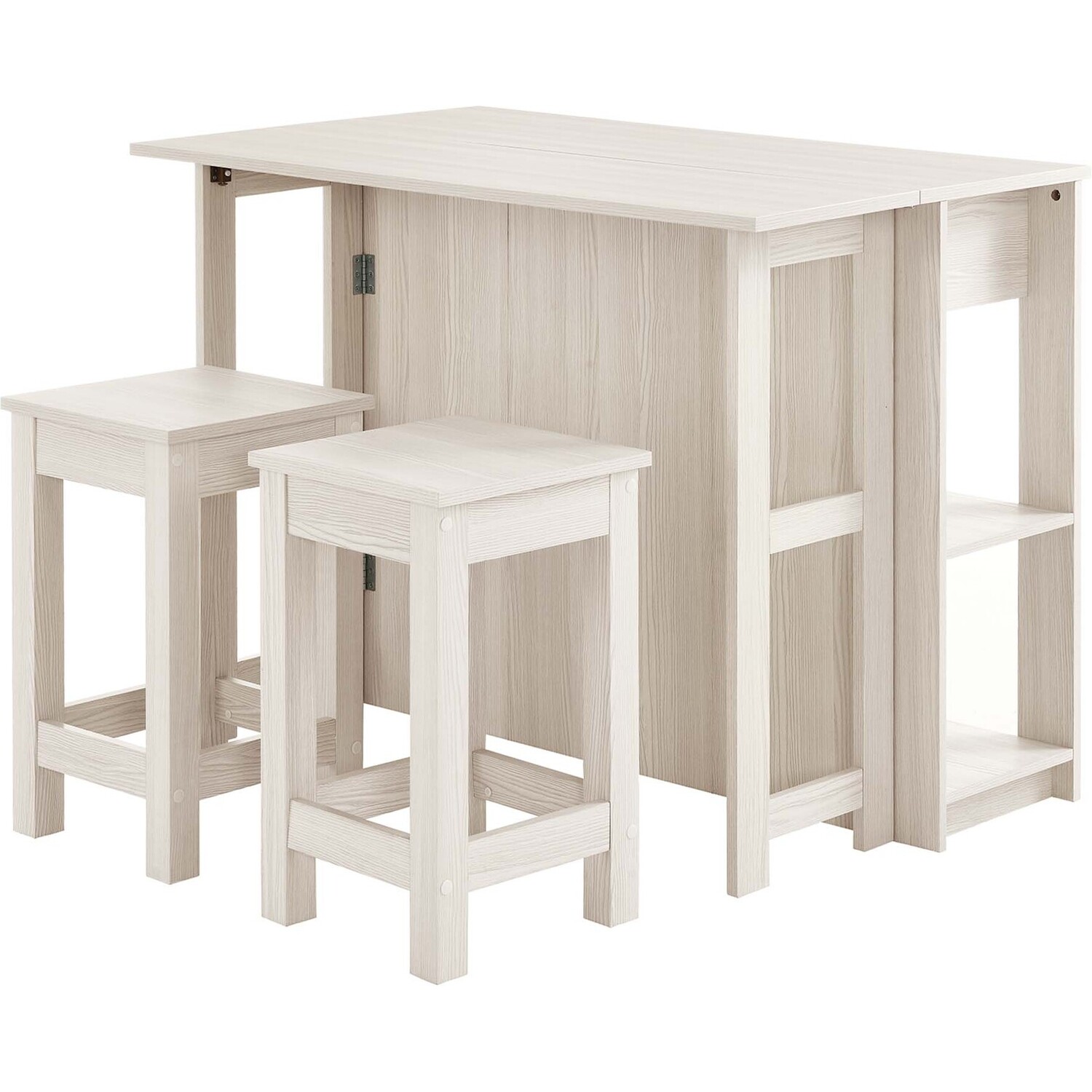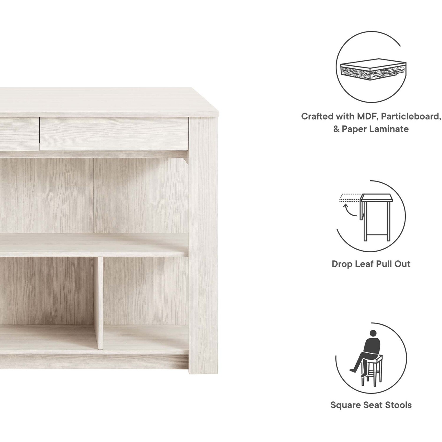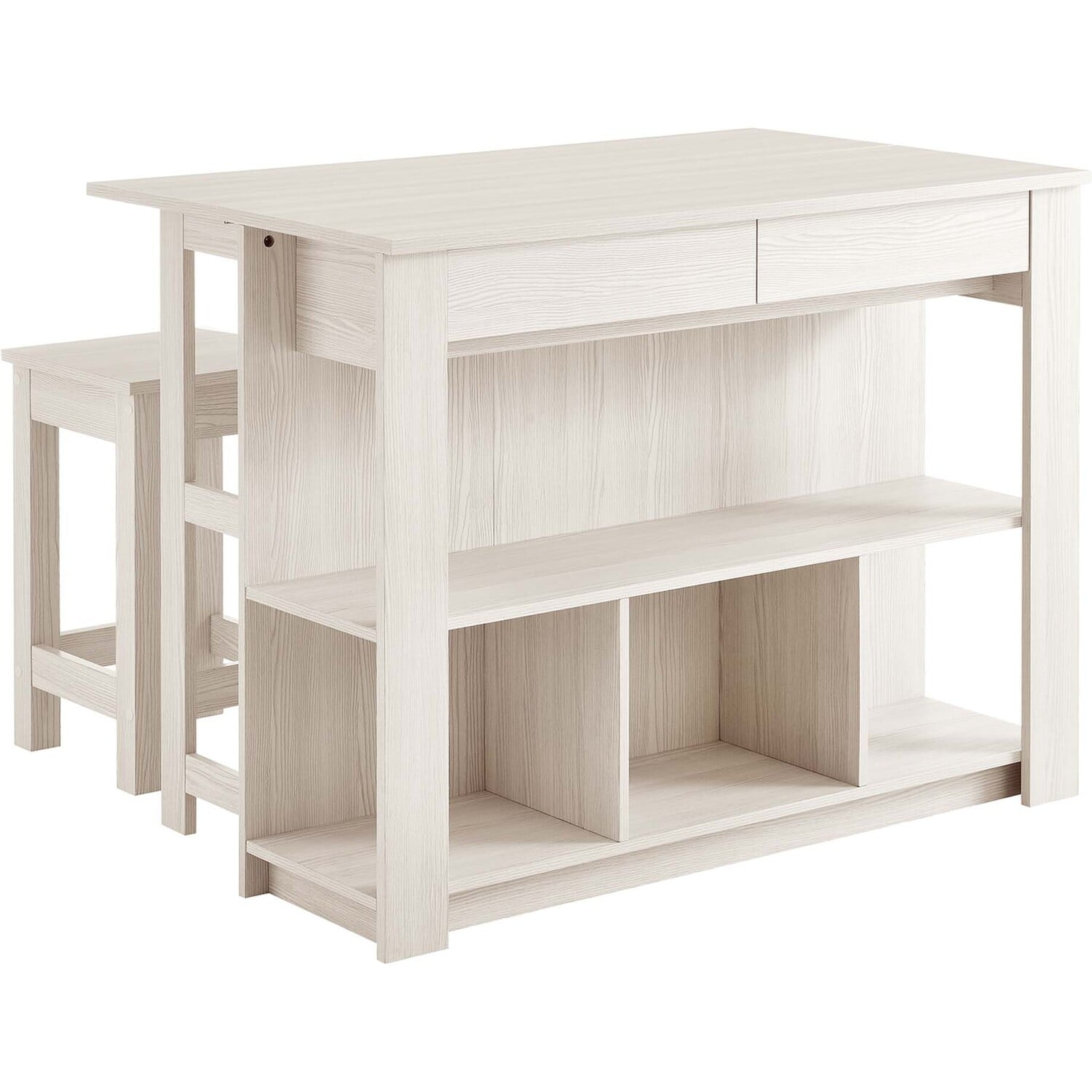 Discover the charm and functionality of the Meadowbrook 3-Piece Small Kitchen Island Set. This island table is crafted from durable particleboard, MDF, and paper laminate. This free-standing kitchen island cart features two cutlery drawers and open shelving, perfect for storing kitchen essentials and displaying decor. The innovative drop leaf design of this freestanding kitchen island not only increases your prep area but also converts it into a dining space. It comes with two matching stools, featuring square seats and footrests, which turn the island into a bar stool table for enjoying drinks post-meal. Complete with non-marking pads to protect your floors, this 3-piece island set is ideal for meal prep and casual dining, making it a stylish addition to any kitchen. Assembly required. Set Includes: 1 Kitchen Island, 2 Stools. Island Weight Capacity: 205 lbs; Stool Weight Capacity: 500 lbs.Modern Kitchen Island Set
