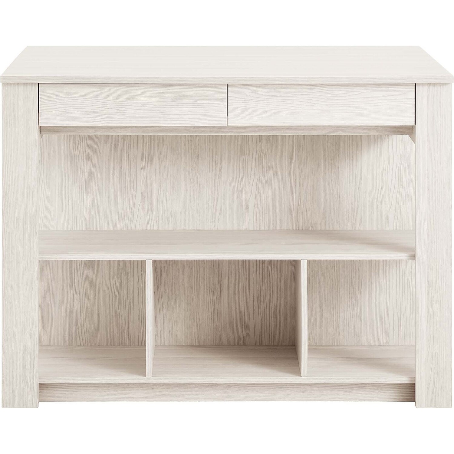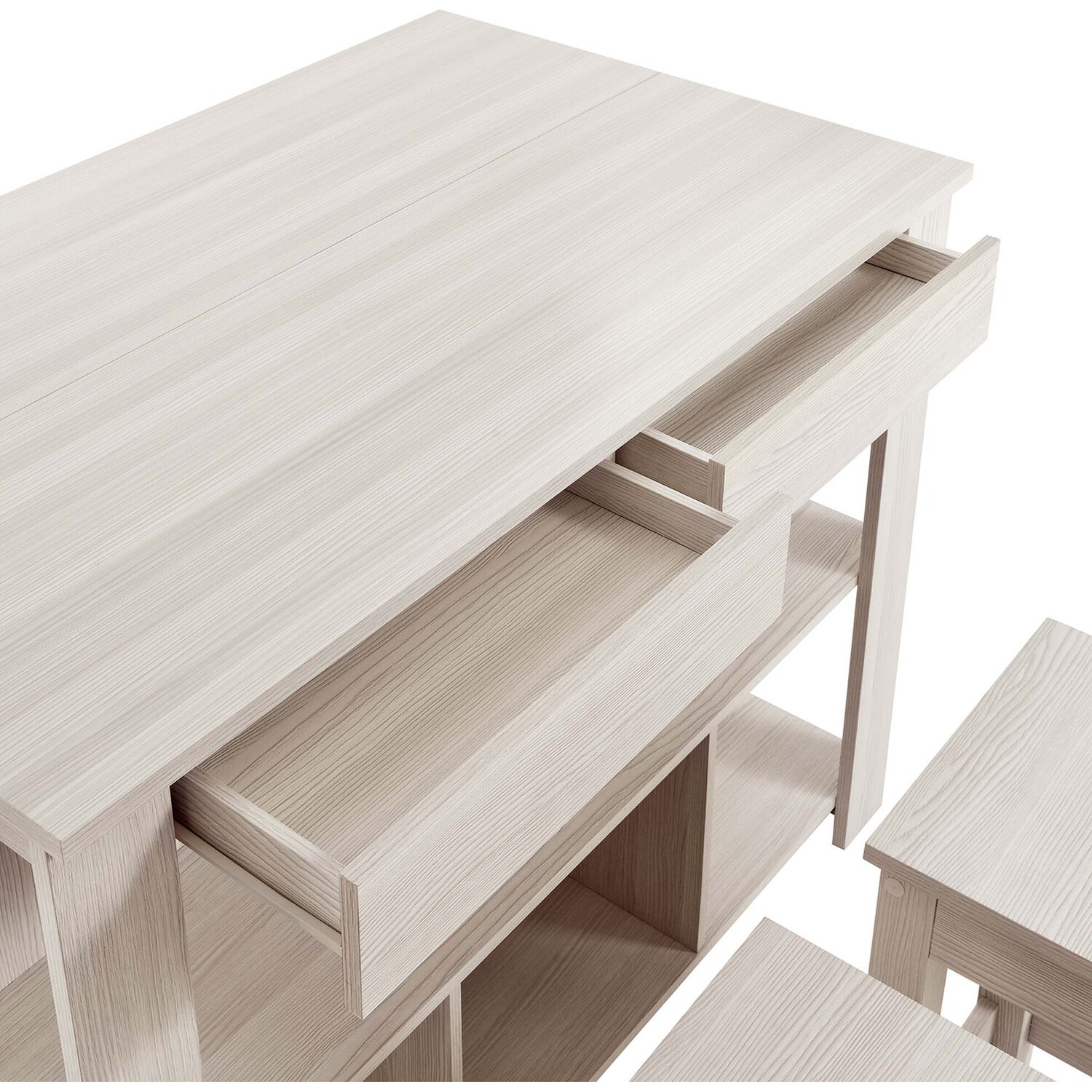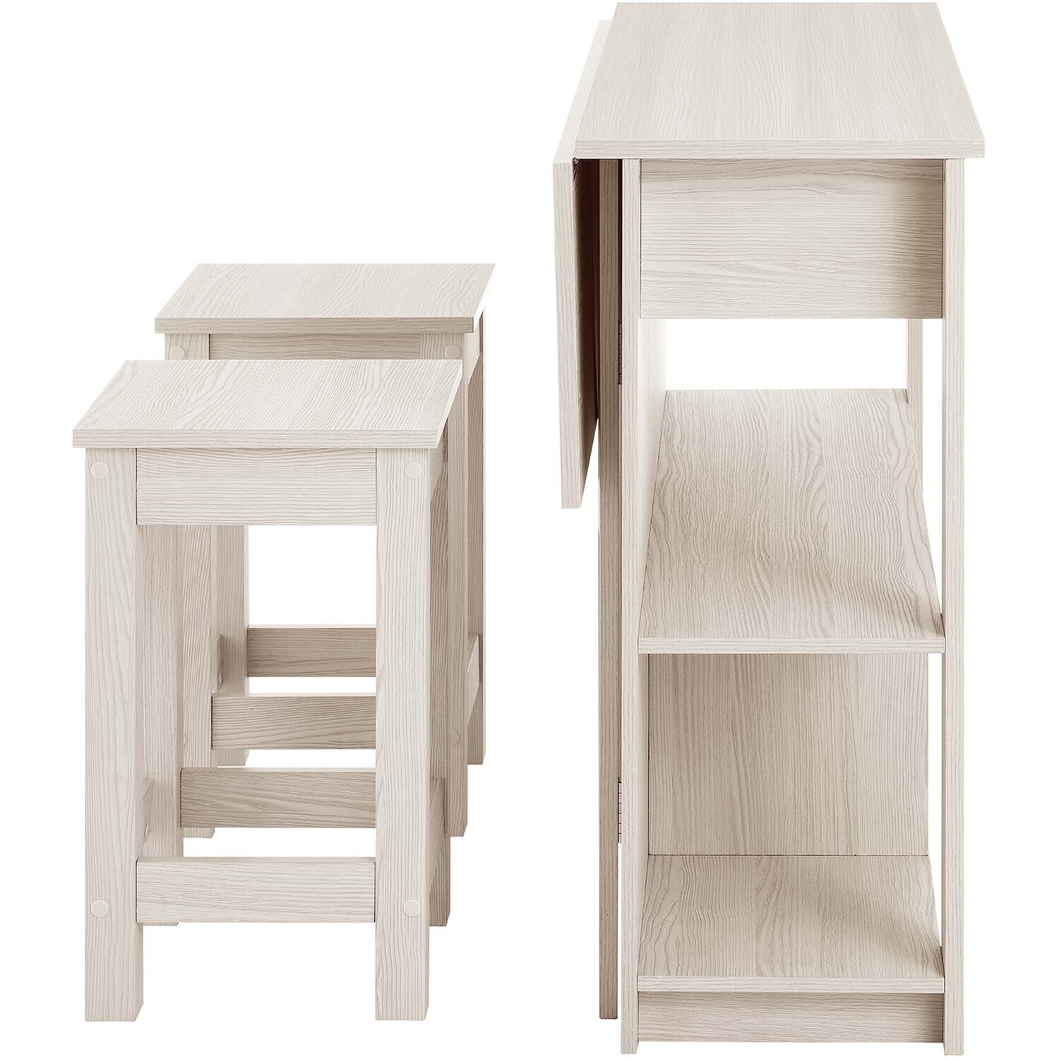 Discover the charm and functionality of the Meadowbrook 3-Piece Small Kitchen Island Set. This island table is crafted from durable particleboard, MDF, and paper laminate. This free-standing kitchen island cart features two cutlery drawers and open shelving, perfect for storing kitchen essentials and displaying decor. The innovative drop leaf design of this freestanding kitchen island not only increases your prep area but also converts it into a dining space. It comes with two matching stools, featuring square seats and footrests, which turn the island into a bar stool table for enjoying drinks post-meal. Complete with non-marking pads to protect your floors, this 3-piece island set is ideal for meal prep and casual dining, making it a stylish addition to any kitchen. Assembly required. Set Includes: 1 Kitchen Island, 2 Stools. Island Weight Capacity: 205 lbs; Stool Weight Capacity: 500 lbs.Modern Kitchen Island Set