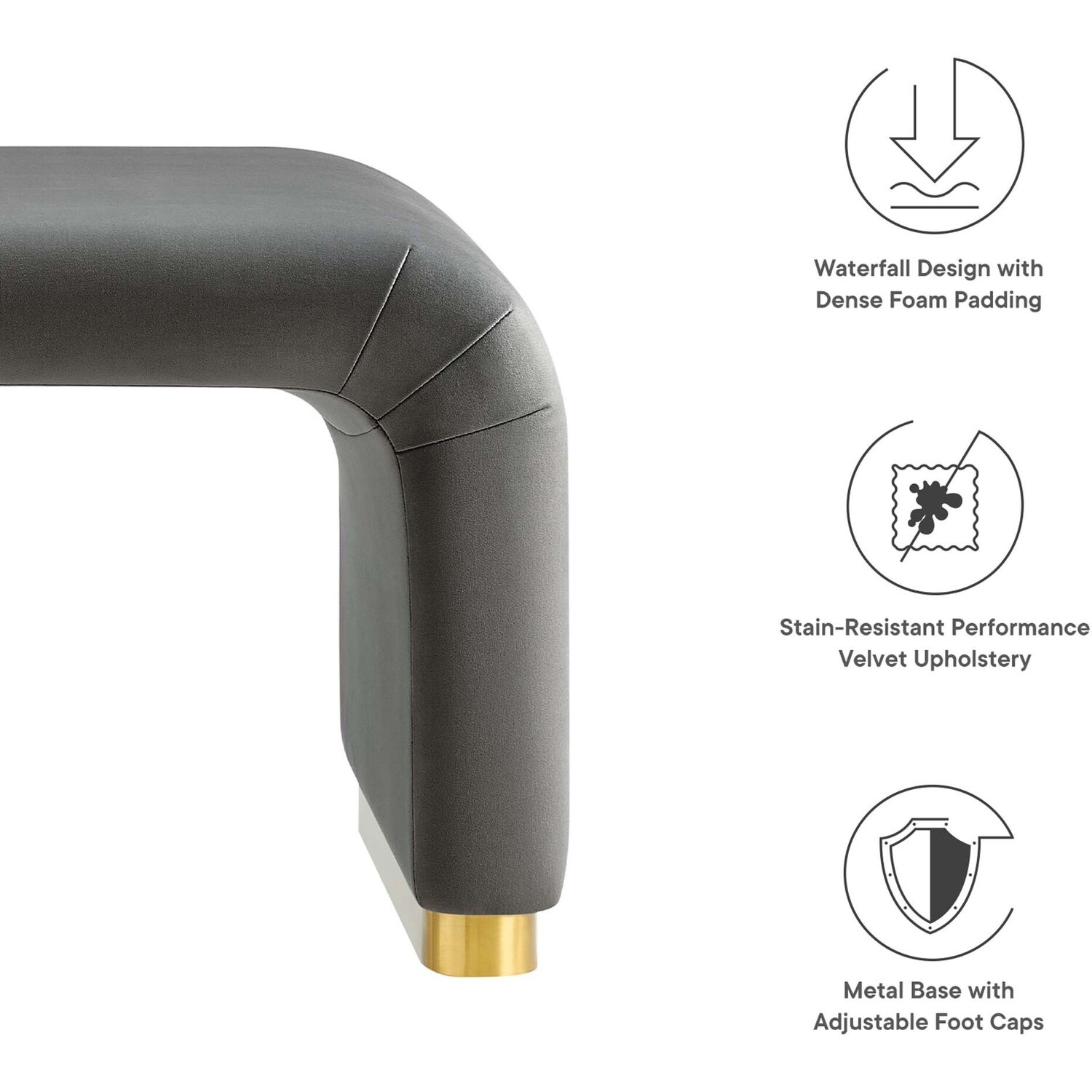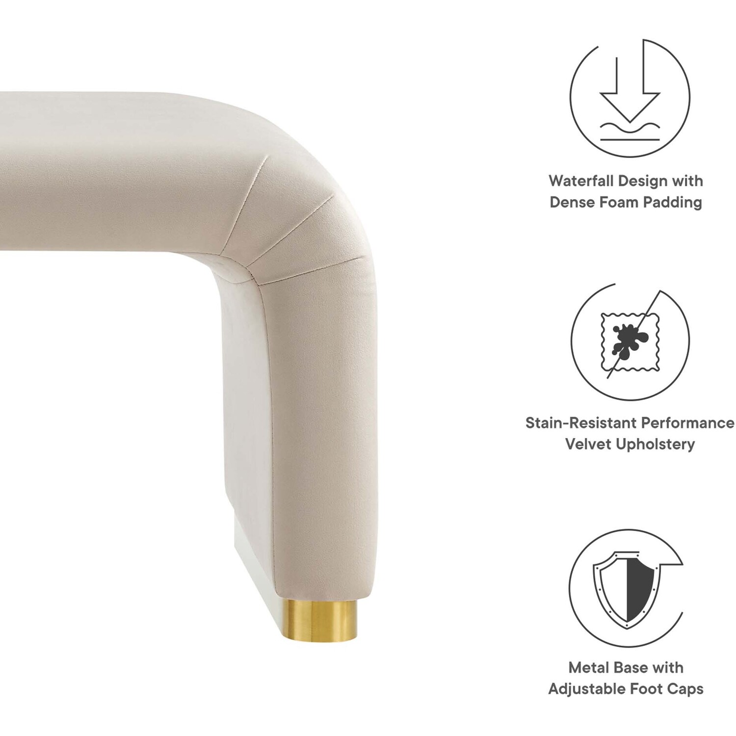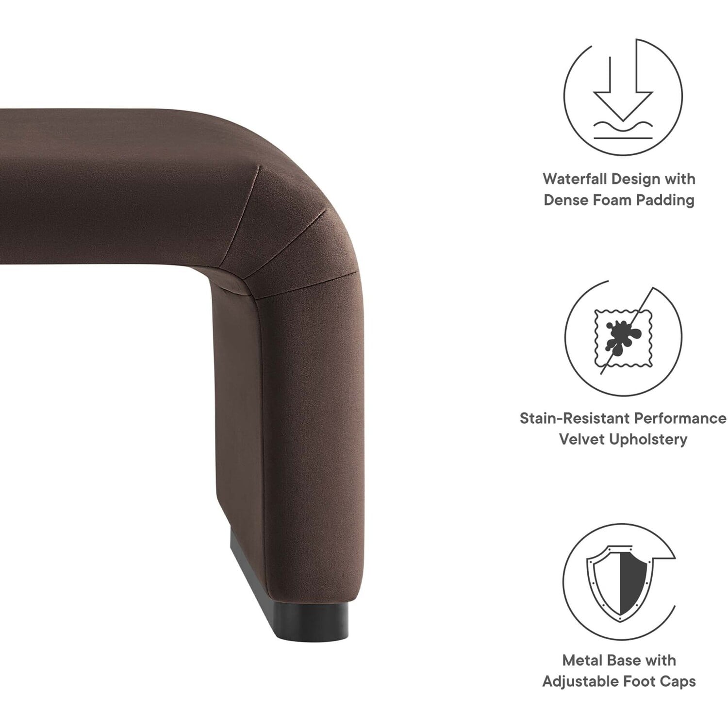 Let the Koda Performance Velvet Ottoman redefine your space with its style and adaptability. Crafted with a sturdy plywood frame, this large ottoman exudes a soft and flowing silhouette. Koda features stain-resistant performance velvet upholstery and a unique waterfall design. This multifunctional piece serves as both a chic ottoman and a fashionable coffee table, effortlessly blending classic design elements with a touch of contemporary allure. The dense foam padding ensures a comfortable experience, whether as extra seating, a footrest, or a stylish surface in your living room or lounge area. The Koda Upholstered Ottoman stands elegantly on a solid metal base with non-marking adjustable foot caps, ensuring stability while protecting your flooring. Assembly Required. Weight Capacity: 662 lbs.Performance Velvet Upholstery