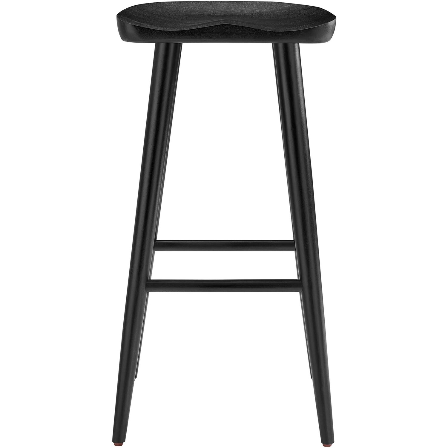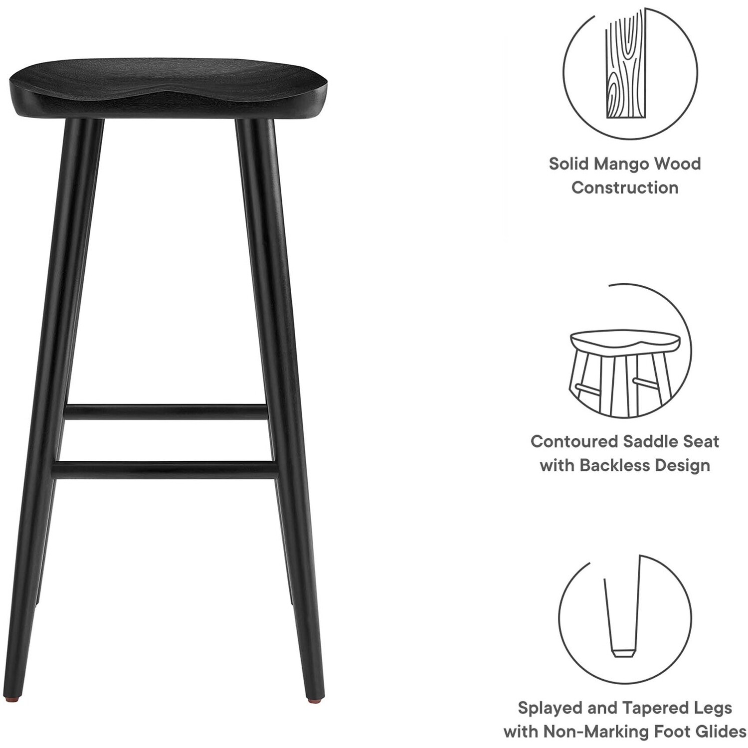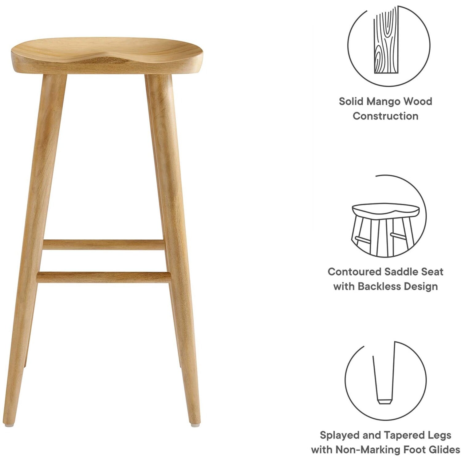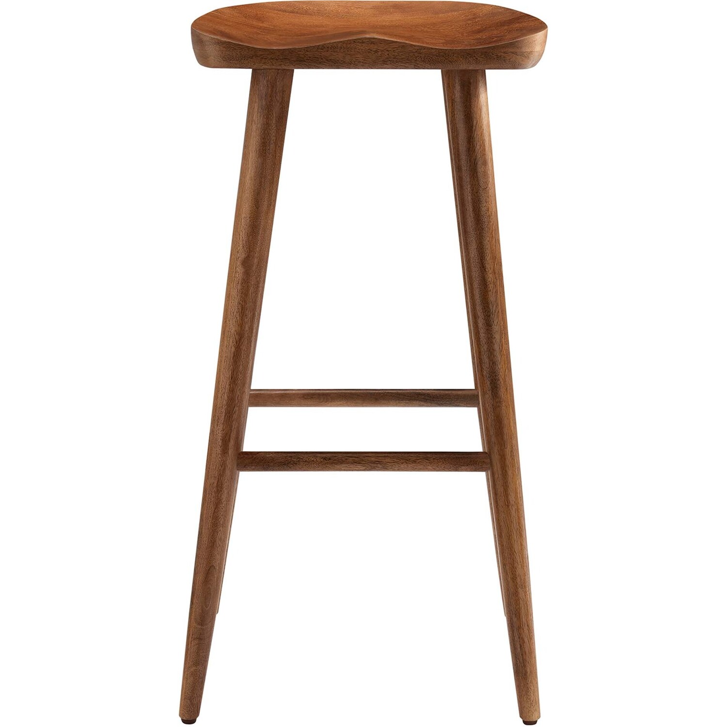 Explore the Saville Bar Stools Set of Two, where minimalist design meets contemporary style, perfect for your home and kitchen. These bar stools are expertly crafted from solid mango wood, offering durability and a natural aesthetic giving them a rustic charm. The contoured saddle seats of these modern backless bar stools provide comfort and a sleek profile, enhancing any kitchen counter or bar setting. Their splayed and tapered legs feature functional stretchers, adding a sophisticated touch. Equipped with adjustable, non-marking foot glides, these natural wood bar stools protect your flooring while ensuring stability. Ideal for modern settings, this saddle stool set is a timeless enhancement to a kitchen island, bar area, or bar-height table. The Saville Bar Stools Set of Two come fully assembled and ready to use. Weight Limit: 200 lbs.Solid Mango Wood Bar Stools