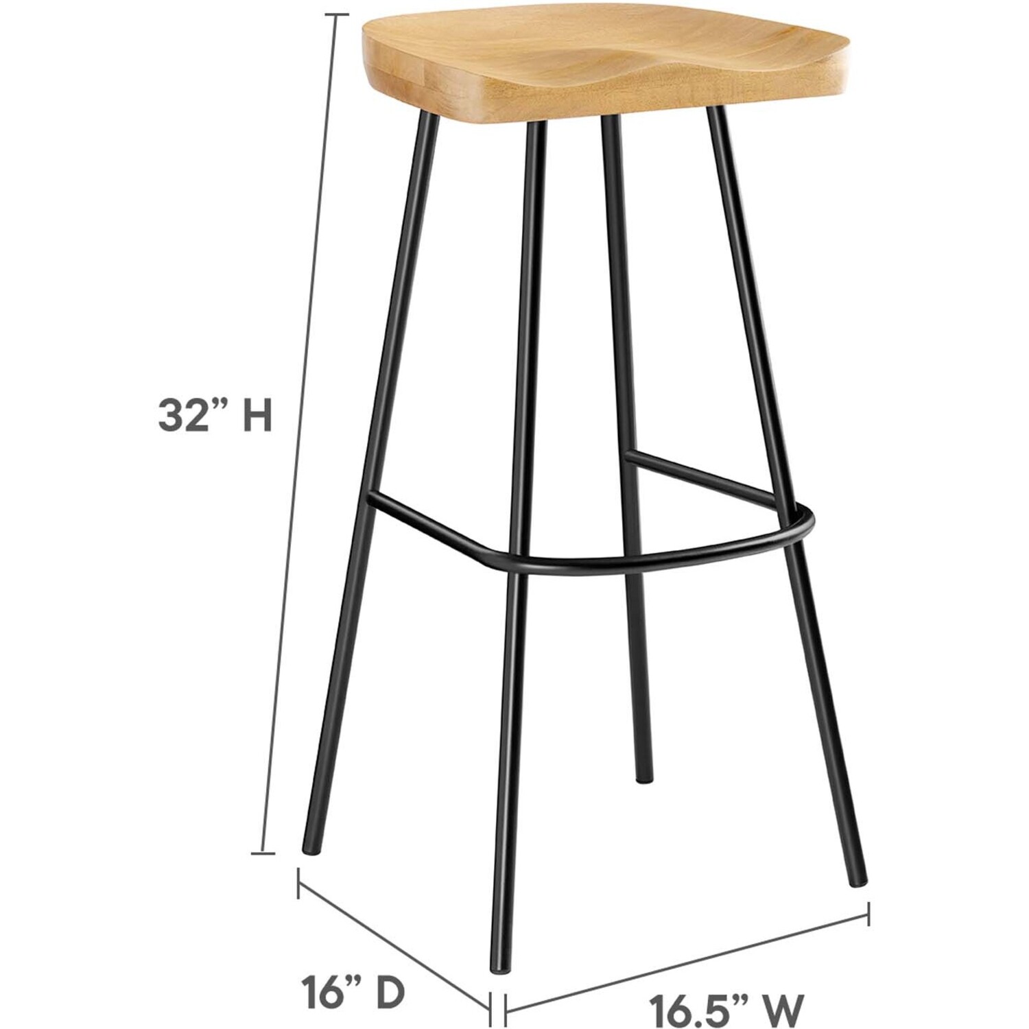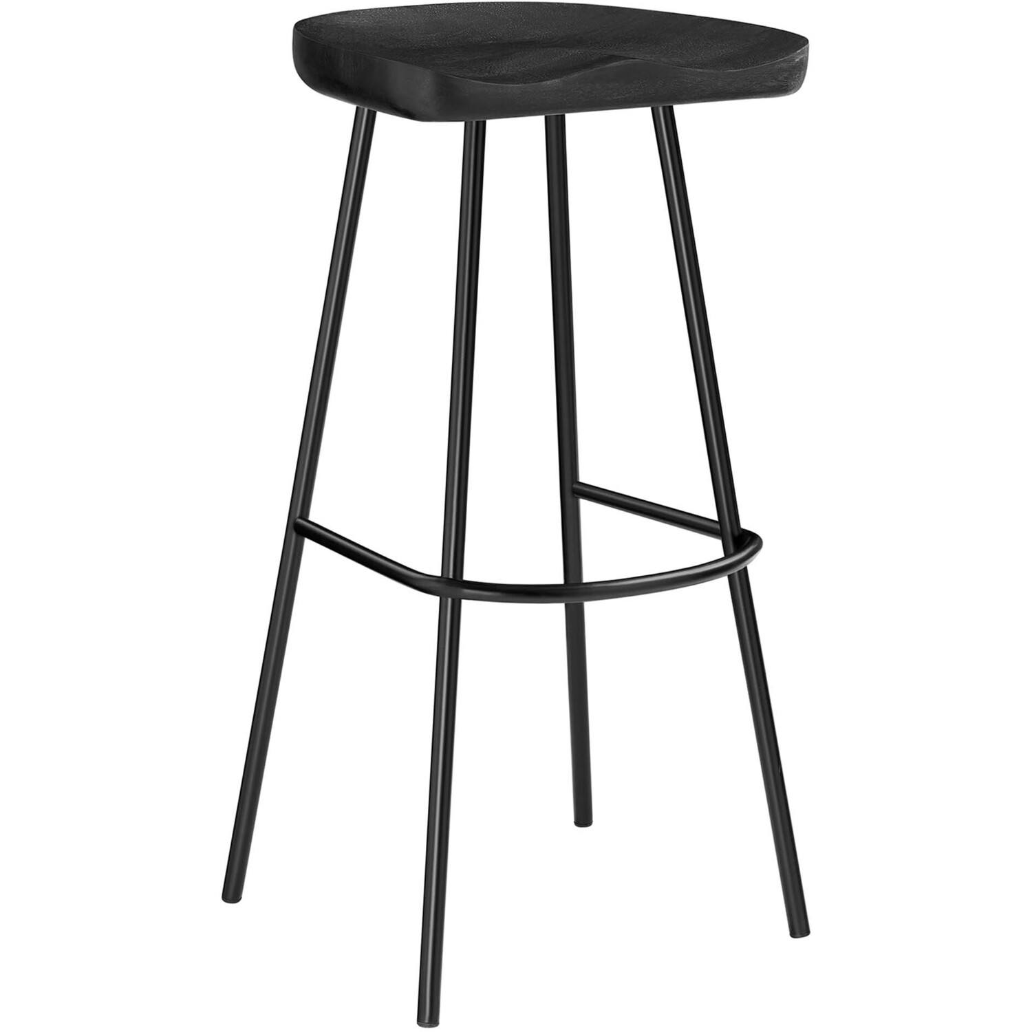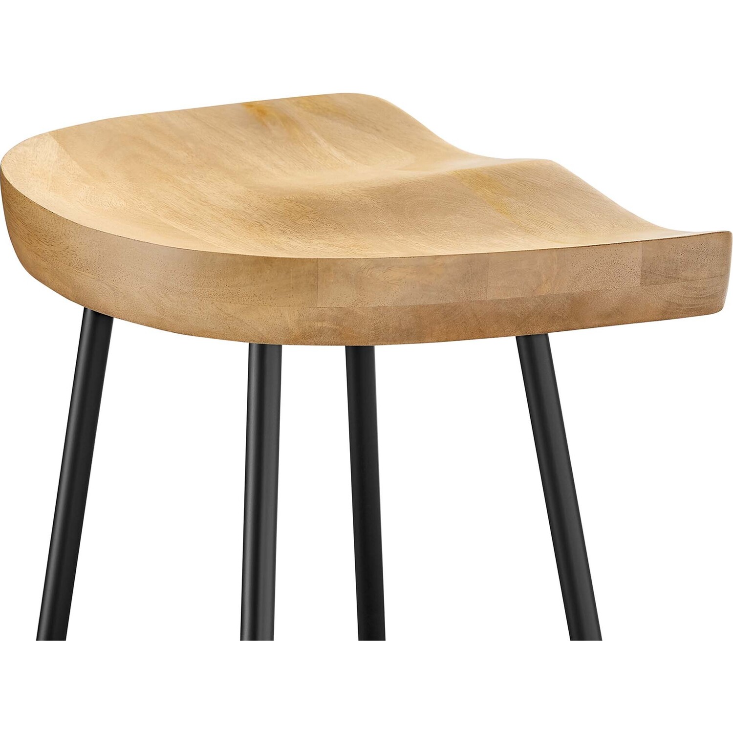 The Concord Bar Stools Set of Two blends minimalist design and chic style, ideal for contemporary homes and kitchens. These stools are made from durable mango wood, which not only ensures longevity but also adds a natural, rustic charm to your home furniture collection. These bar stools are fitted with ergonomically contoured saddle seats, making them not just visually appealing but also comfortable for sitting. The legs of these wood bar stools are crafted from powder-coated metal and are distinctively splayed with a rounded stretcher. This design not only enhances their style and stability but also gives them a trendy, modern bar stool appearance. Featuring adjustable, non-marking foot glides, the Concord Bar Stools not only safeguard your floors but also maintain balance. Perfect for contemporary interiors, these wood stools add natural elegance to your home bar or kitchen counter area. Arriving fully assembled, this set is ready for immediate use. Weight Capacity: 200 lbs.Mango Wood Bar Stools