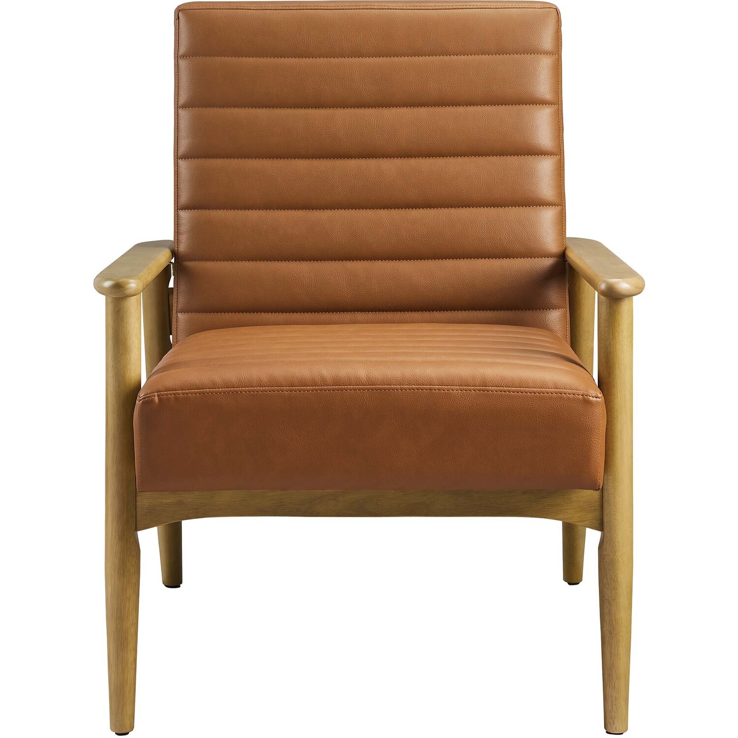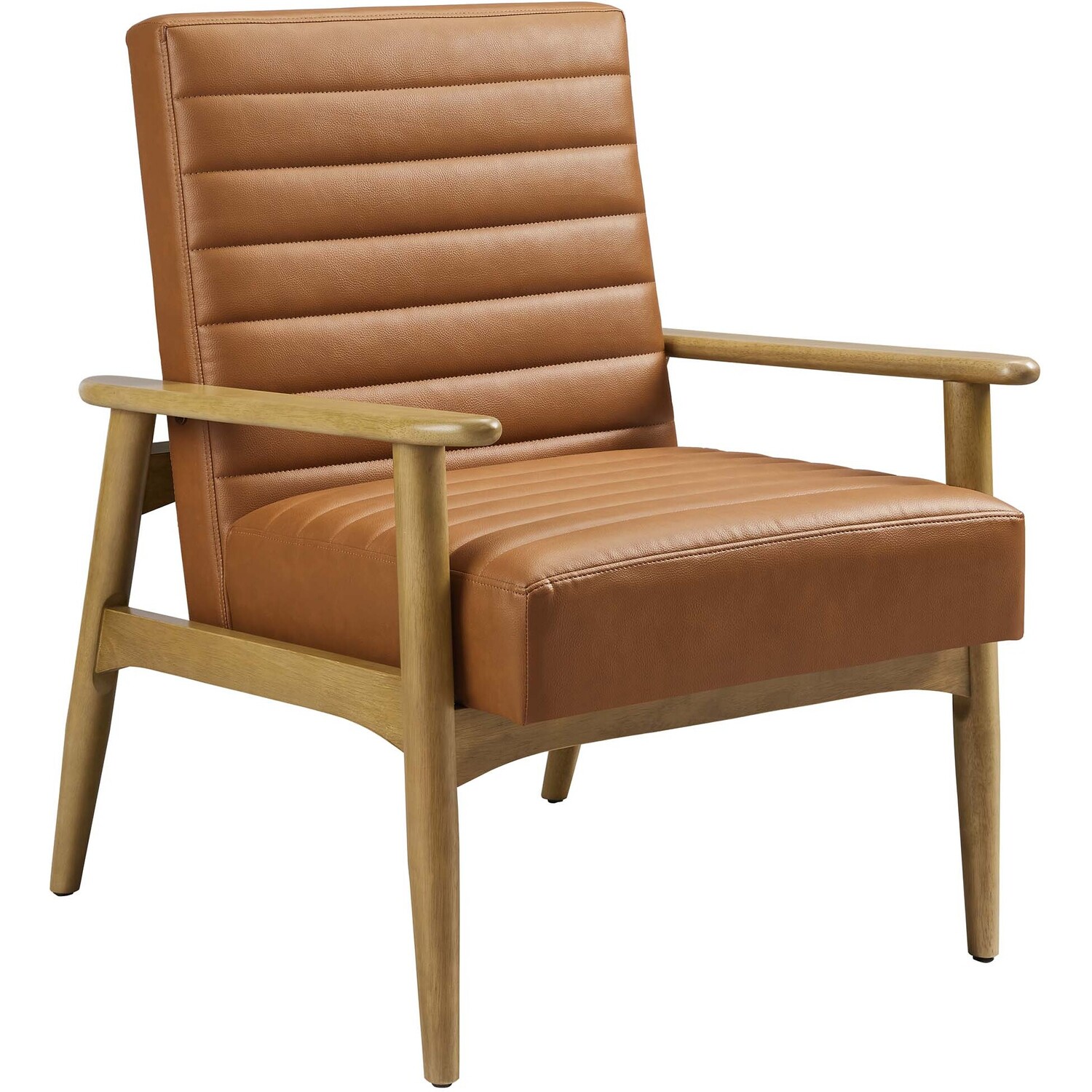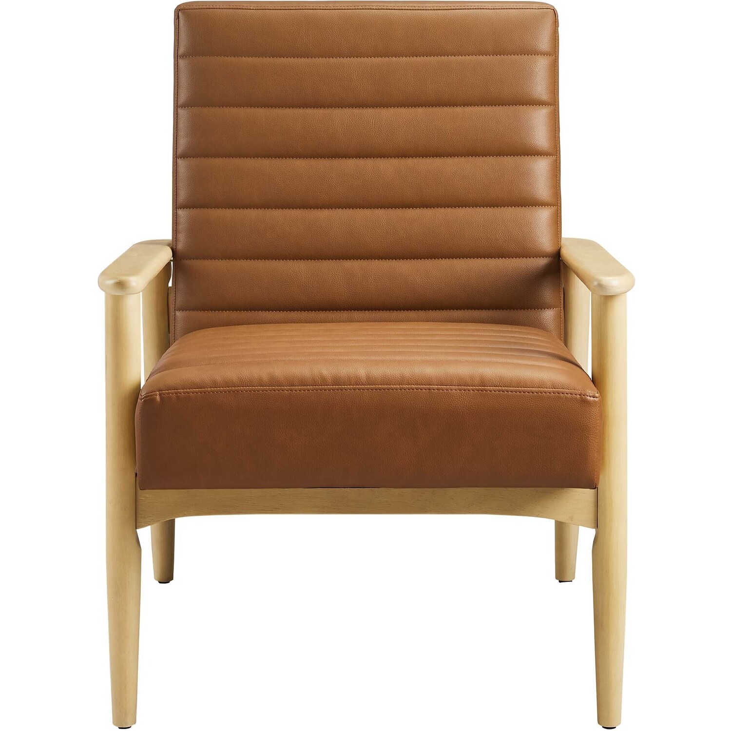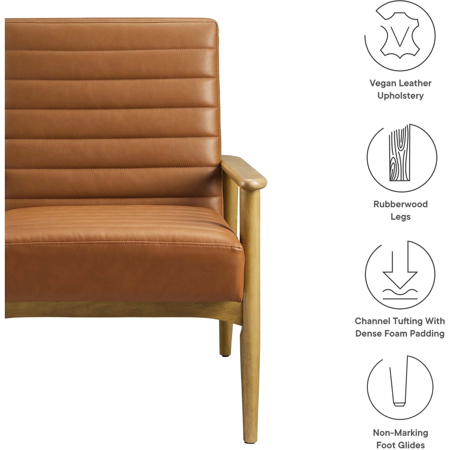 Showcasing modern craftsmanship and chic design, the Jensen Vegan Leather Accent Chair elevates your living space with its elegant contours and contemporary profile. Upholstered in high-quality vegan leather, this modern club chair offers a cost-effective alternative without compromising the plush feel and durability of traditional leather. This faux leather lounge chair is further complemented by luxurious horizontal channel tufting, and dense foam padding that together enhance its visual appeal while providing unparalleled comfort. With a solid rubberwood frame, the Jensen Faux Leather Armchair offers a sturdy base that can withstand the rigors of daily use. Whether used as a reading chair, a cozy corner chair, or even a faux leather office chair, the Jensen Living Room Lounge Chair brings a premium seating experience that accommodates all occasions. Its sleek design suits any decor theme, from modern minimalist to mid-century chic. Includes non-marking foot glides to protect floors. Assembly required. Weight Capacity: 507 lbs.Upholstered Vegan Leather