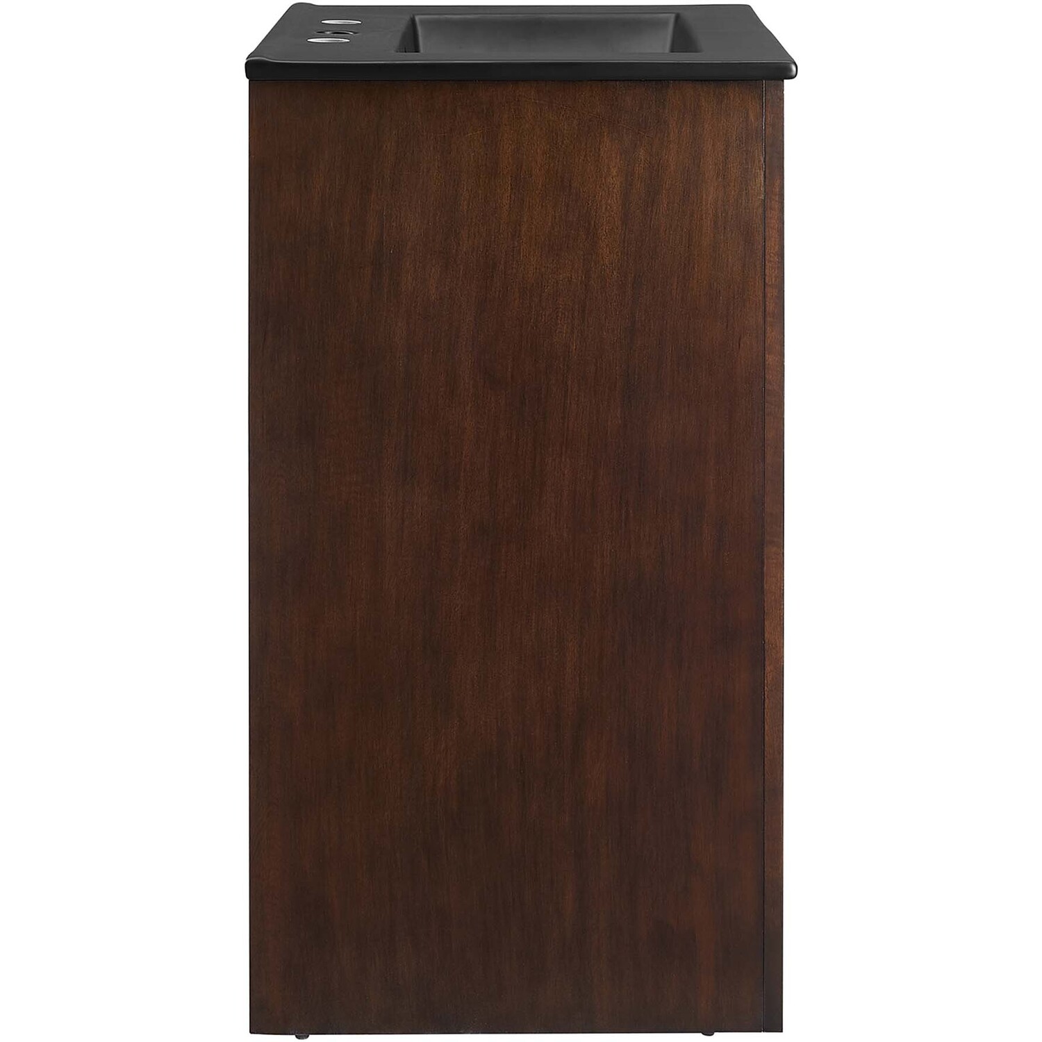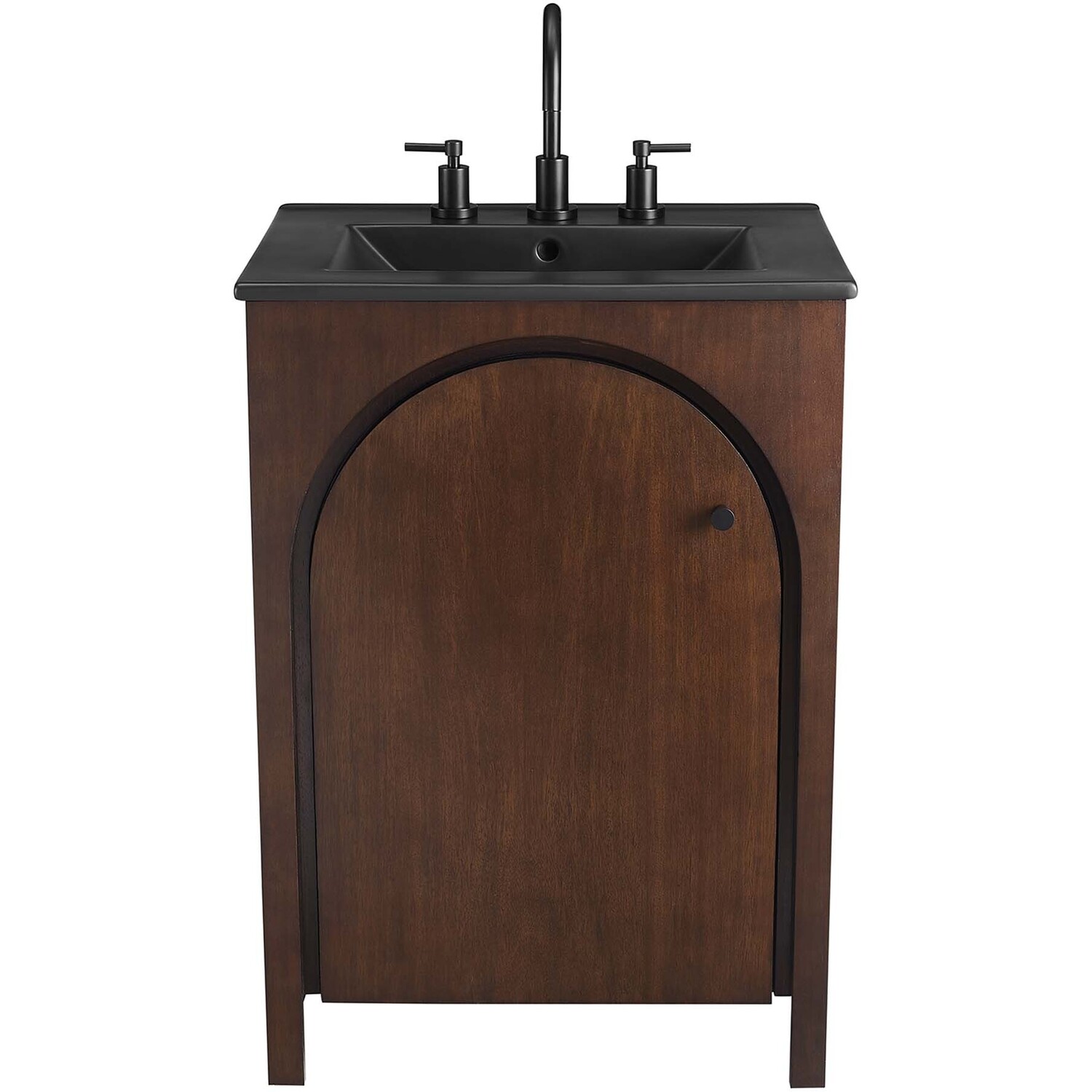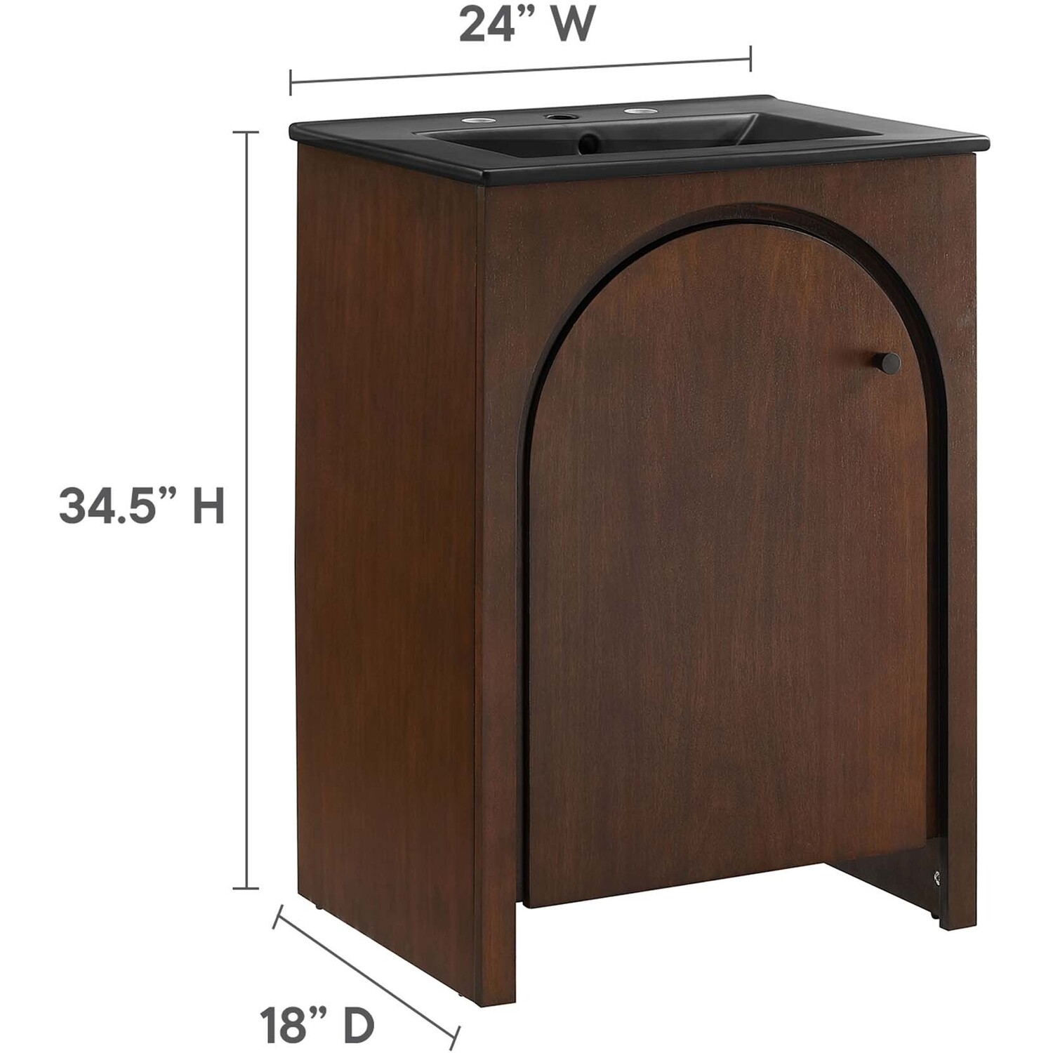 Elevate your bathroom's style with the Appia 24" Single Bathroom Vanity, where retro elegance meets functionality. Expertly crafted from high-quality MDF and adorned with a mango wood veneer, this vanity cabinet brings stunning organic aesthetics to your bathroom. Its unique arched door adds beautiful dimension to any primary or guest bathroom. Featuring soft-close hinges, the Appia compact vanity offers a smooth, quiet experience and includes an adjustable shelf with a convenient plumbing cut-out, providing ample storage for all your small space vanity bathroom essentials. With its black ceramic sink basin with 8" centerset holes and integrated countertop, this sink cabinet easily becomes a functional centerpiece in any bathroom. Assembly is straightforward, ensuring you can enjoy this stylish and modern vanity effortlessly. Includes adjustable non-marking foot pads to protect flooring. Fixtures not included.Soft-Close Hinges