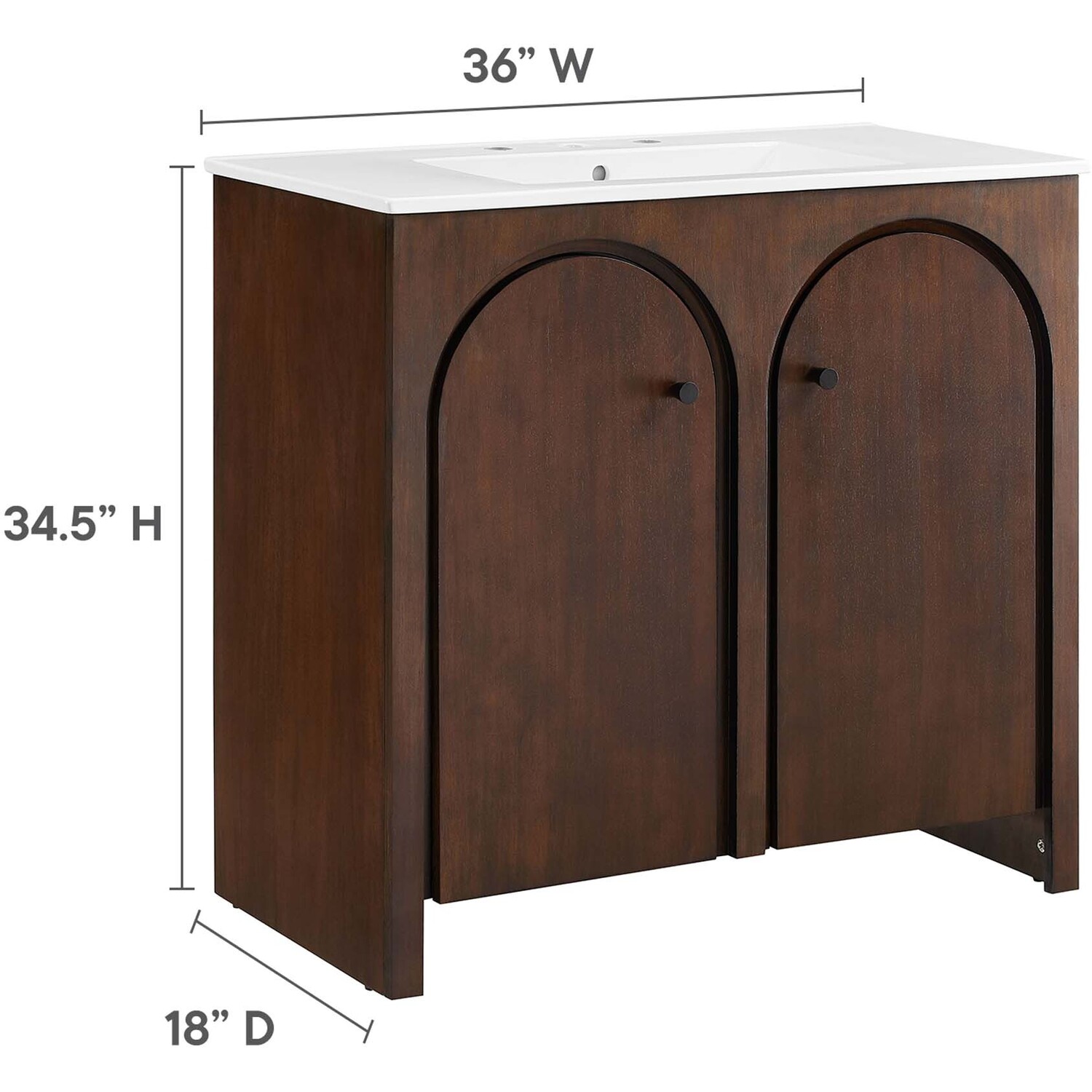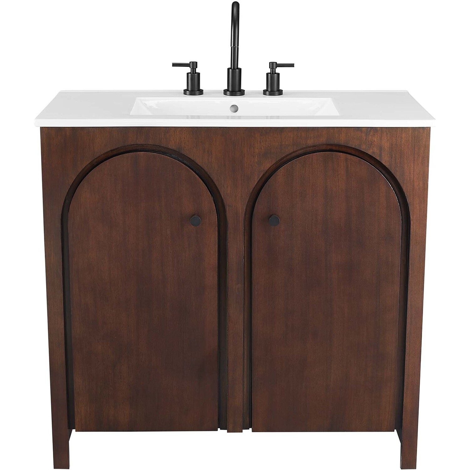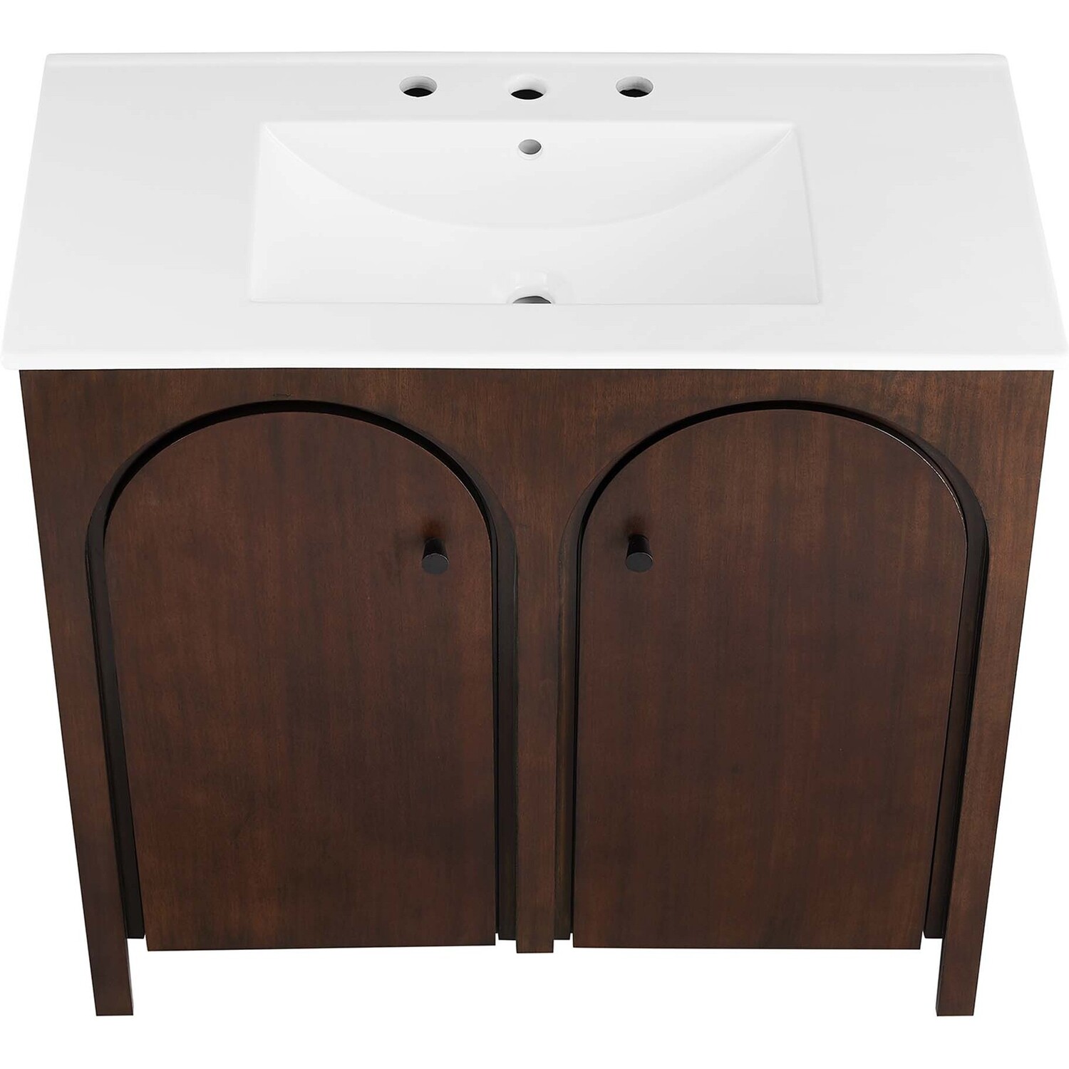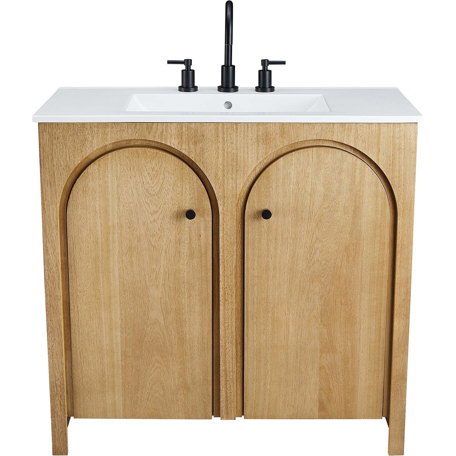 Elevate your bathroom's style with the Appia 36" Single Bathroom Vanity Cabinet, where retro elegance meets functionality. Expertly crafted from high-quality MDF and adorned with a mango wood veneer, this vanity cabinet brings stunning organic aesthetics to your bathroom. Its two arched doors add beautiful dimension to any primary or guest bathroom. Featuring soft-close hinges, the Appia sink vanity offers a smooth, quiet experience and includes an adjustable shelf with a convenient plumbing cut-out, providing ample storage for all your vanity bathroom essentials. With its white ceramic sink basin with 8" centerset holes and integrated countertop, this sink cabinet easily becomes a functional centerpiece in any bathroom. Assembly is straightforward, ensuring you can enjoy this stylish and modern vanity effortlessly. Includes adjustable non-marking foot pads to protect flooring. Fixtures not included.Soft-Close Hinges