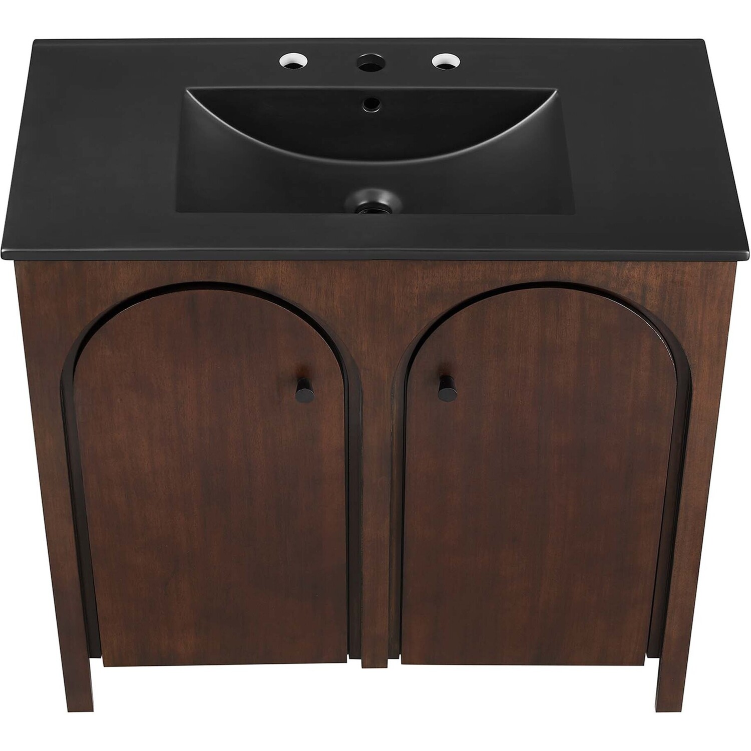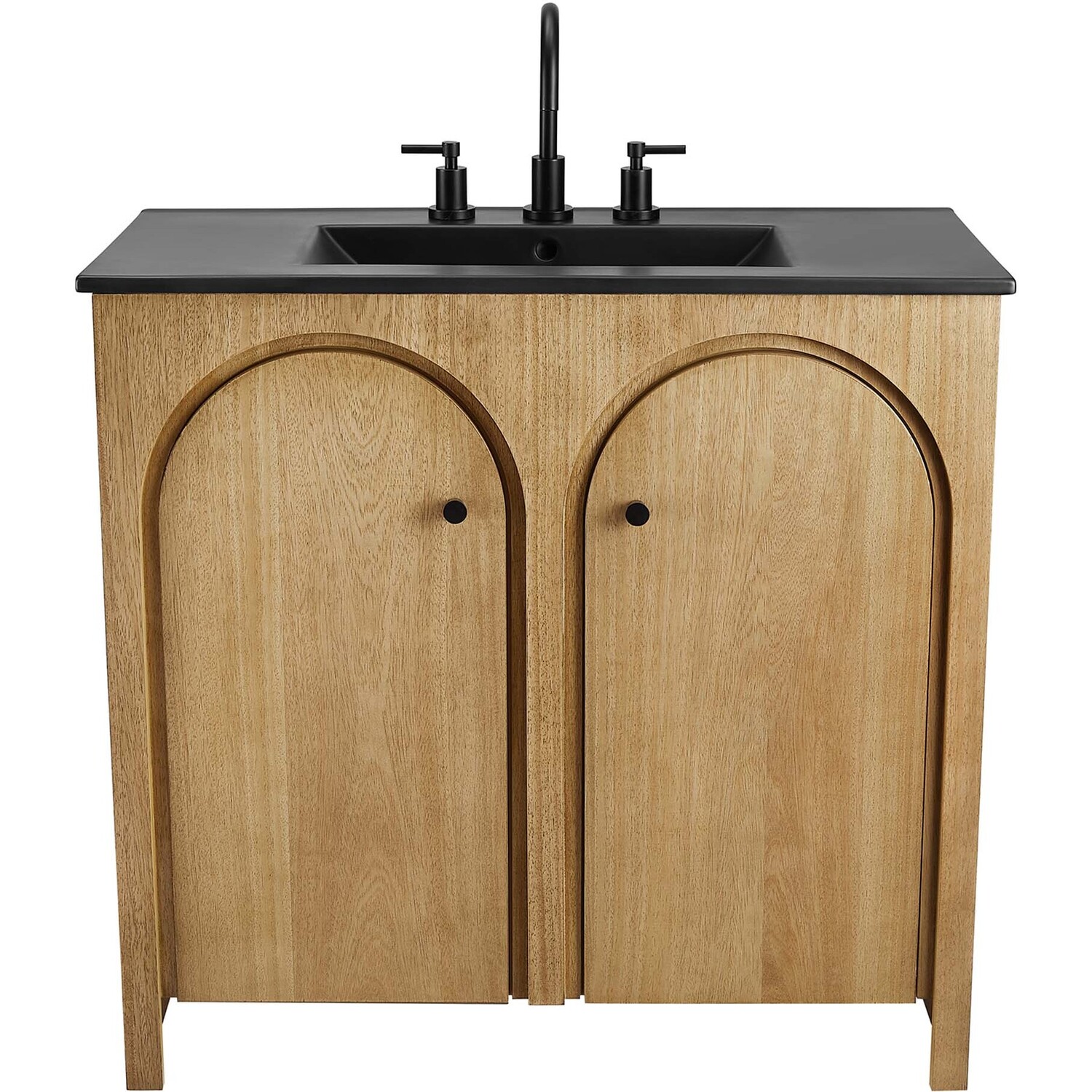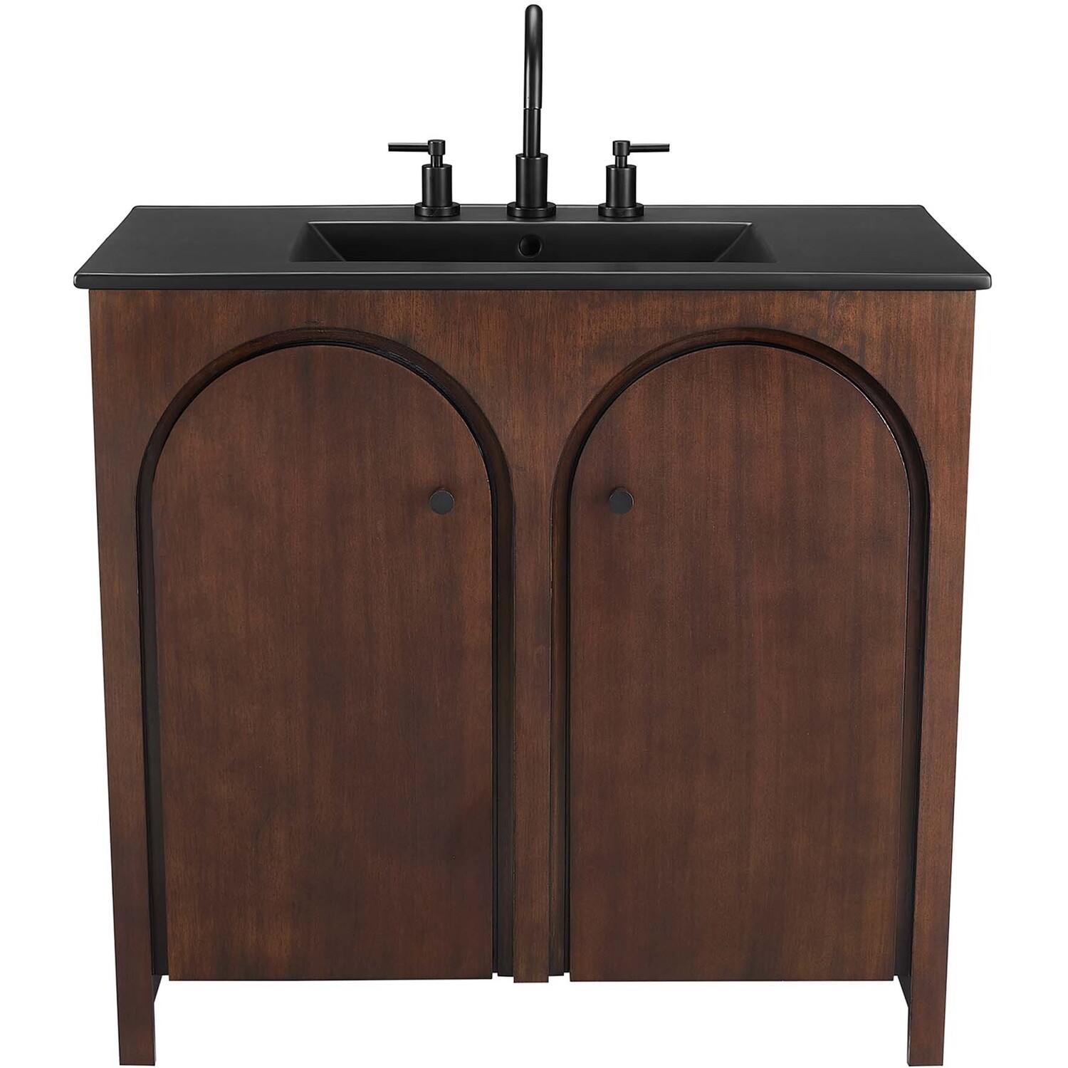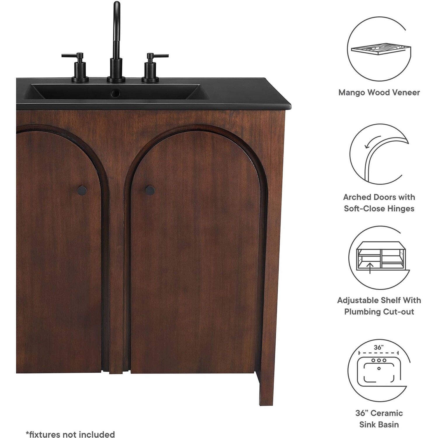 Elevate your bathroom's style with the Appia 36" Single Bathroom Vanity Cabinet, where retro elegance meets functionality. Expertly crafted from high-quality MDF and adorned with a mango wood veneer, this vanity cabinet brings stunning organic aesthetics to your bathroom. Its two arched doors add beautiful dimension to any primary or guest bathroom. Featuring soft-close hinges, the Appia sink vanity offers a smooth, quiet experience and includes an adjustable shelf with a convenient plumbing cut-out, providing ample storage for all your vanity bathroom essentials. With its black ceramic sink basin with 8" centerset holes and integrated countertop, this sink cabinet easily becomes a functional centerpiece in any bathroom. Assembly is straightforward, ensuring you can enjoy this stylish and modern vanity effortlessly. Includes adjustable non-marking foot pads to protect flooring. Fixtures not included.Soft-Close Hinges