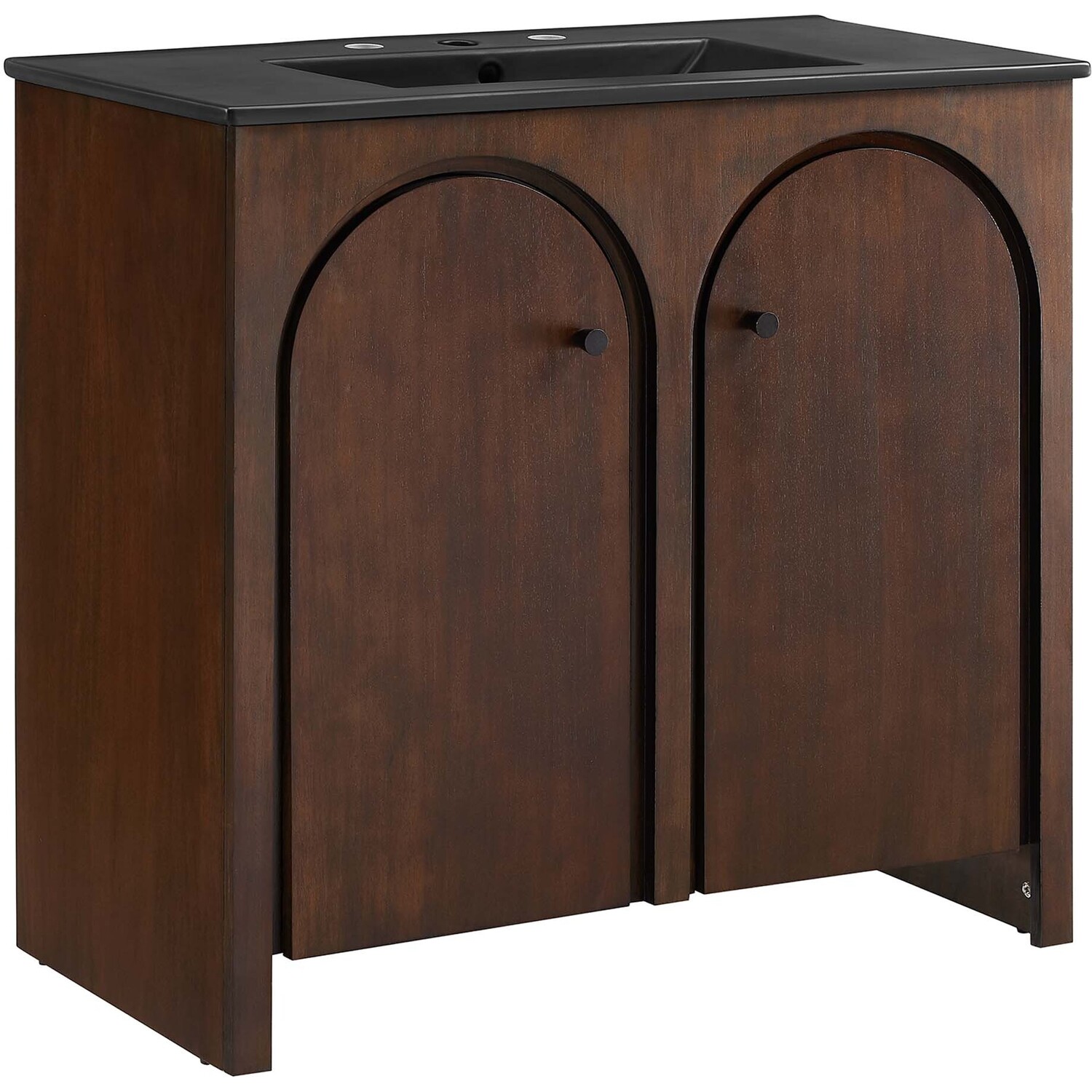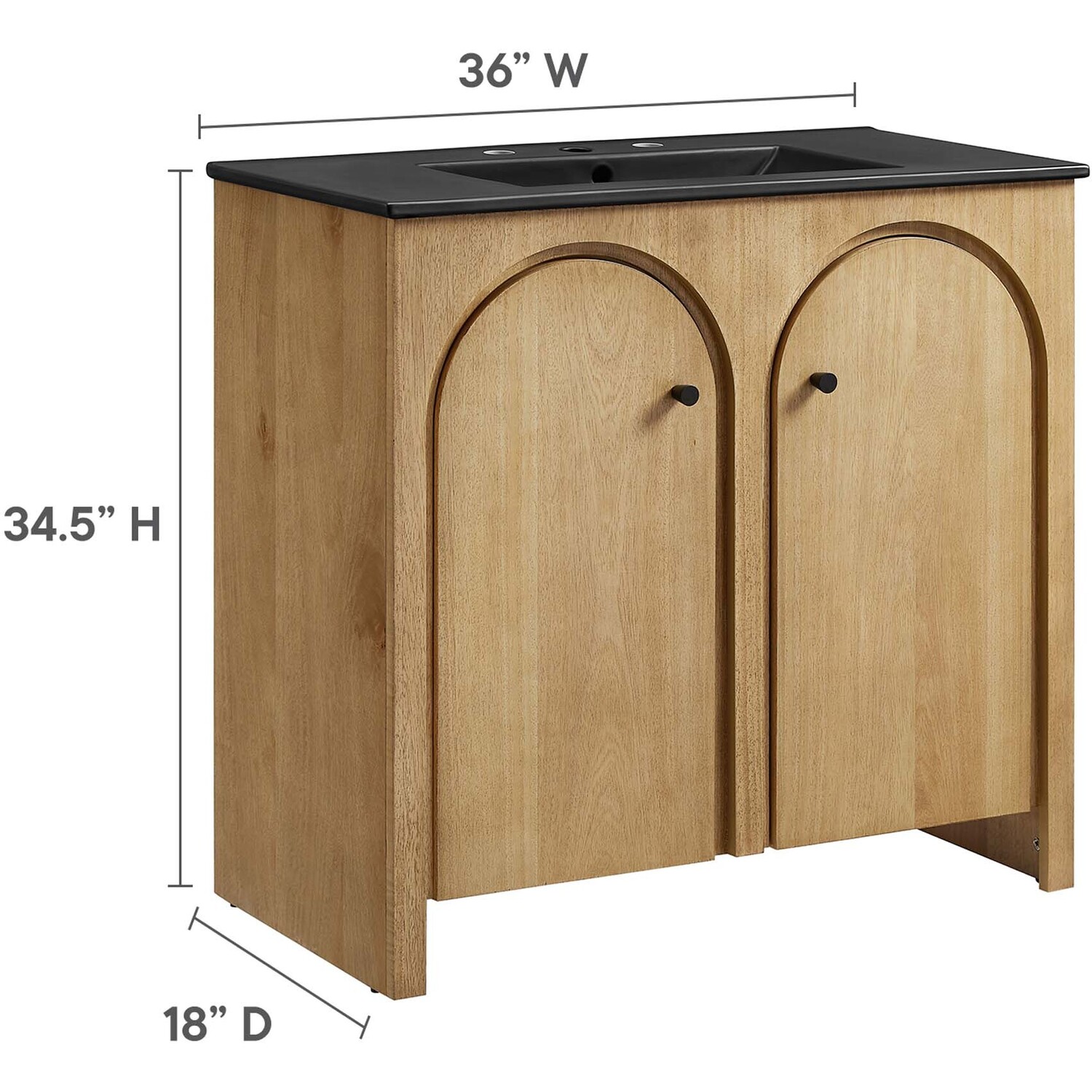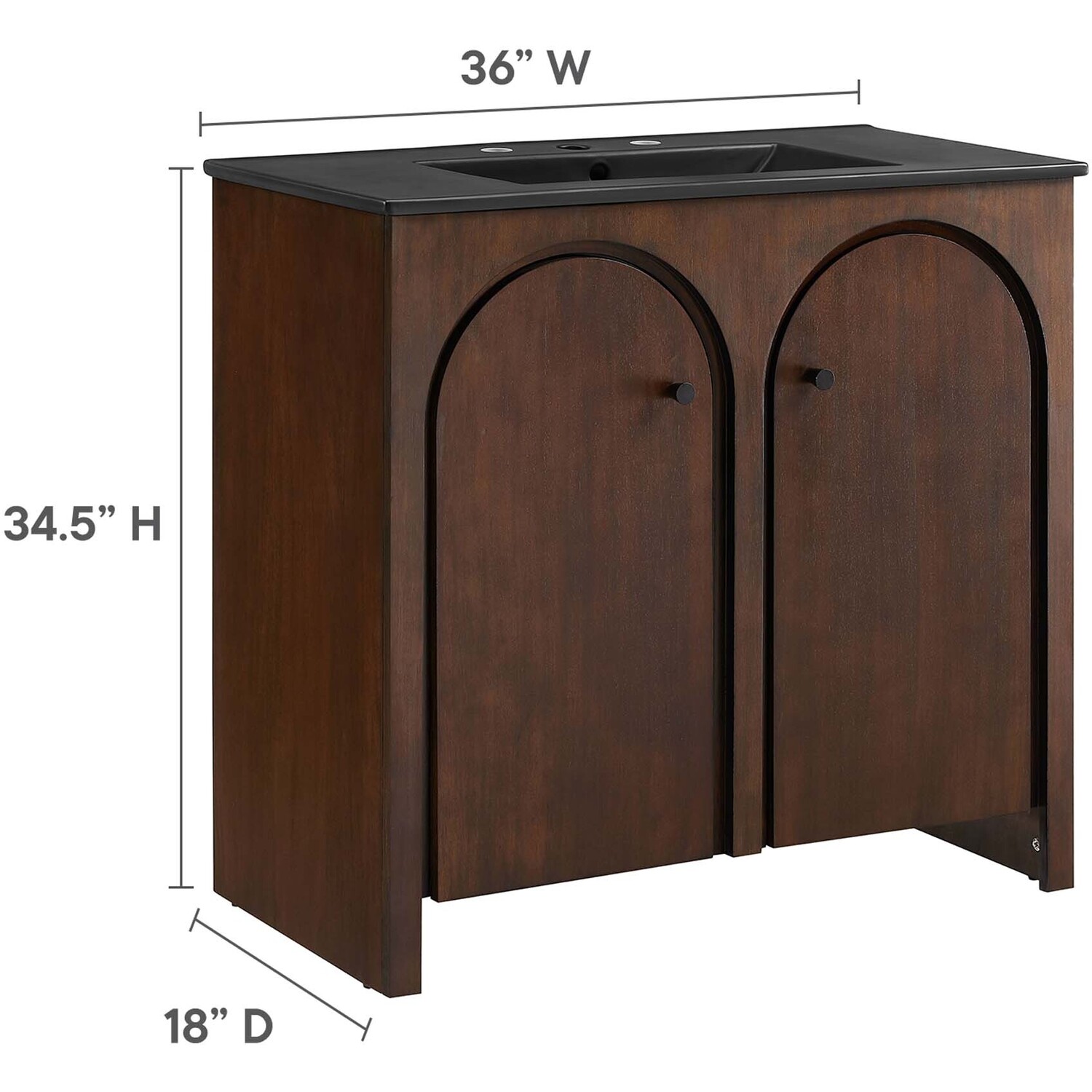 Elevate your bathroom's style with the Appia 36" Single Bathroom Vanity Cabinet, where retro elegance meets functionality. Expertly crafted from high-quality MDF and adorned with a mango wood veneer, this vanity cabinet brings stunning organic aesthetics to your bathroom. Its two arched doors add beautiful dimension to any primary or guest bathroom. Featuring soft-close hinges, the Appia sink vanity offers a smooth, quiet experience and includes an adjustable shelf with a convenient plumbing cut-out, providing ample storage for all your vanity bathroom essentials. With its black ceramic sink basin with 8" centerset holes and integrated countertop, this sink cabinet easily becomes a functional centerpiece in any bathroom. Assembly is straightforward, ensuring you can enjoy this stylish and modern vanity effortlessly. Includes adjustable non-marking foot pads to protect flooring. Fixtures not included.Soft-Close Hinges