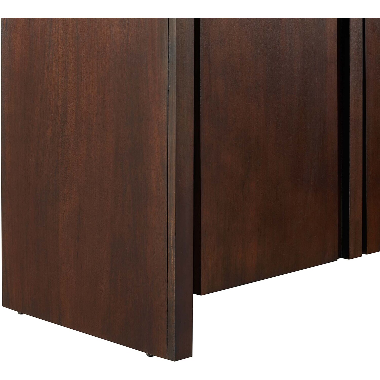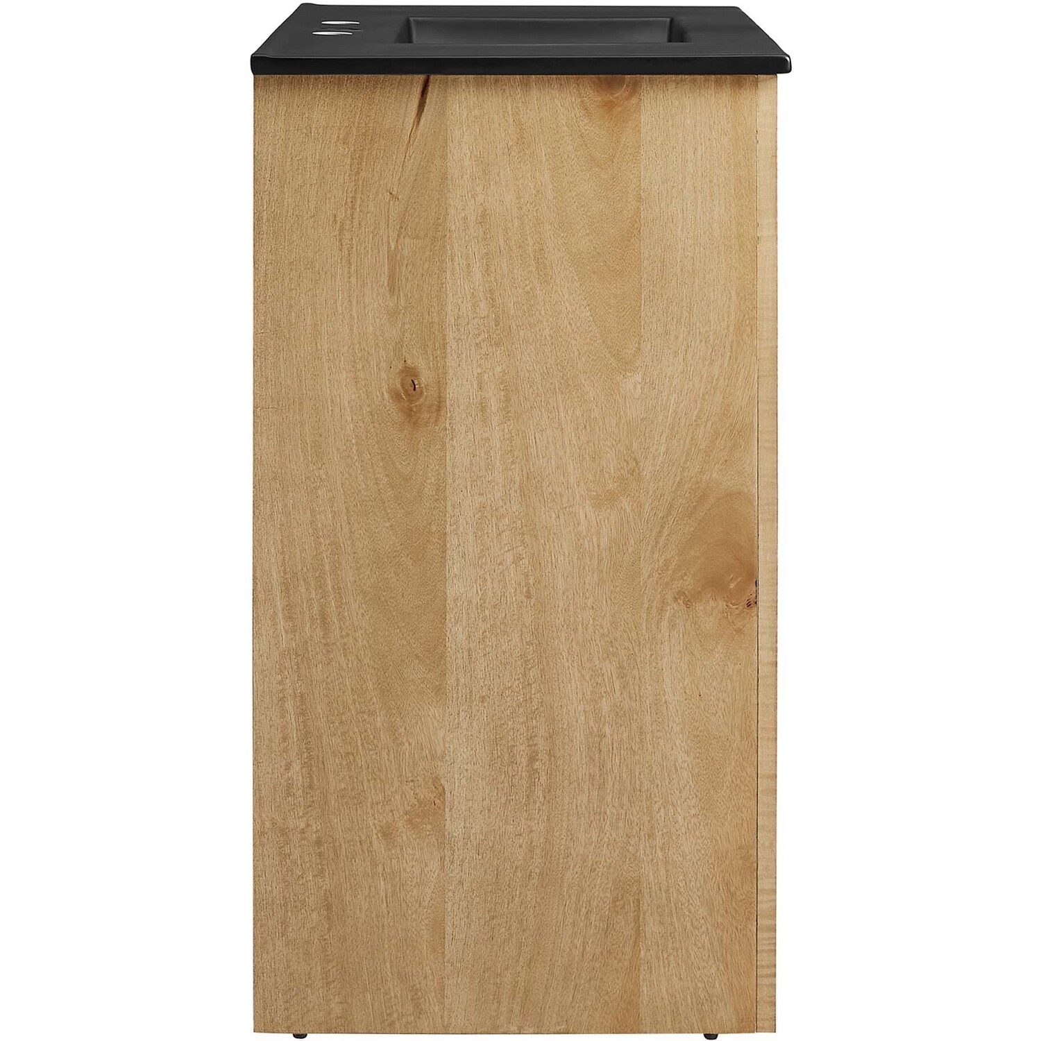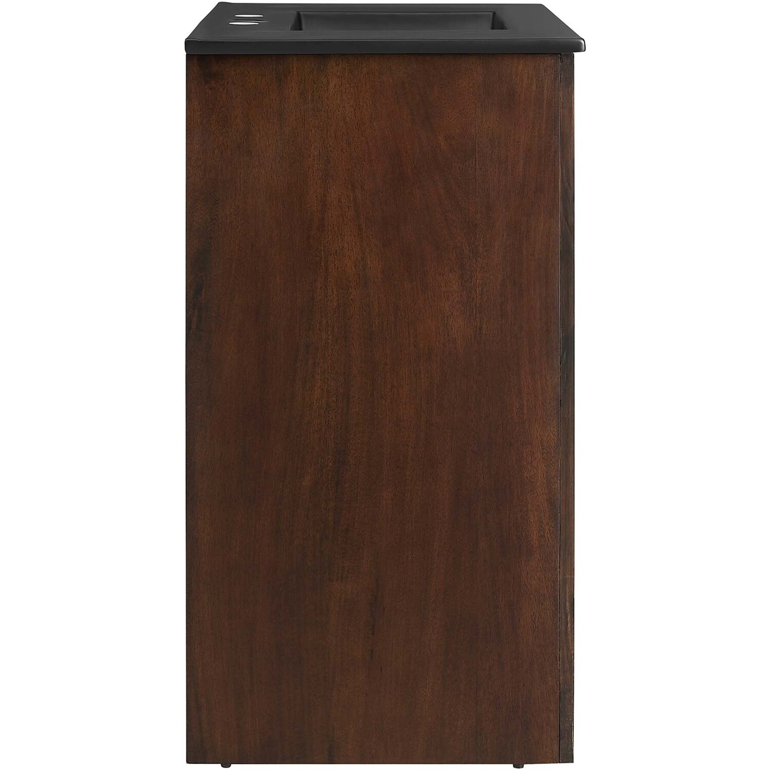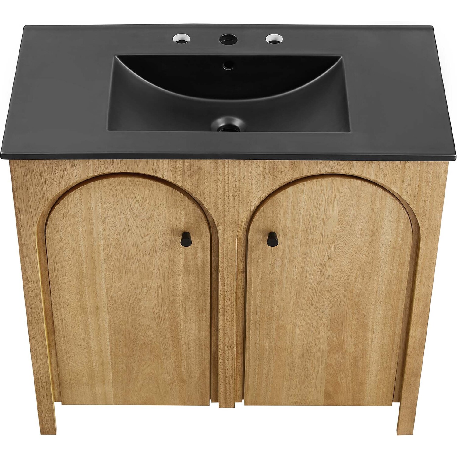 Elevate your bathroom's style with the Appia 36" Single Bathroom Vanity Cabinet, where retro elegance meets functionality. Expertly crafted from high-quality MDF and adorned with a mango wood veneer, this vanity cabinet brings stunning organic aesthetics to your bathroom. Its two arched doors add beautiful dimension to any primary or guest bathroom. Featuring soft-close hinges, the Appia sink vanity offers a smooth, quiet experience and includes an adjustable shelf with a convenient plumbing cut-out, providing ample storage for all your vanity bathroom essentials. With its black ceramic sink basin with 8" centerset holes and integrated countertop, this sink cabinet easily becomes a functional centerpiece in any bathroom. Assembly is straightforward, ensuring you can enjoy this stylish and modern vanity effortlessly. Includes adjustable non-marking foot pads to protect flooring. Fixtures not included.Soft-Close Hinges
