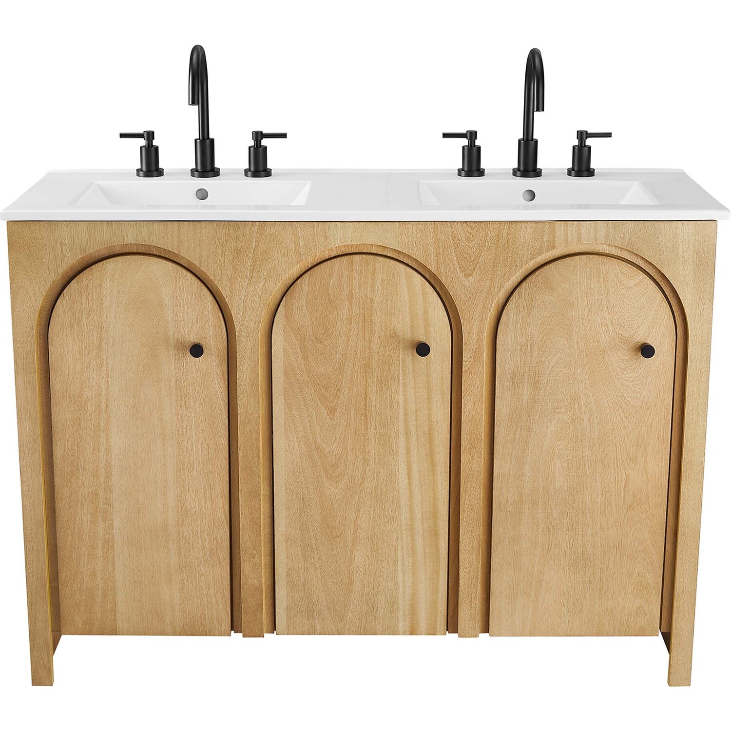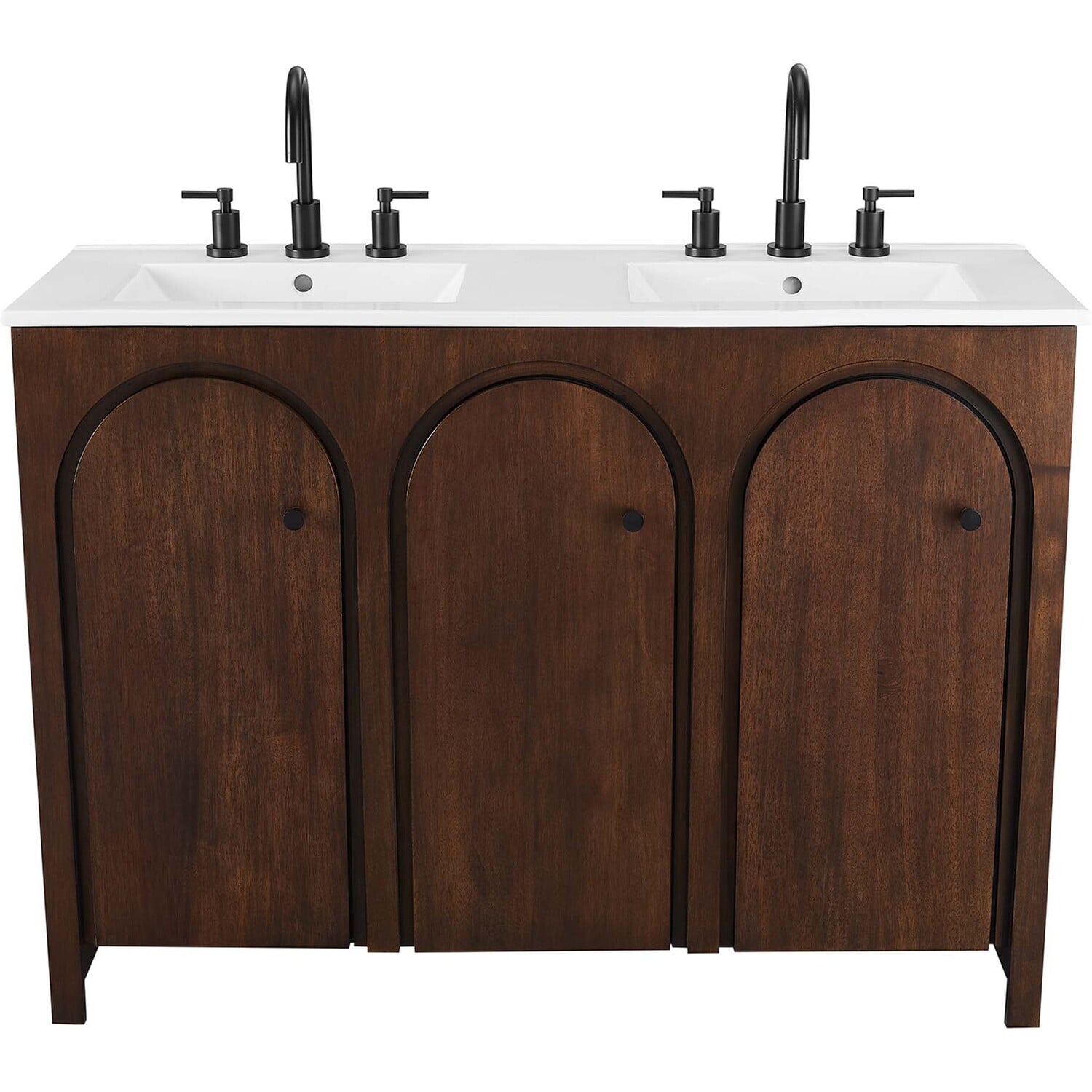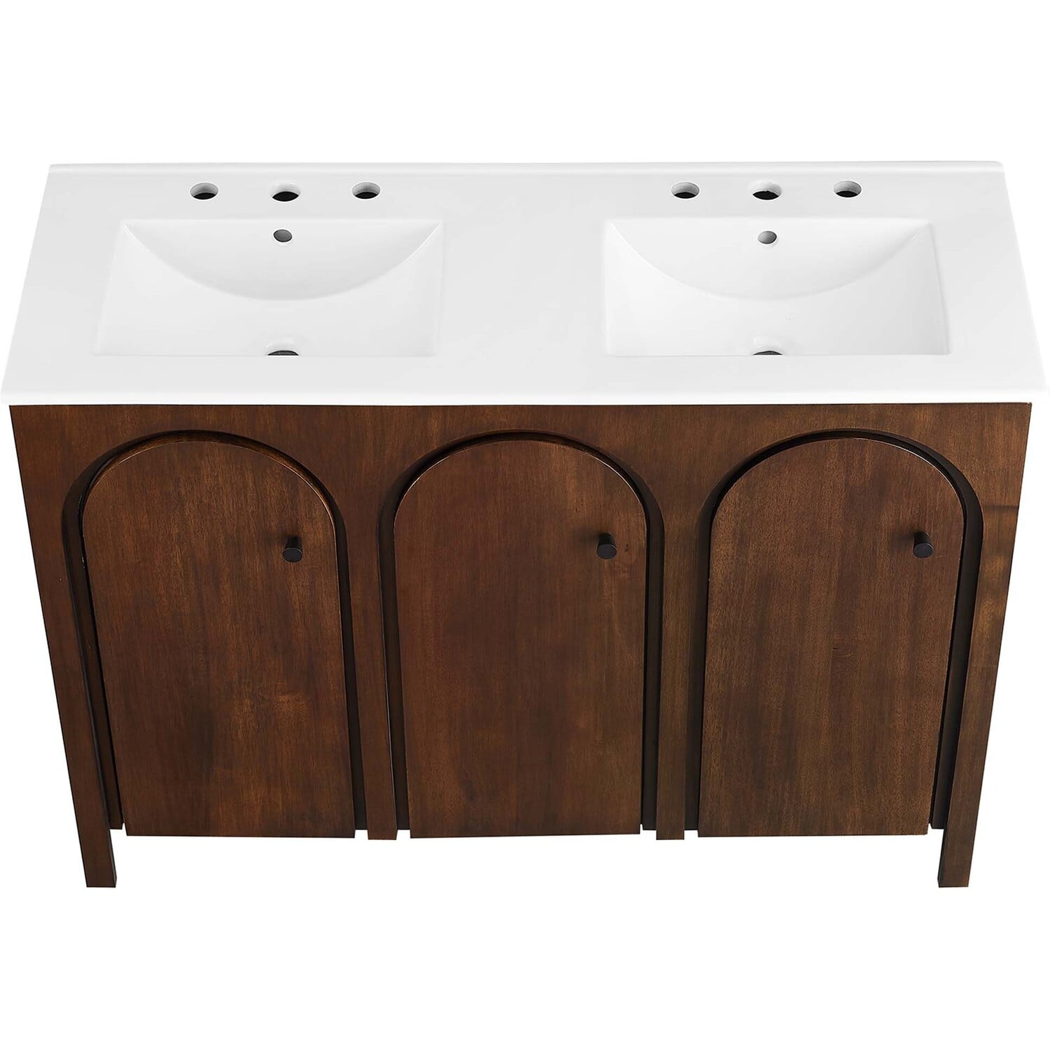 Elevate your bathroom's style with the Appia 48” Double Bathroom Vanity Cabinet, where retro elegance meets functionality. Expertly crafted from high-quality MDF and adorned with a mango wood veneer, this vanity cabinet brings stunning organic aesthetics to your bathroom furniture collection. Its three arched doors add beautiful dimension to any primary or guest bathroom. Featuring soft-close hinges, the Appia two sink vanity offers a smooth, quiet experience and includes adjustable shelves with convenient plumbing cut-outs, providing ample storage for all your vanity bathroom essentials. With its white double ceramic sink basin with 8" centerset holes and integrated countertop, this double sink vanity is a great choice for couples, and easily becomes a functional centerpiece in any bathroom. Assembly is straightforward, ensuring you can enjoy this stylish and modern vanity effortlessly. Includes adjustable non-marking foot pads to protect flooring. Fixtures not included.Soft-Close Hinges