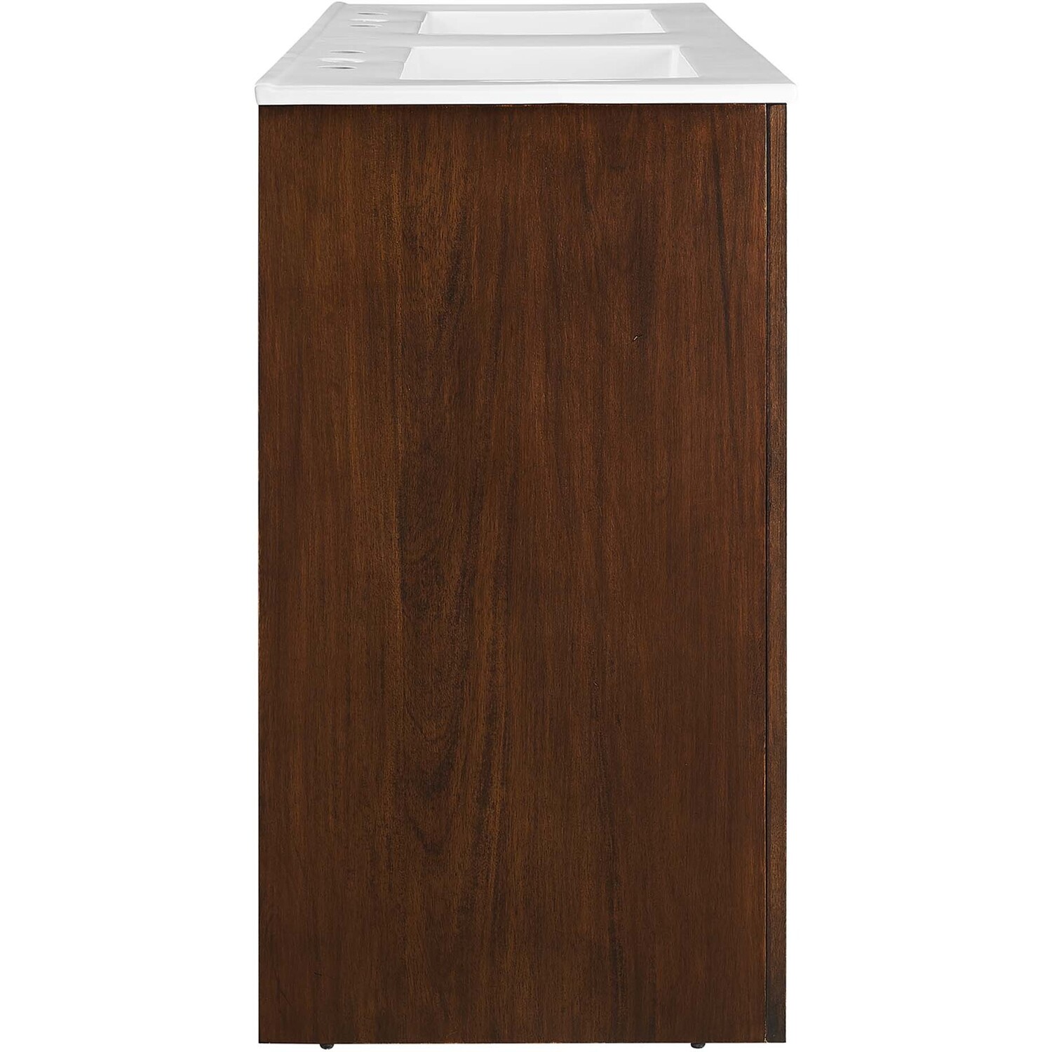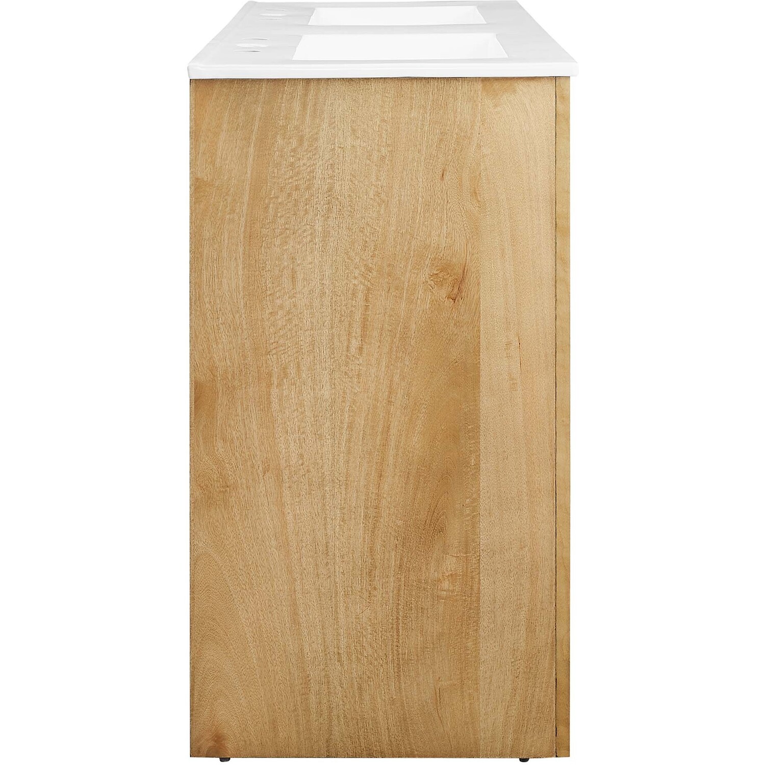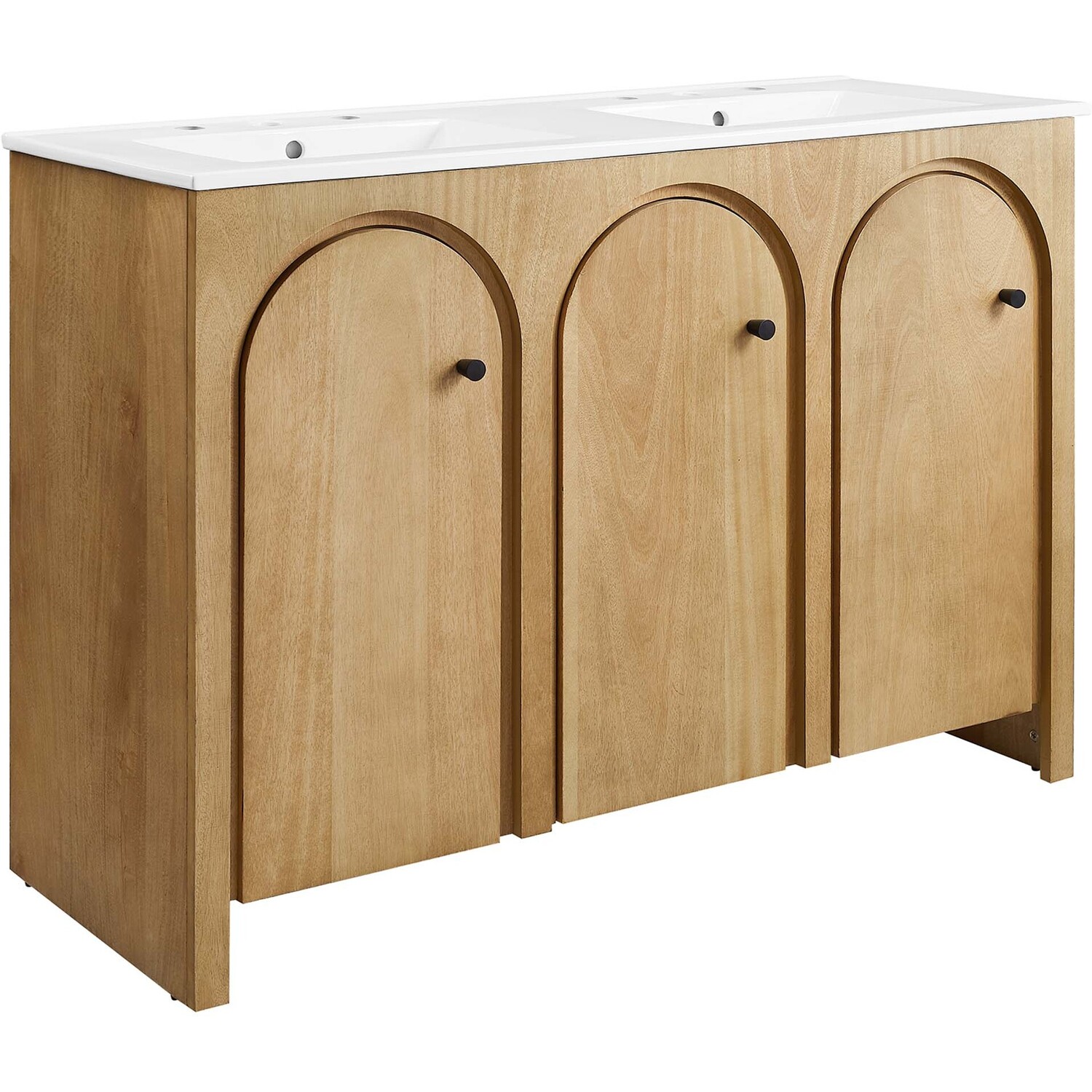 Elevate your bathroom's style with the Appia 48” Double Bathroom Vanity Cabinet, where retro elegance meets functionality. Expertly crafted from high-quality MDF and adorned with a mango wood veneer, this vanity cabinet brings stunning organic aesthetics to your bathroom furniture collection. Its three arched doors add beautiful dimension to any primary or guest bathroom. Featuring soft-close hinges, the Appia two sink vanity offers a smooth, quiet experience and includes adjustable shelves with convenient plumbing cut-outs, providing ample storage for all your vanity bathroom essentials. With its white double ceramic sink basin with 8" centerset holes and integrated countertop, this double sink vanity is a great choice for couples, and easily becomes a functional centerpiece in any bathroom. Assembly is straightforward, ensuring you can enjoy this stylish and modern vanity effortlessly. Includes adjustable non-marking foot pads to protect flooring. Fixtures not included.Soft-Close Hinges