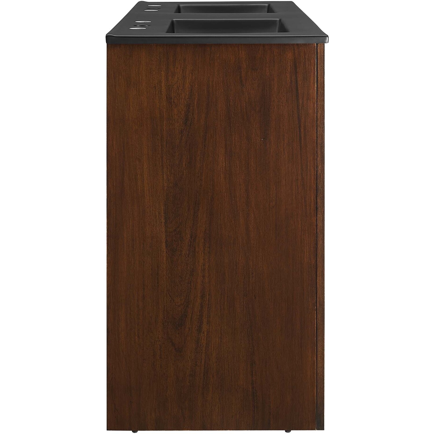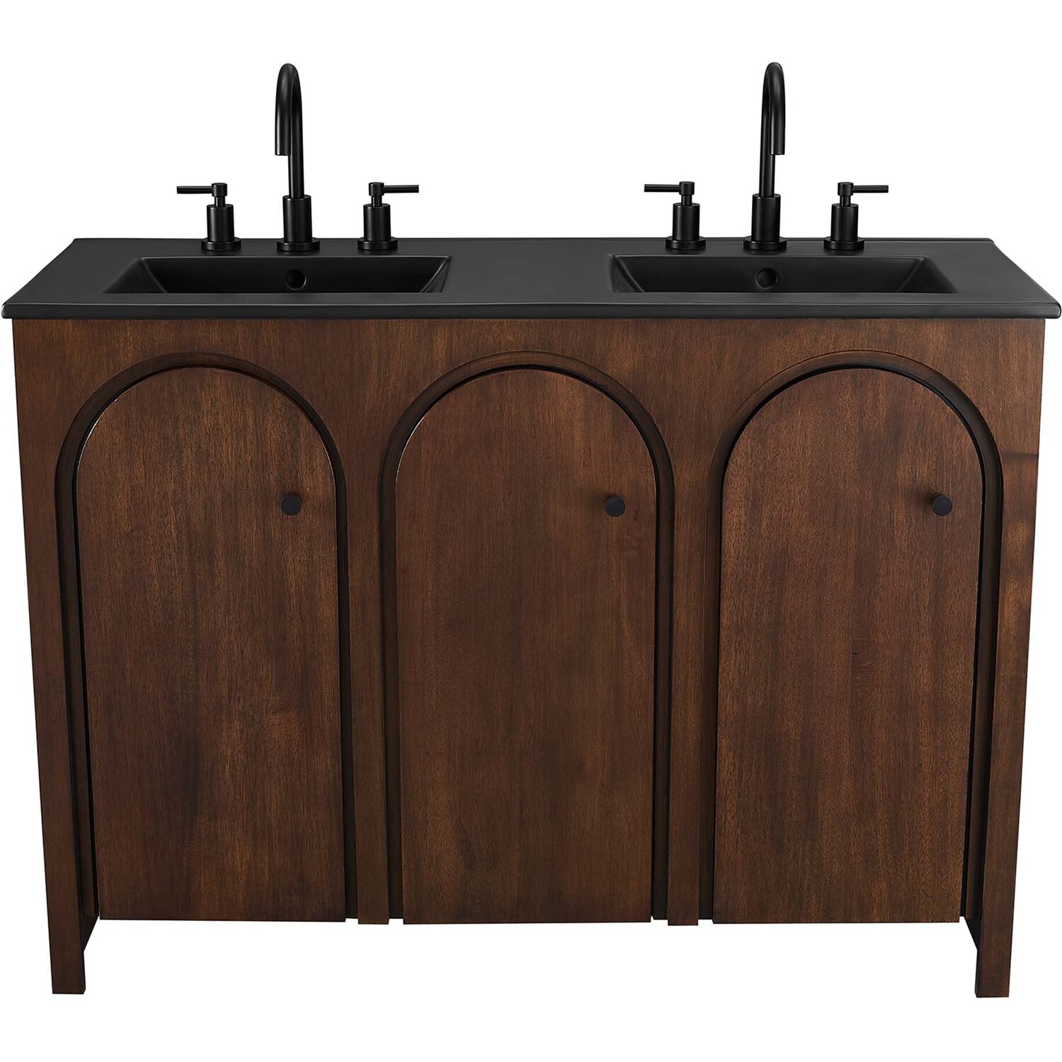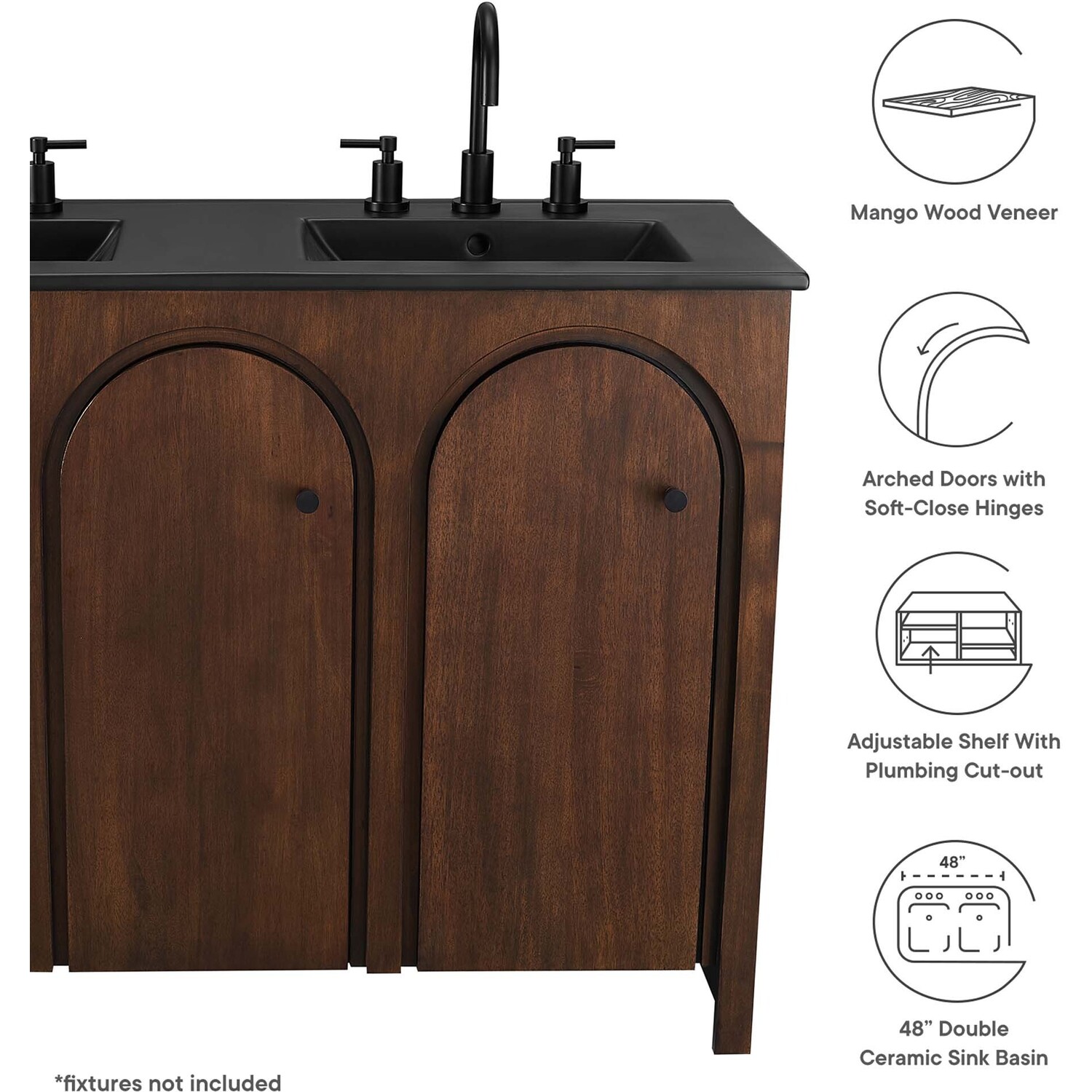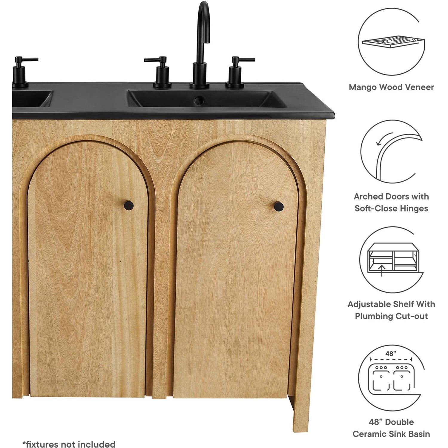Elevate your bathroom's style with the Appia 48” Double Bathroom Vanity Cabinet, where retro elegance meets functionality. Expertly crafted from high-quality MDF and adorned with a mango wood veneer, this vanity cabinet brings stunning organic aesthetics to your bathroom furniture collection. Its three arched doors add beautiful dimension to any primary or guest bathroom. Featuring soft-close hinges, the Appia two sink vanity offers a smooth, quiet experience and includes adjustable shelves with convenient plumbing cut-outs, providing ample storage for all your vanity bathroom essentials. With its black double ceramic sink basin with 8" centerset holes and integrated countertop, this double sink vanity is a great choice for couples, and easily becomes a functional centerpiece in any bathroom. Assembly is straightforward, ensuring you can enjoy this stylish and modern vanity effortlessly. Includes adjustable non-marking foot pads to protect flooring. Fixtures not included.Soft-Close Hinges