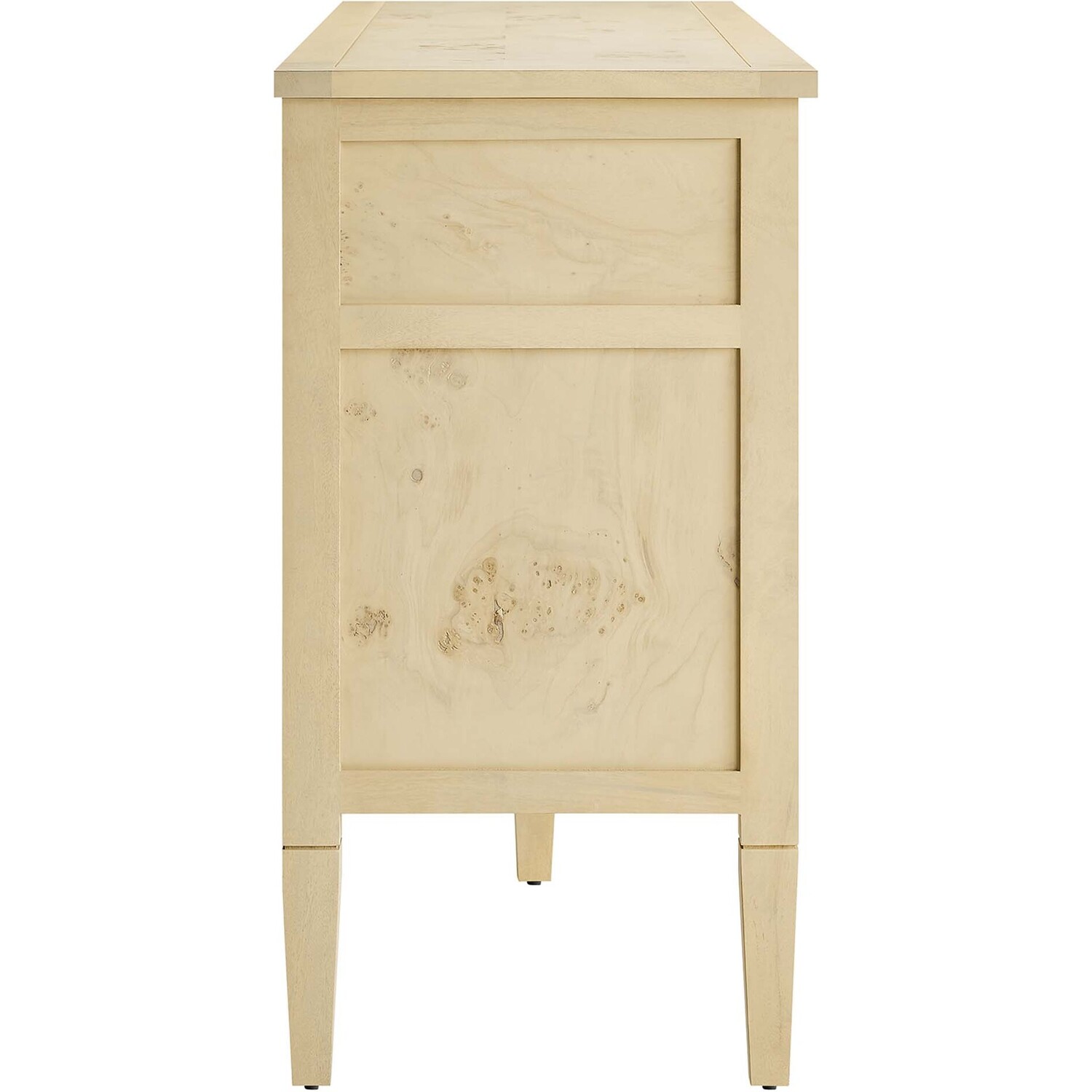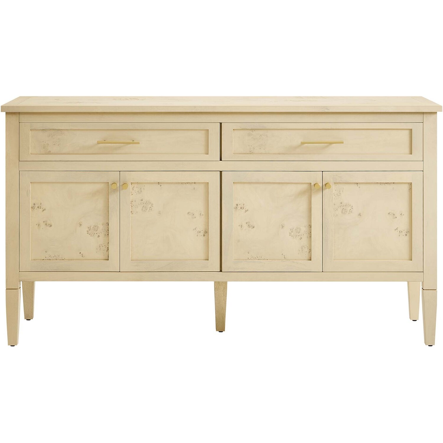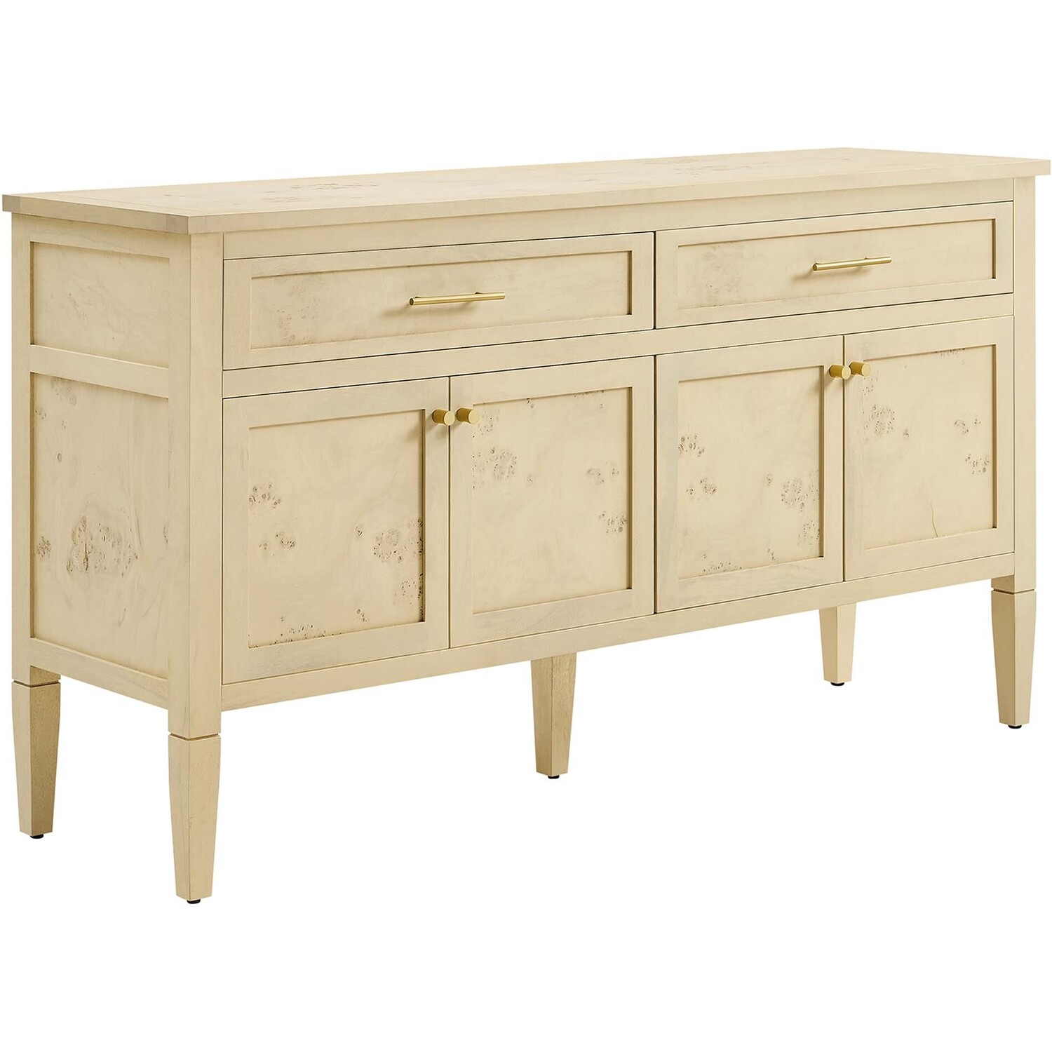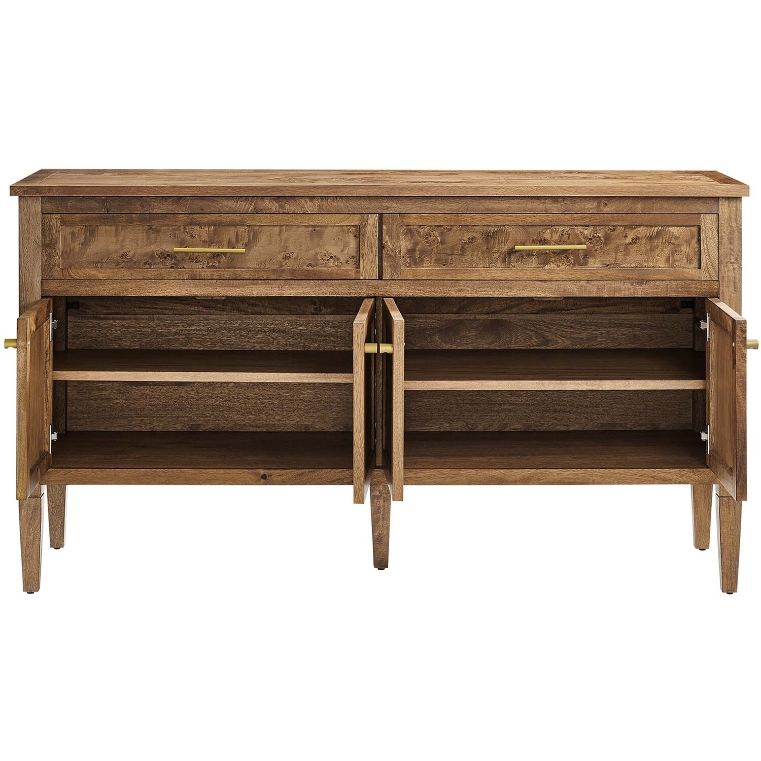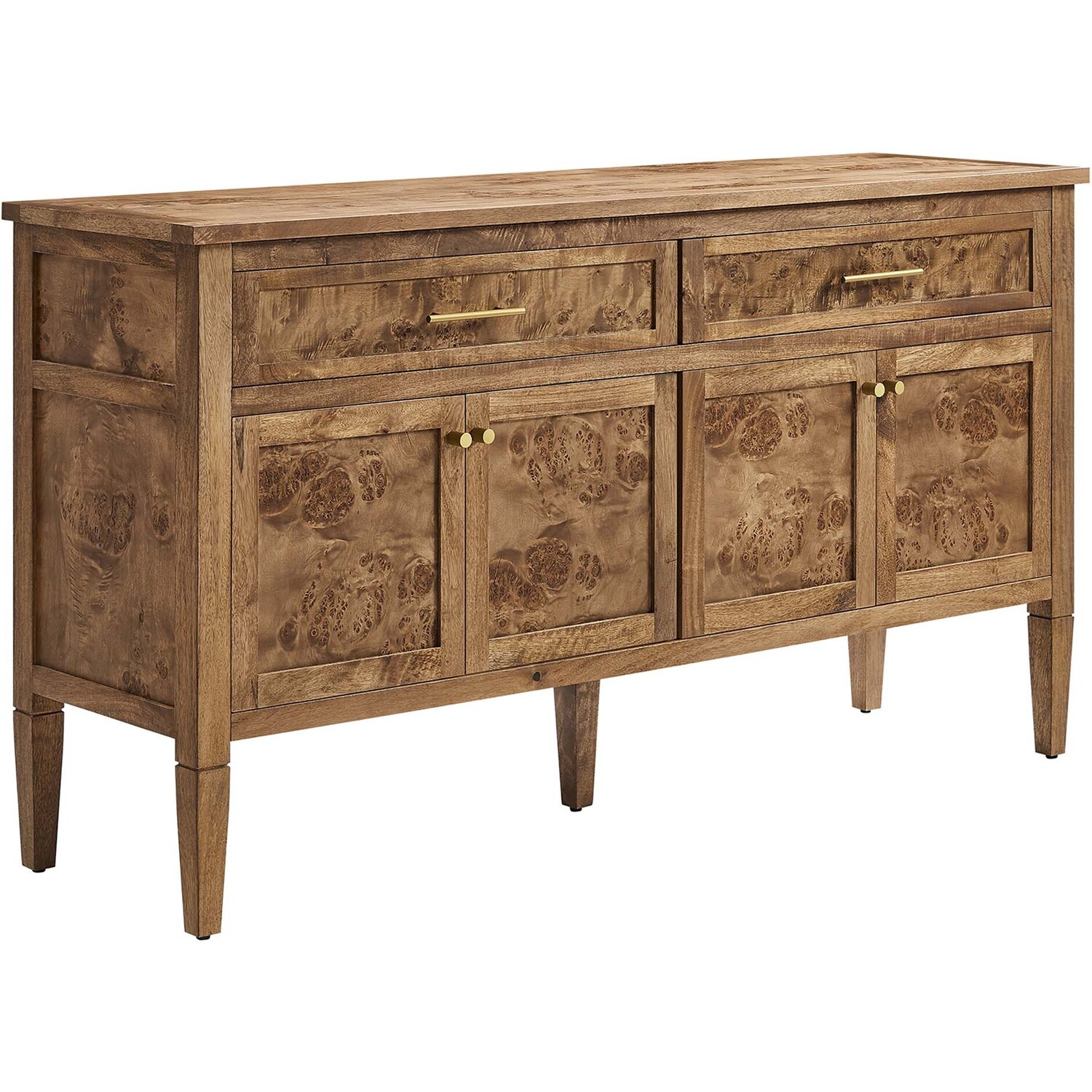 Discover the epitome of aesthetics and practicality with the Elysian 62" Burl Wood Sideboard. Uniquely crafted from exquisite mango wood and adorned with a rich burl wood veneer, this accent cabinet radiates distinctive charm and character. Featuring two wide top drawers and double cupboards below with spacious shelving, each seamlessly integrated with soft-close hinges, this wood console table also serves as a buffet cabinet, credenza, or even a kitchen storage cabinet. A versatile piece, Elysian is also a stylish TV stand for televisions up to 68". It provides extensive storage space perfect for organizing dining essentials like table linens, cutlery, or glassware, as well as media essentials, board games, books, or decorative objects. Its sleek design is further enhanced by tapered wood legs, while its leveling, non-marking feet help protect floors, making it a practical choice for modern homes. Whether used as a hallway console, entryway table or storage cabinet for the living room, this versatile media stand comes with easy-to-follow assembly instructions for a smooth setup. Weight Capacity: 275 lbs. Please Note: When placing the TV directly on the unit, we recommend anchoring it in place.Mango Wood Construction