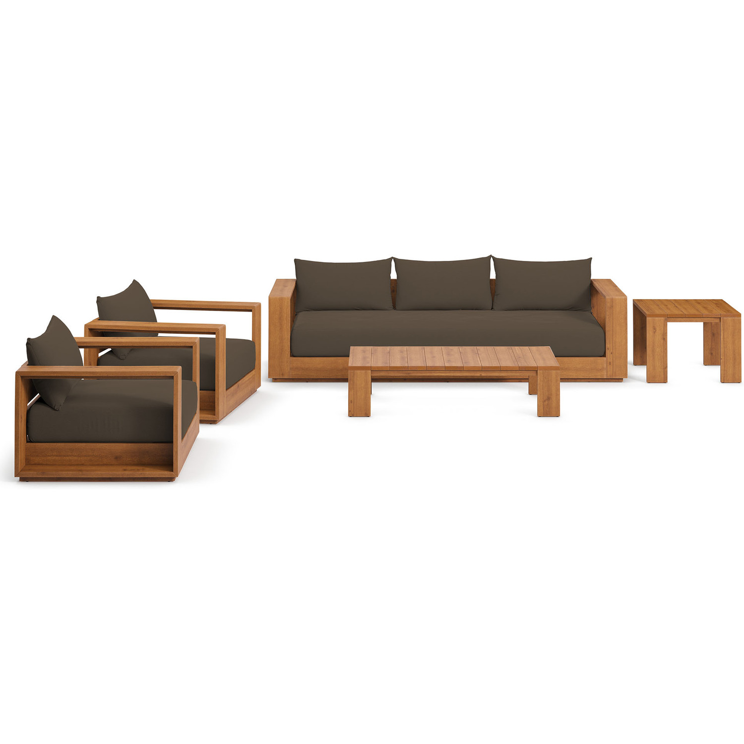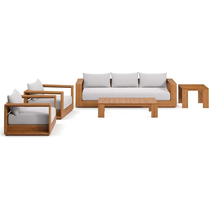 Enliven your alfresco spaces with the Tahoe 5-Piece Outdoor Furniture Set. This modern outdoor patio set is constructed with FSC-certified acacia wood, blending seamlessly into your outdoor lounge spaces. Featuring two lounge chairs, a sofa, a coffee table, and a side table, this 5-piece deck furniture set is ideal for poolside lounging or as chic balcony furniture. Dense foam padding on the lounge chairs and sofa ensure sustained comfort, while the UV and water-resistant cushion covers make it ideal before and after a dip. The removable cushions render this outdoor patio furniture set low maintenance and high performing. Practically designed, the coffee table and side table work well in the rain thanks to the slatted tops that helps keep them dry and puddle-free. An accommodating all-weather acacia patio set, Tahoe is perfect for outdoor relaxing and entertaining. This durable 5-piece set features non-marking foot glides to protect your deck or patio floor and comes with easy-to-follow assembly instructions. Set Includes: 2 Lounge Chair, 1 Sofa, 1 Coffee Table, 1 Side Table. Weight Capacity: Lounge Chair: 500 lbs; Sofa: 800 lbs; Coffee Table: 265 lbs; Side Table: 198 lbs.Outdoor Patio Furniture Set