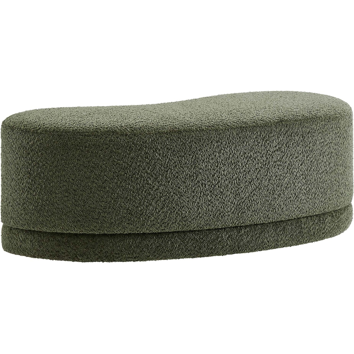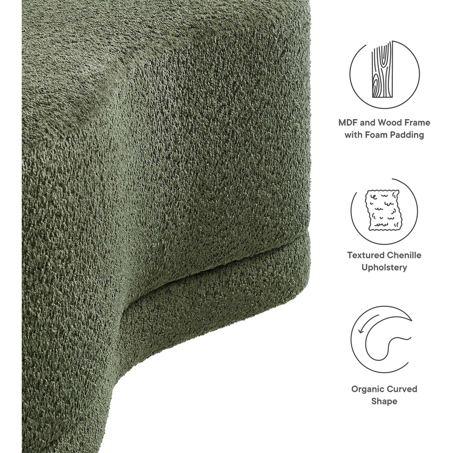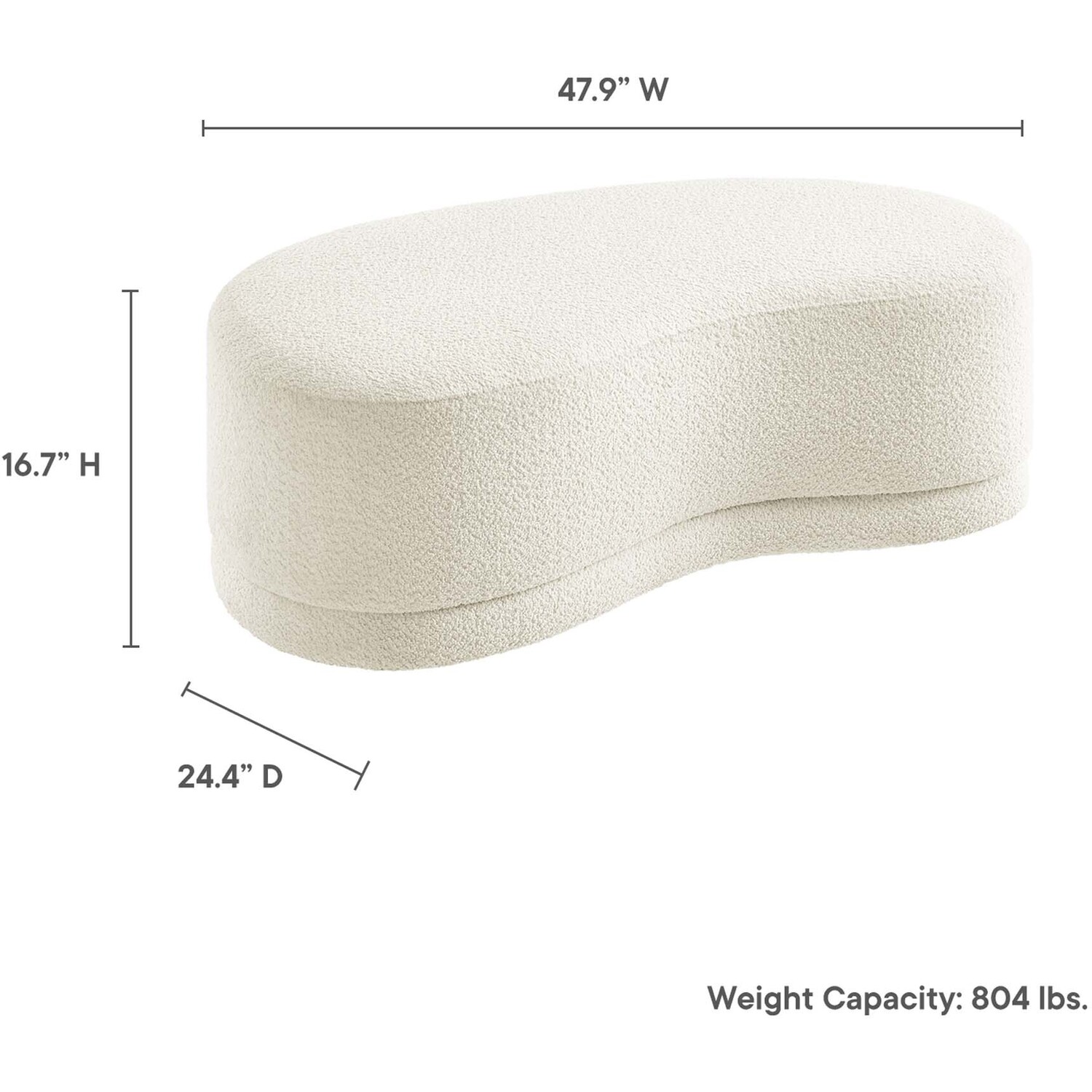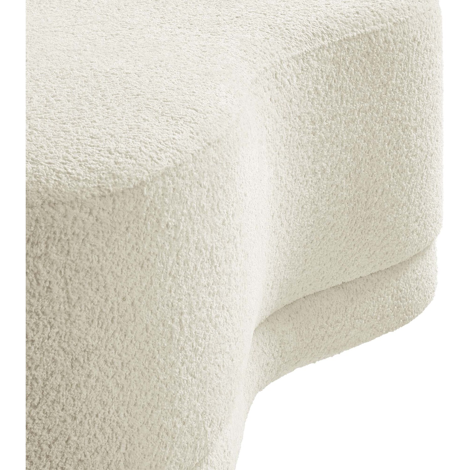 The Nimbus Ottoman, with its organic contours and curved lines, brings a touch of modernity to any living room or bedroom. Wrapped in a soft chenille fabric with a texture similar to boucle, this upholstered ottoman elevates comfort as both a bedroom ottoman and a modern living room furniture piece. The solid frame and dense foam padding of this bed ottoman provide a stable base, rendering it a sturdy footstool perfect for propping up your feet. The Nimbus upholstered curved bench includes non-marking plastic floor glides to safeguard your floors. Whether it's used as a bedroom bench or an innovative upholstered coffee table, this soft fabric ottoman marries style with multipurpose appeal. The Nimbus accent ottoman arrives fully assembled and ready to use. Weight Capacity: 804 lbs.Soft Chenille Upholstery