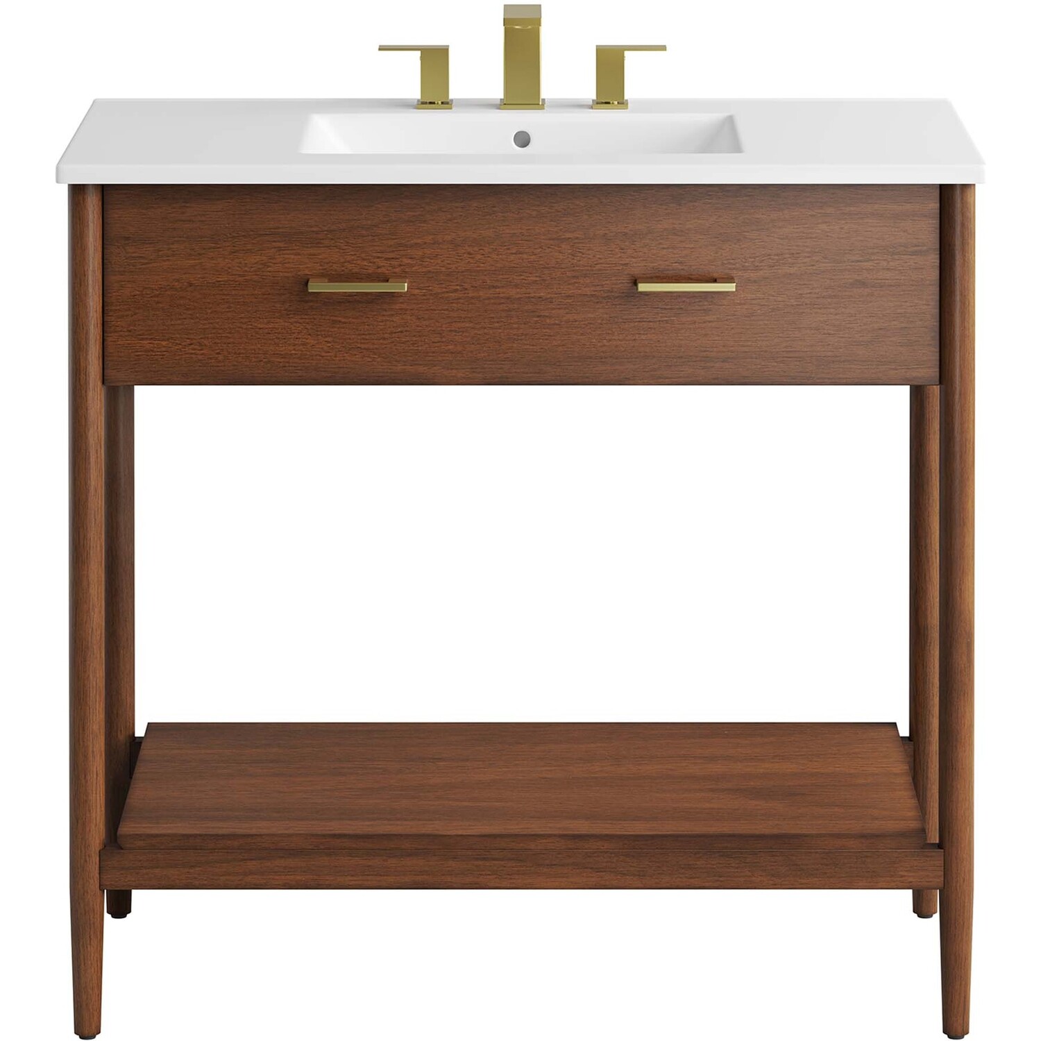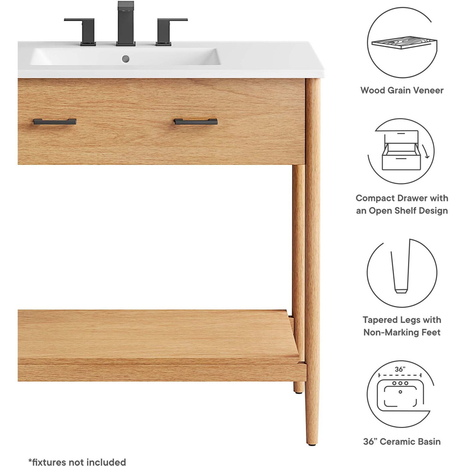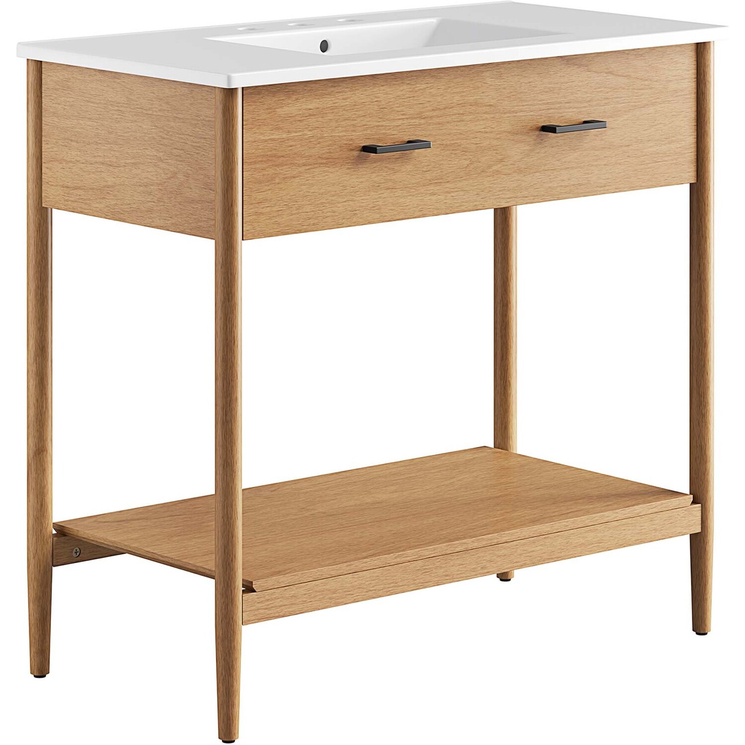 Infuse your bathroom decor with the subtle charm and simplicity of the Zaire 36” Bathroom Vanity. This exquisite washstand combines sleek, contemporary lines with the natural beauty of wood in an organic minimalist design. Crafted from MDF and solid rubberwood and topped with a wood grain veneer, this vanity’s design is emphasized by two metal handle pulls on its drawer, giving it a touch of urban chic. Below this, you'll find an open shelf, ideal for holding towels or showcasing your favorite decorative pieces. Featuring a sleek ceramic basin with 8" centerset holes and an integrated countertop, this vanity easily becomes a functional centerpiece in your bathroom. This vanity’s tapered wood legs are a modest and understated design choice that completes the overall simple mid-century aesthetic. Includes adjustable, non-marking feet for added stability and floor protection. Assembly required. Fixtures not included. Weight Capacity: 375 lbs.MDF and Rubberwood