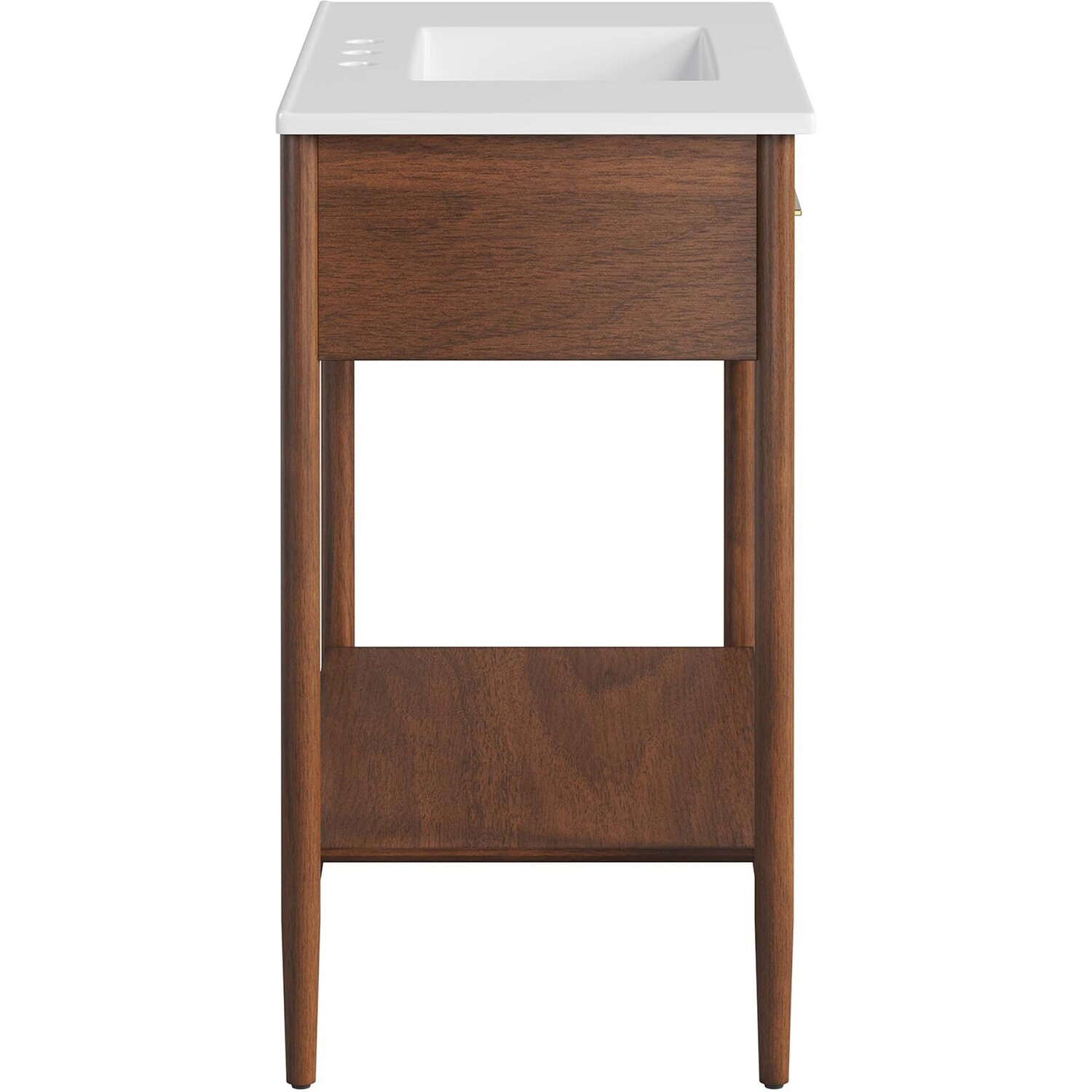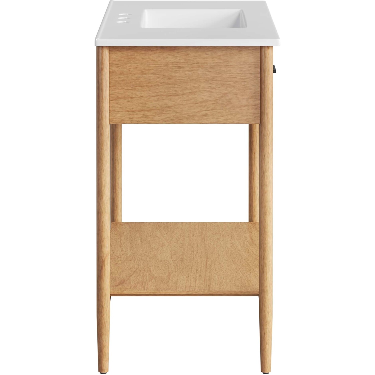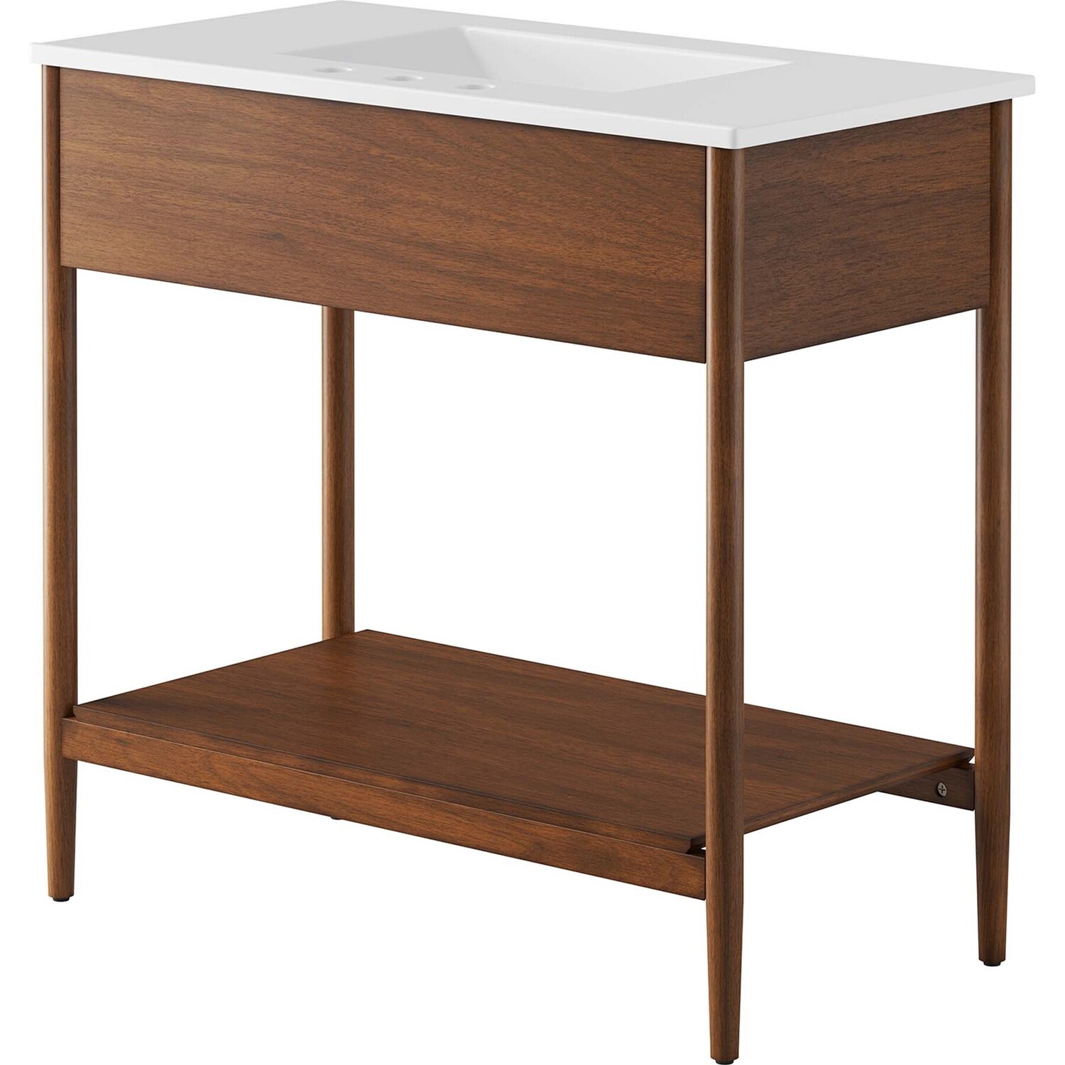 Infuse your bathroom decor with the subtle charm and simplicity of the Zaire 36” Bathroom Vanity. This exquisite washstand combines sleek, contemporary lines with the natural beauty of wood in an organic minimalist design. Crafted from MDF and solid rubberwood and topped with a wood grain veneer, this vanity’s design is emphasized by two metal handle pulls on its drawer, giving it a touch of urban chic. Below this, you'll find an open shelf, ideal for holding towels or showcasing your favorite decorative pieces. Featuring a sleek ceramic basin with 8" centerset holes and an integrated countertop, this vanity easily becomes a functional centerpiece in your bathroom. This vanity’s tapered wood legs are a modest and understated design choice that completes the overall simple mid-century aesthetic. Includes adjustable, non-marking feet for added stability and floor protection. Assembly required. Fixtures not included. Weight Capacity: 375 lbs.MDF and Rubberwood