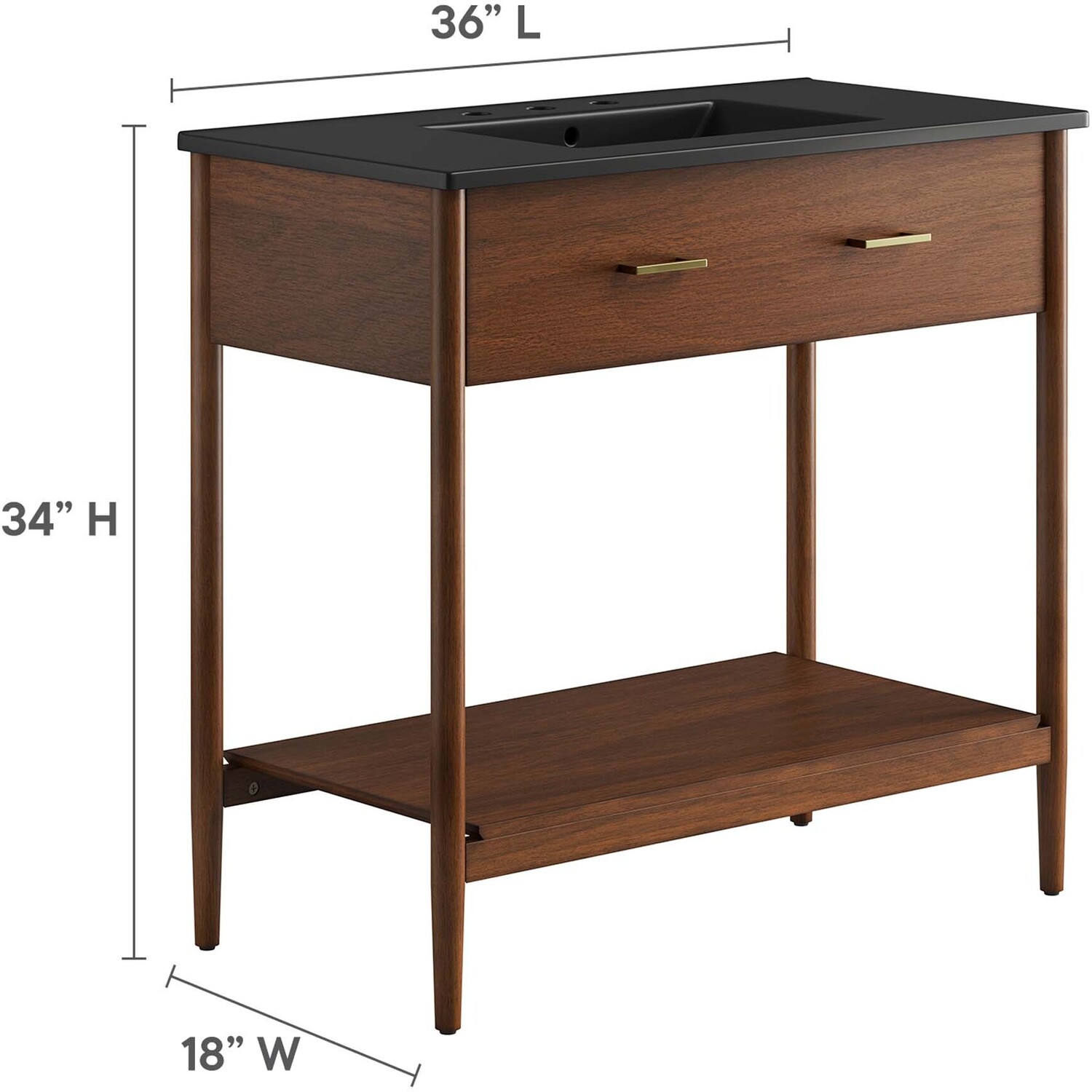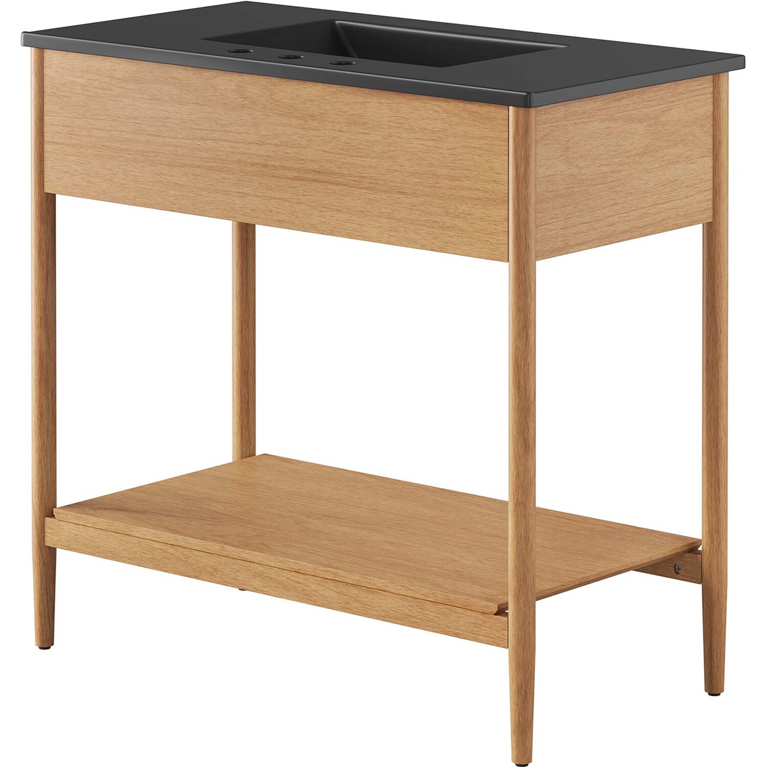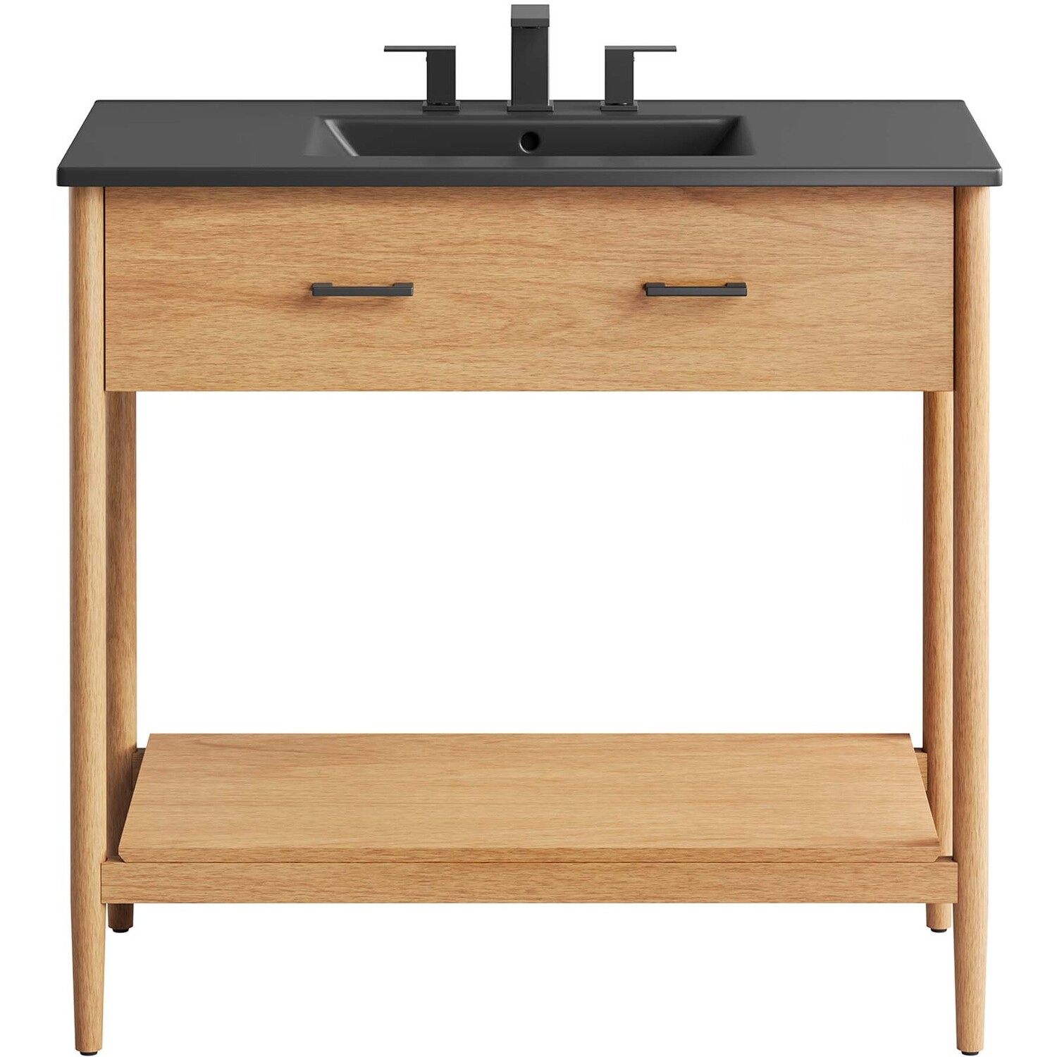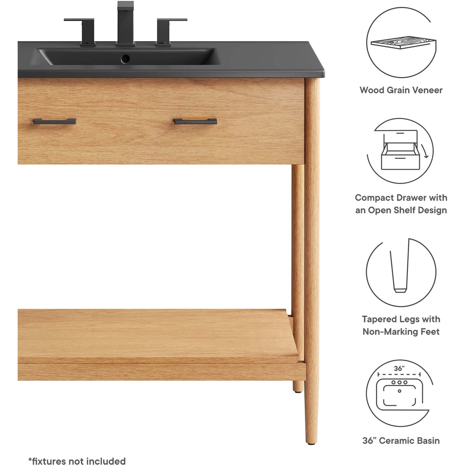 Infuse your bathroom decor with the subtle charm and simplicity of the Zaire 36” Bathroom Vanity. This exquisite washstand combines sleek, contemporary lines with the natural beauty of wood in an organic minimalist design. Crafted from MDF and solid rubberwood and topped with a wood grain veneer, this vanity’s design is emphasized by two metal handle pulls on its drawer, giving it a touch of urban chic. Below this, you'll find an open shelf, ideal for holding towels or showcasing your favorite decorative pieces. Featuring a sleek ceramic basin with 8" centerset holes and an integrated countertop, this vanity easily becomes a functional centerpiece in your bathroom. This vanity’s tapered wood legs are a modest and understated design choice that completes the overall simple mid-century aesthetic. Includes adjustable, non-marking feet for added stability and floor protection. Assembly required. Fixtures not included. Weight Capacity: 375 lbs.MDF and Rubberwood
