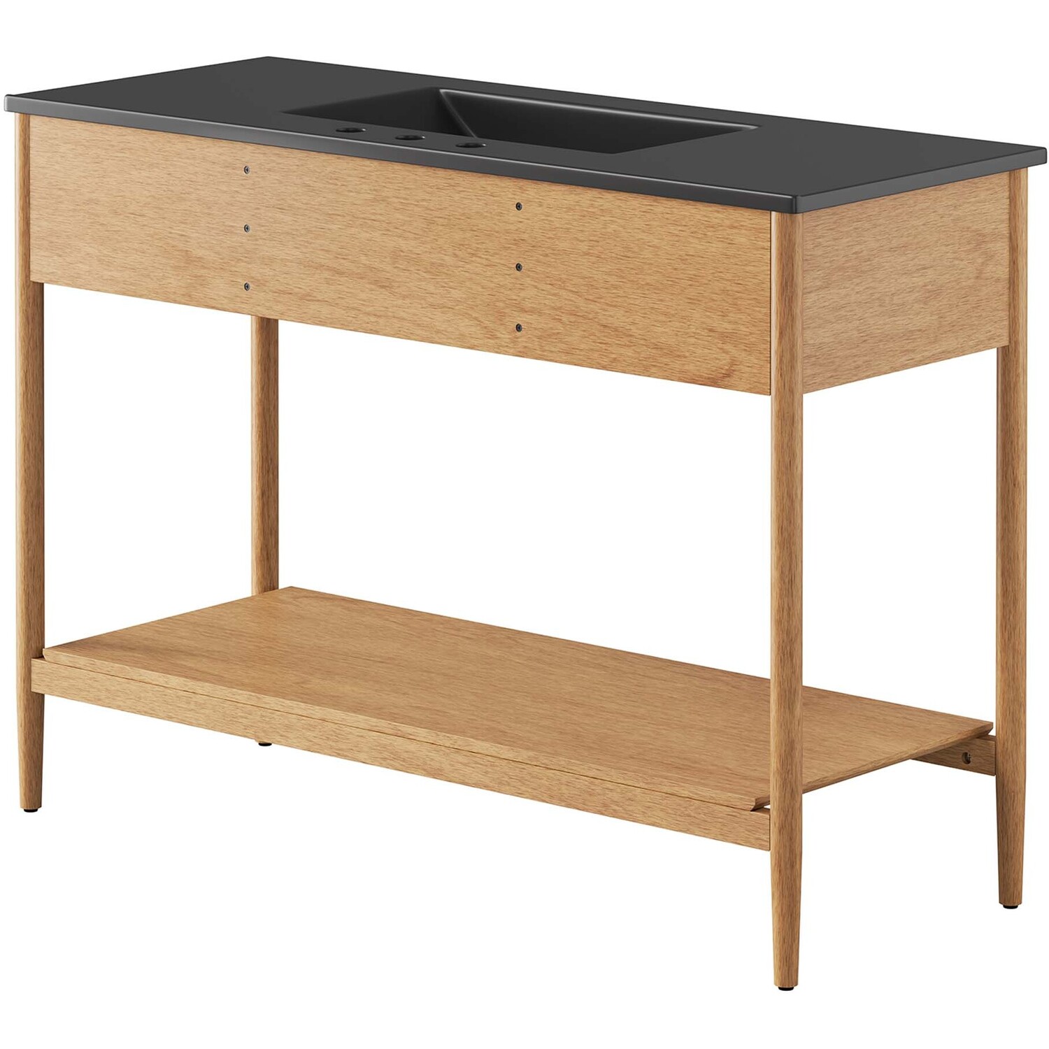 Infuse your bathroom decor with the subtle charm and simplicity of the Zaire 48” Bathroom Vanity. This exquisite washstand combines sleek, contemporary lines with the natural beauty of wood in an organic minimalist design. Crafted from MDF and solid rubberwood and topped with a wood grain veneer, this vanity’s design is emphasized by metal handle pulls on its three drawers, giving it a touch of urban chic. While the middle drawer is fixed, the two end drawers offer ample storage space to neatly tuck away your bathroom essentials. Below this, you'll find an open shelf, ideal for holding towels or showcasing your favorite decorative pieces. Featuring a sleek single sink ceramic basin with 8" centerset holes and an integrated countertop, this vanity easily becomes a functional centerpiece in your bathroom. This vanity’s tapered wood legs are a modest and understated design choice that completes the overall simple mid-century aesthetic. Includes adjustable, non-marking feet for added stability and floor protection. Assembly required. Fixtures not included. Weight Capacity: 375 lbs.MDF and Rubberwood