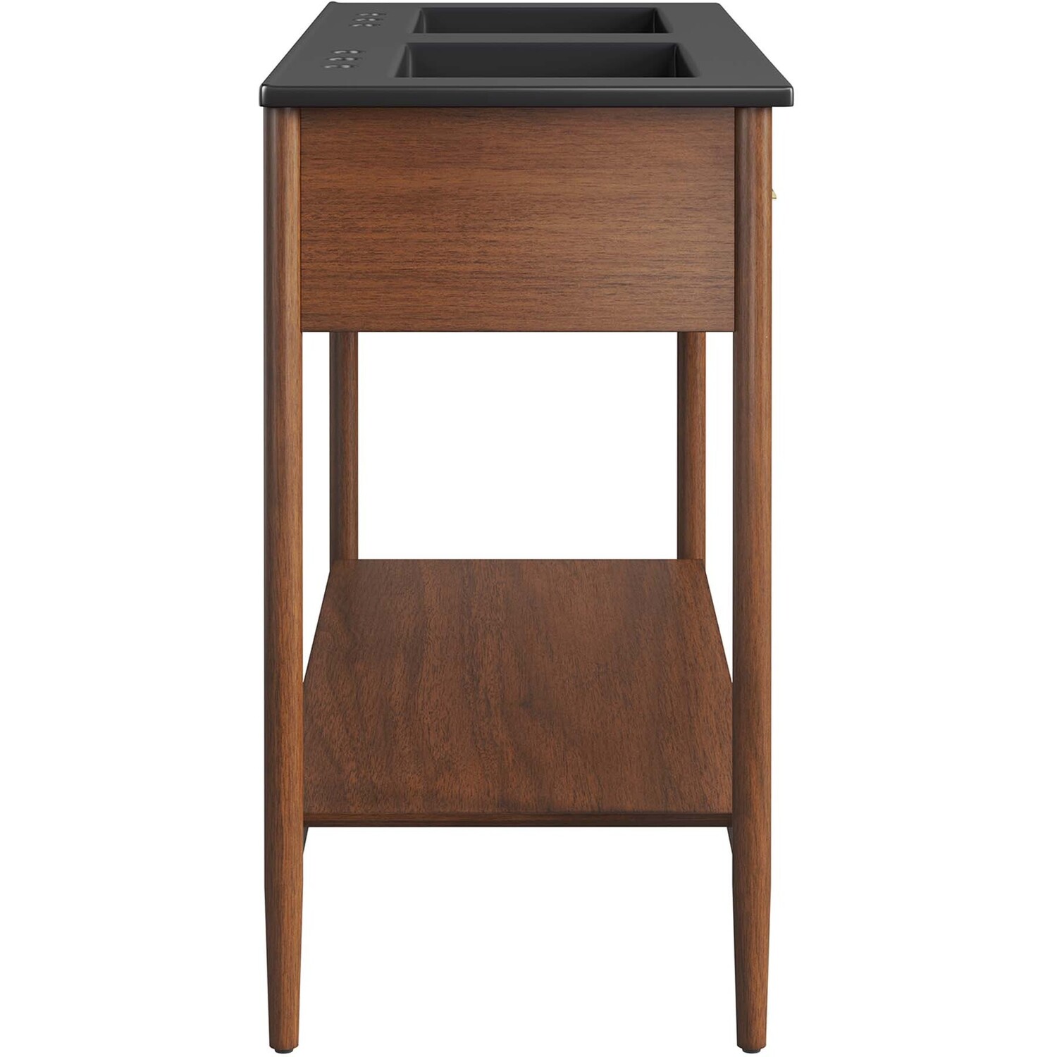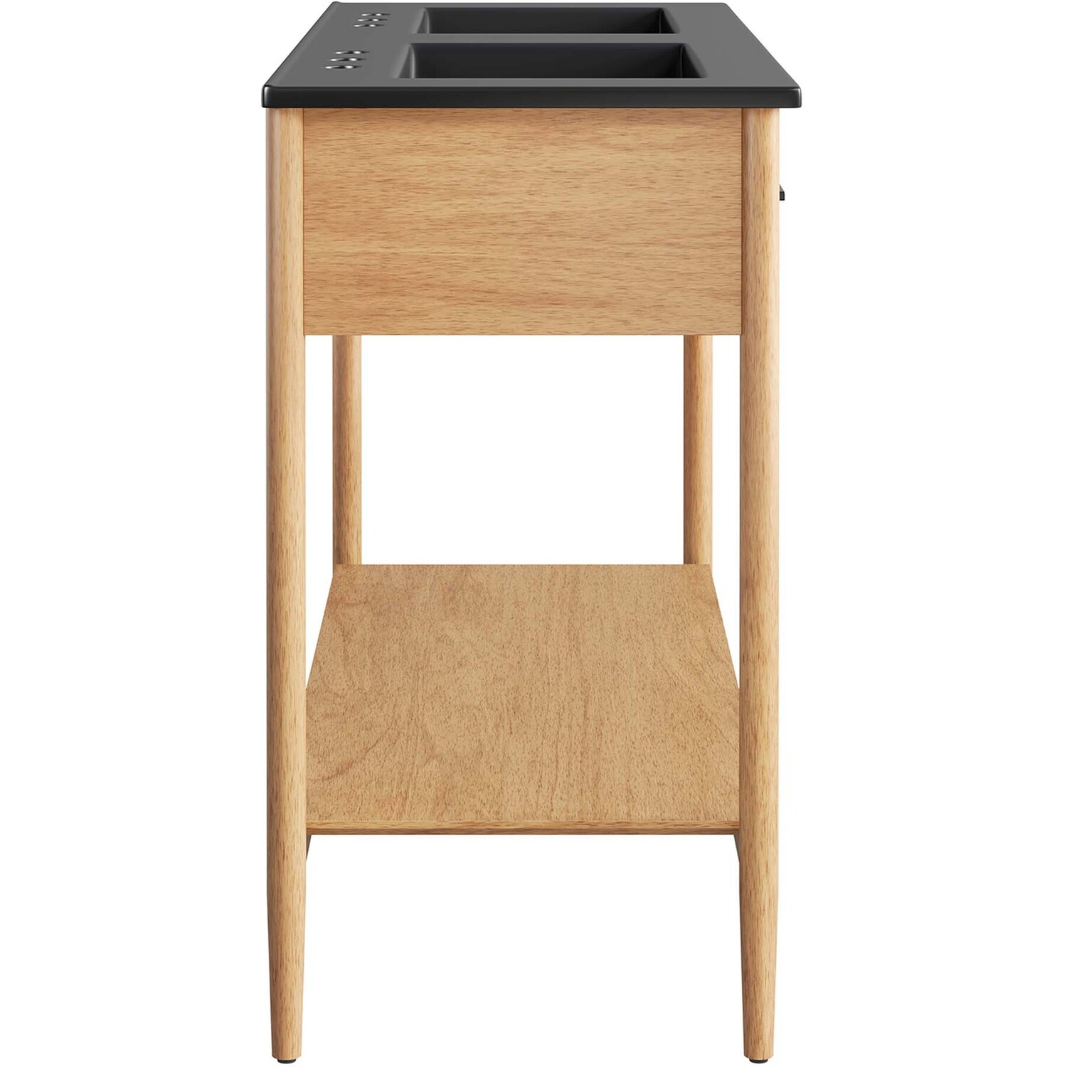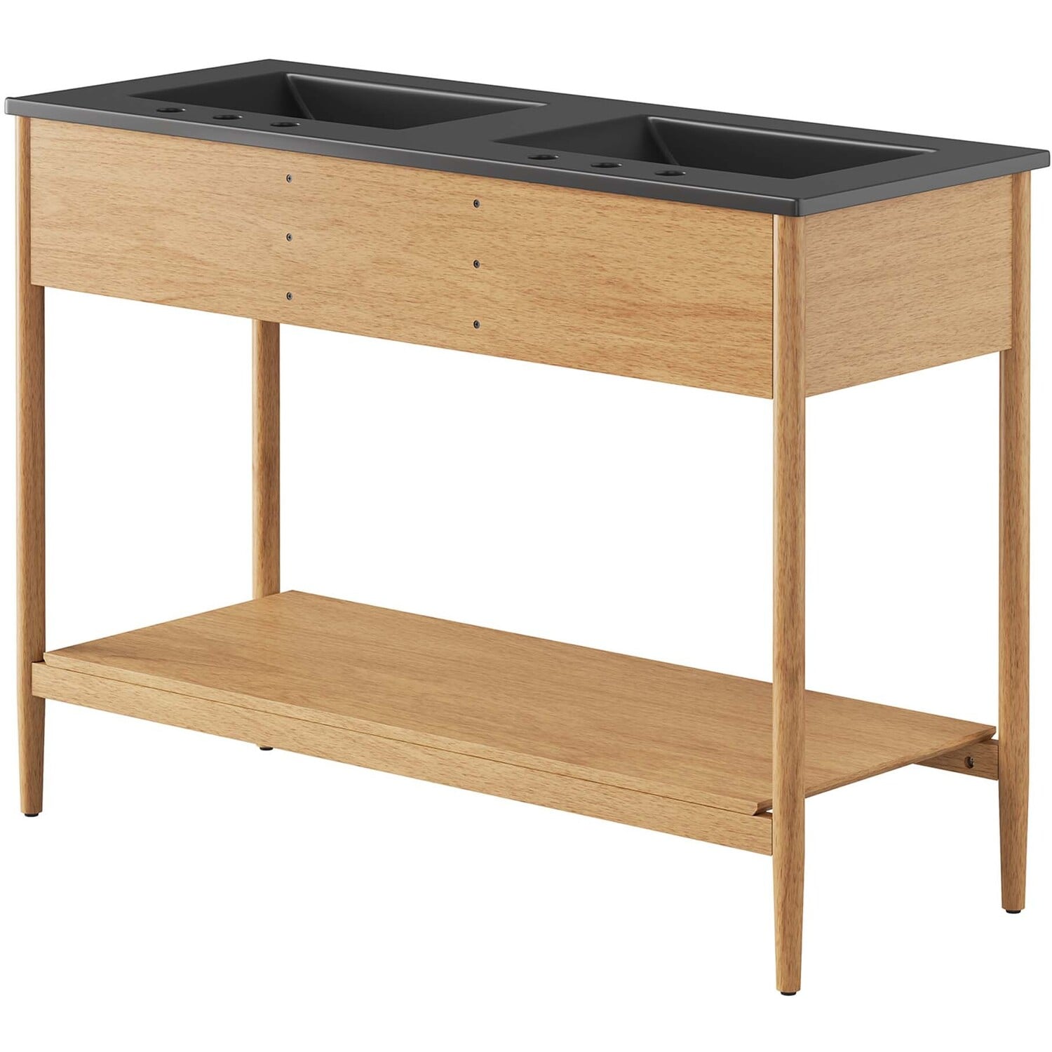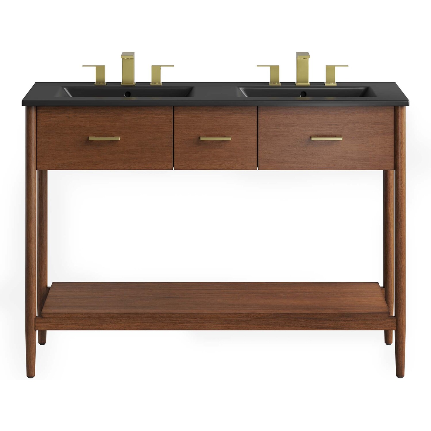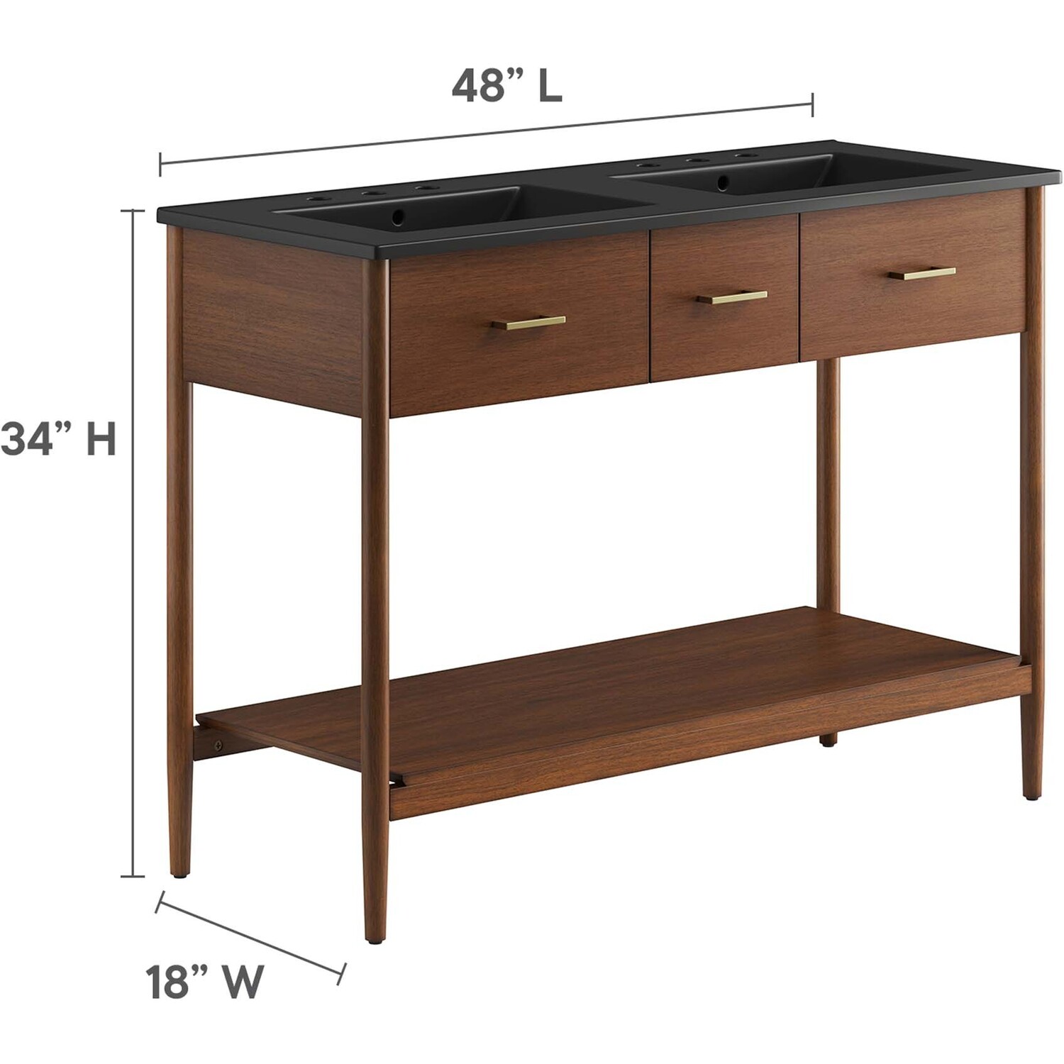 Infuse your bathroom decor with the subtle charm and simplicity of the Zaire 48” Dual Sink Bathroom Vanity. This exquisite washstand combines sleek, contemporary lines with the natural beauty of wood in an organic minimalist design. Crafted from MDF and solid rubberwood and topped with a wood grain veneer, this vanity’s design is emphasized by metal handle pulls on its three drawers, giving it a touch of urban chic. While the two side drawers are fixed, the middle drawer offers ample storage space to neatly tuck away your bathroom essentials. Below this, you'll find an open shelf, ideal for holding towels or showcasing your favorite decorative pieces. Featuring a sleek double sink ceramic basin with 8" centerset holes and an integrated countertop, this vanity easily becomes a functional centerpiece in your bathroom. This vanity’s tapered wood legs are a modest and understated design choice that completes the overall simple mid-century aesthetic. Includes adjustable, non-marking feet for added stability and floor protection. Assembly required. Fixtures not included. Weight Capacity: 375 lbs.MDF and Rubberwood