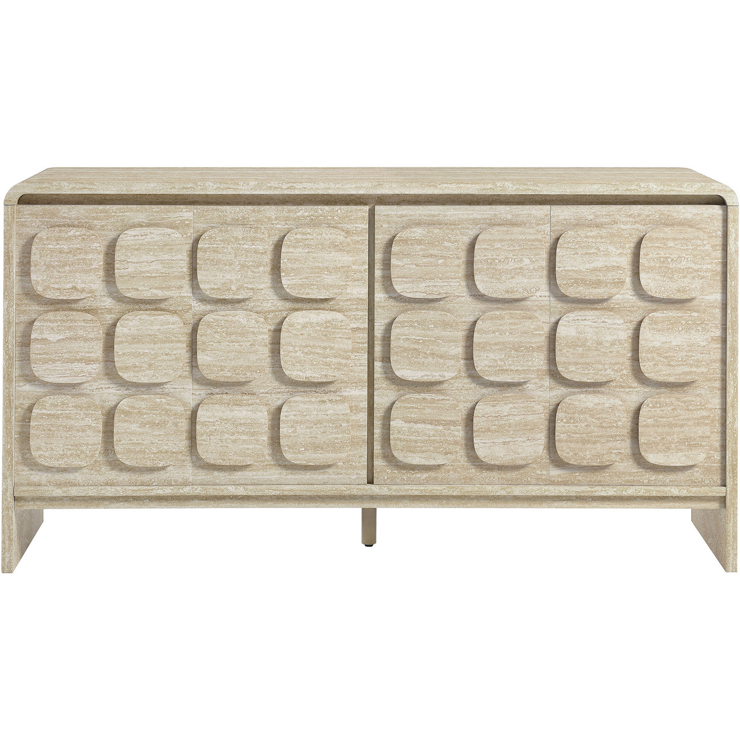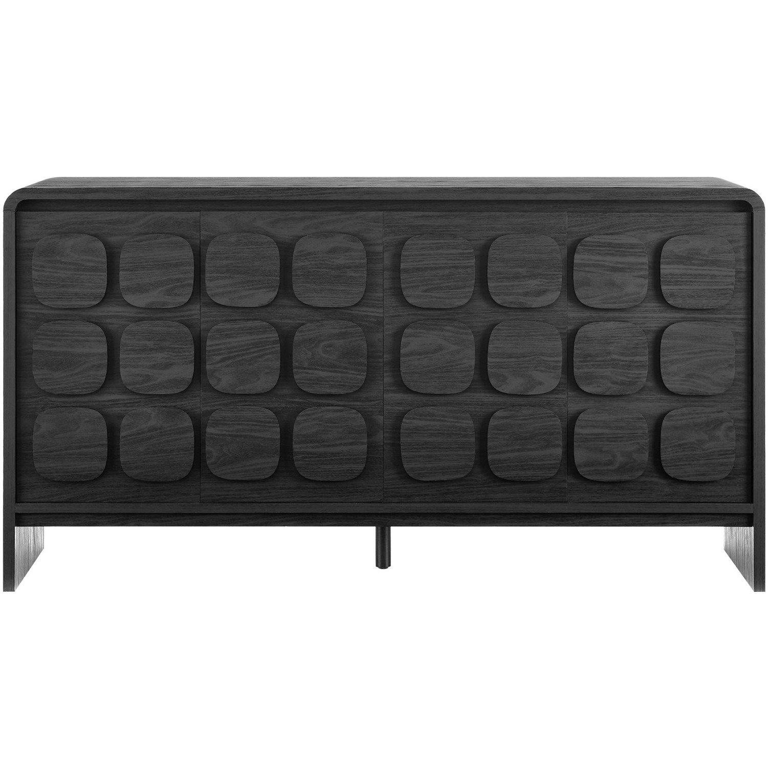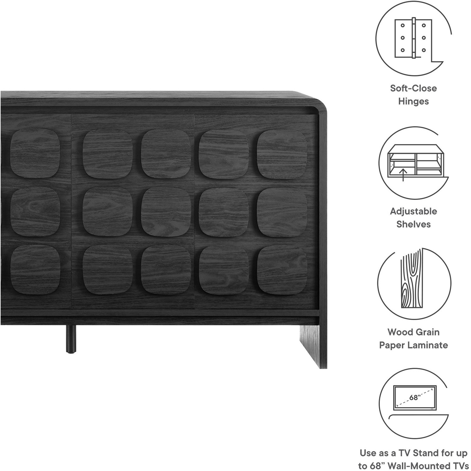 Elevate your living or working space with the Toscana 61'' Mid Century Modern Sideboard featuring rounded corners and a circular pattern motif across the face of the cabinet. This elegant buffet cabinet features a premium laminate finish for a sleek, contemporary design that upgrades any space. Perfect for the dining room, living room, or office, this storage cabinet combines style and functionality. Behind its four soft-close hinged doors, find two spacious storage areas in this credenza cabinet, each equipped with an adjustable shelf to accommodate your needs. Non-marking floor glides keep floors pristine. Whether you use it as a dining room sideboard or media cabinet with doors, its versatile design makes it an excellent choice for any setting. Capable of supporting wall-mounted TVs up to 68"es, Toscana is an ideal tv media console or entertainment stand. Transform your space with this modern storage cabinet that brings a touch of mid-century elegance to your home. Assembly required.Versatile Sideboard Storage Cabinet