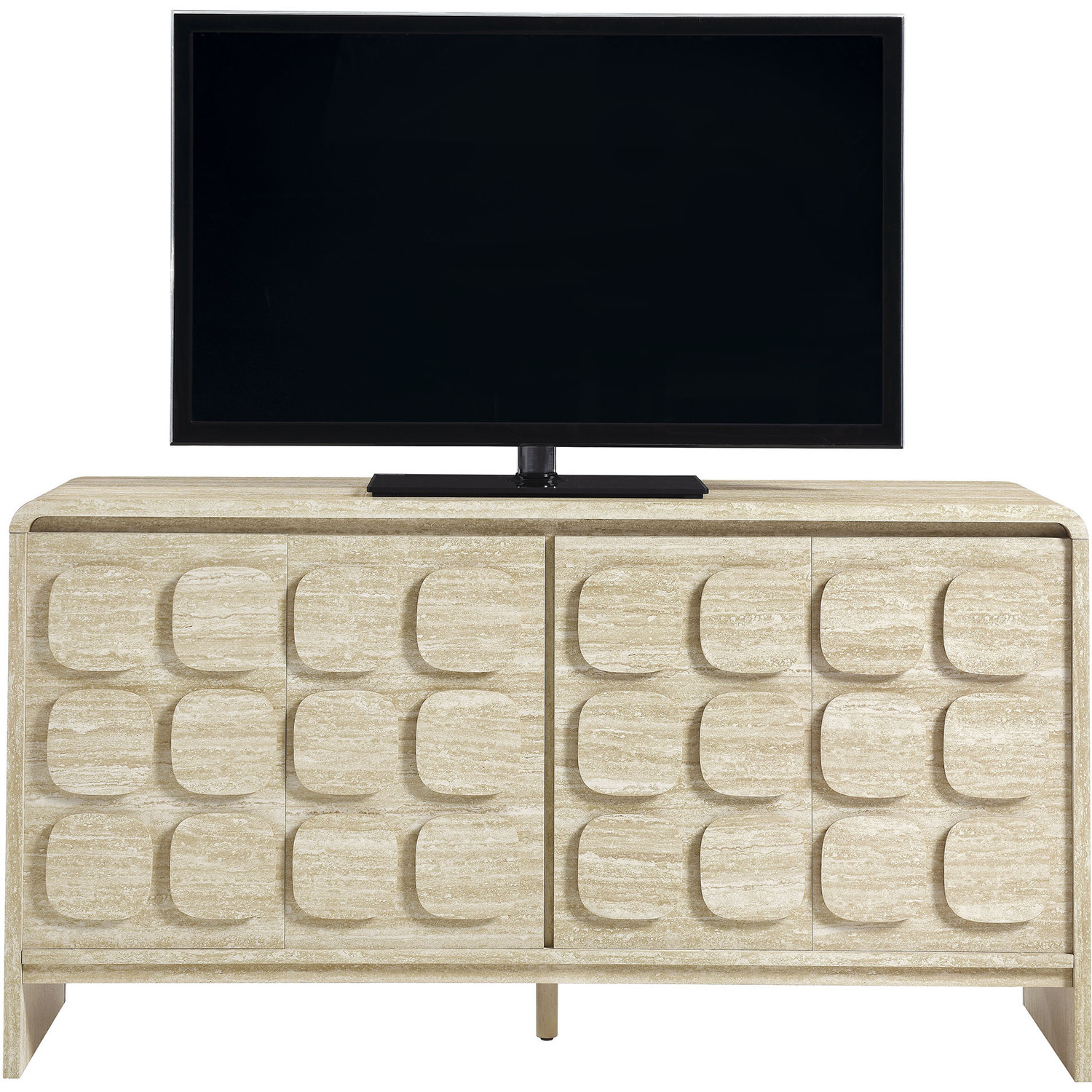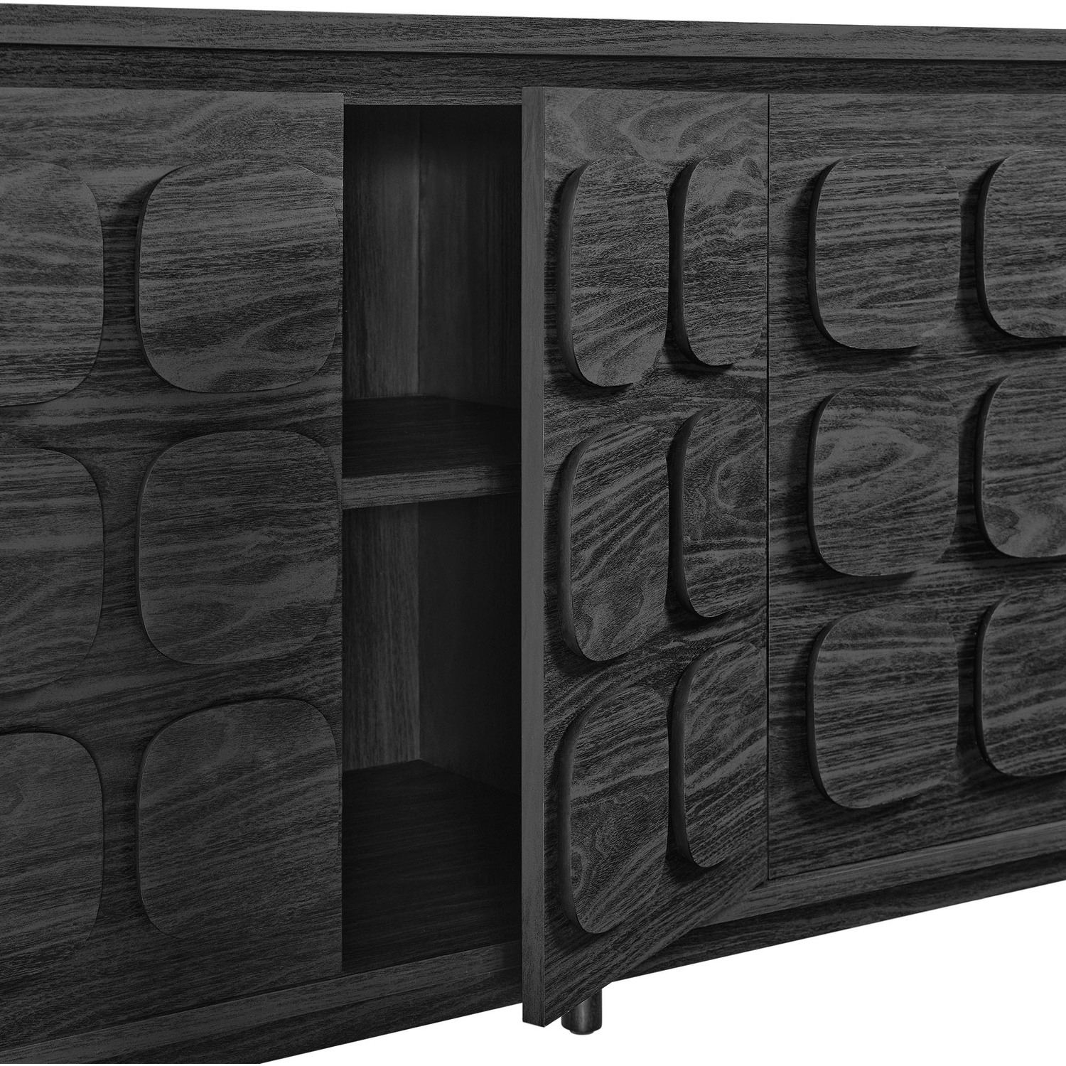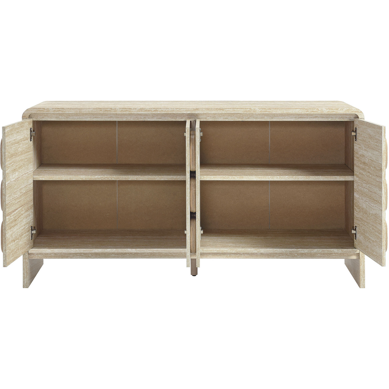 Elevate your living or working space with the Toscana 61'' Mid Century Modern Sideboard featuring rounded corners and a circular pattern motif across the face of the cabinet. This elegant buffet cabinet features a premium laminate finish for a sleek, contemporary design that upgrades any space. Perfect for the dining room, living room, or office, this storage cabinet combines style and functionality. Behind its four soft-close hinged doors, find two spacious storage areas in this credenza cabinet, each equipped with an adjustable shelf to accommodate your needs. Non-marking floor glides keep floors pristine. Whether you use it as a dining room sideboard or media cabinet with doors, its versatile design makes it an excellent choice for any setting. Capable of supporting wall-mounted TVs up to 68"es, Toscana is an ideal tv media console or entertainment stand. Transform your space with this modern storage cabinet that brings a touch of mid-century elegance to your home. Assembly required.Versatile Sideboard Storage Cabinet