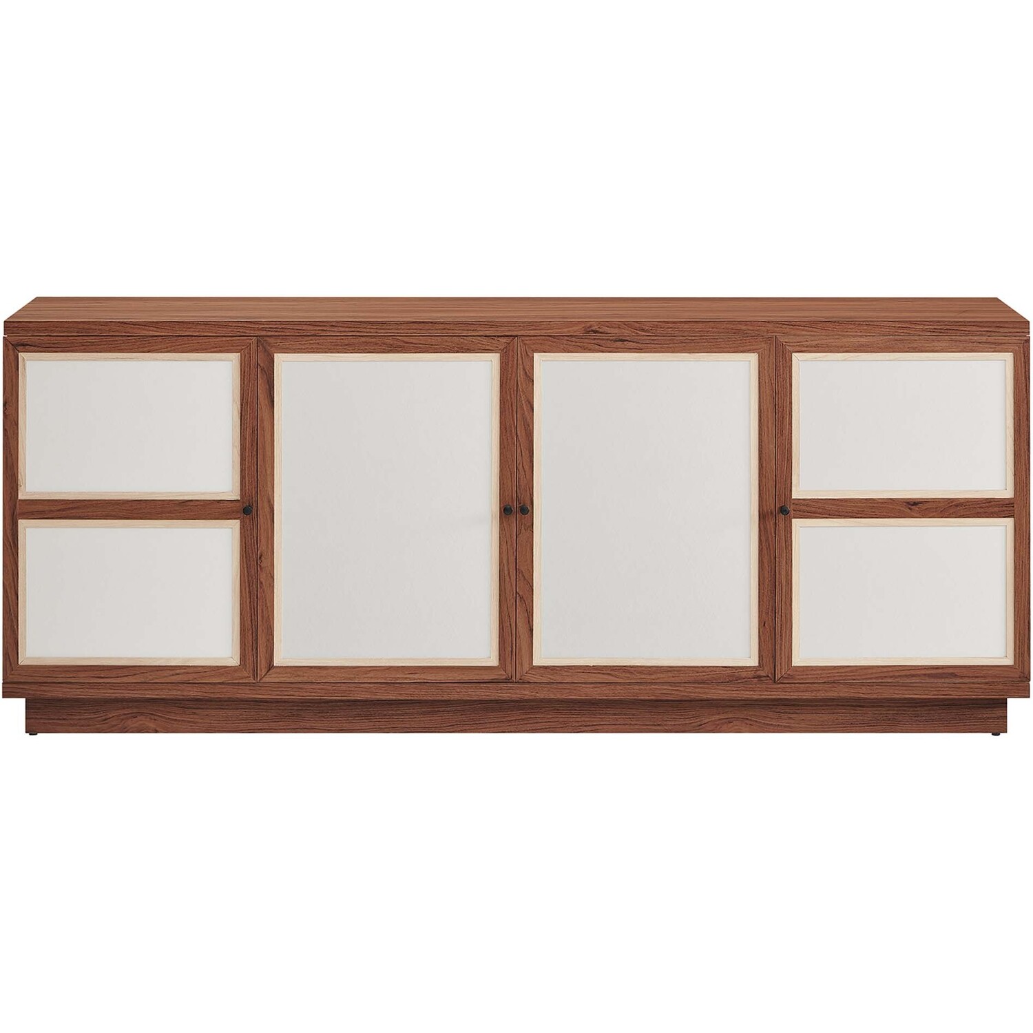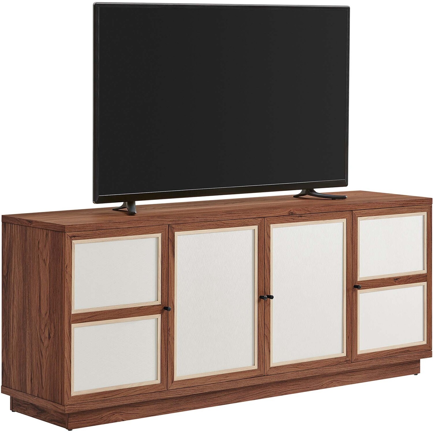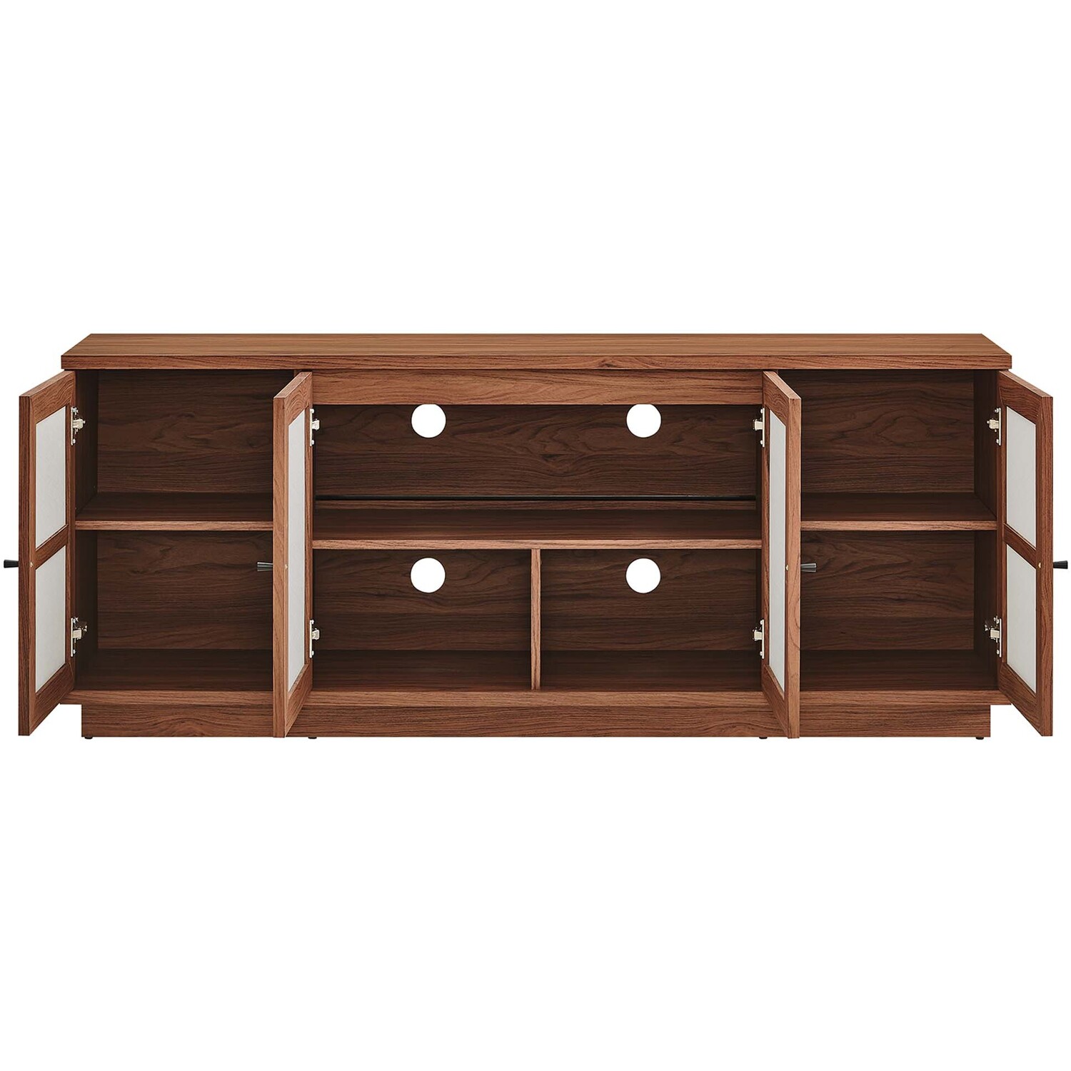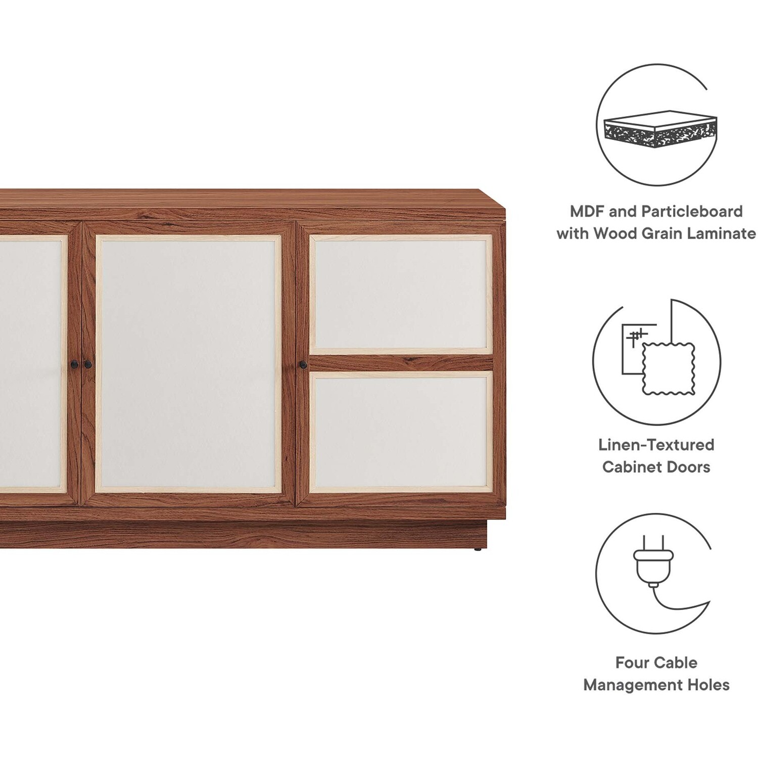 Elevate your decor with the modern Capri 63" TV Console, a large and spacious console that opens up to versatile media storage options. Crafted with durable particleboard and MDF, then finished with a wood grain laminate, this elegant media console brings a natural, organic aesthetic to your space. Its linen-textured doors, equipped with soft-close hinges, reveal spacious compartments for all your storage cabinet needs. Ideal as a TV console with storage in your living room, it also functions seamlessly as an entertainment center, or as a buffet cabinet or sideboard in your dining room. With non-marking glides to protect your flooring and four cable management holes to keep things tidy, this media console supports TVs up to 70"es. Designed provide a sophisticated solution for keeping your home organized and stylish, this mid century modern TV stand requires easy assembly and is a quintessential addition to any living space. Tabletop Weight Capacity: 198 lbs.; Shelf Weight Capacity: 154 lbs.Wood Grain Laminate