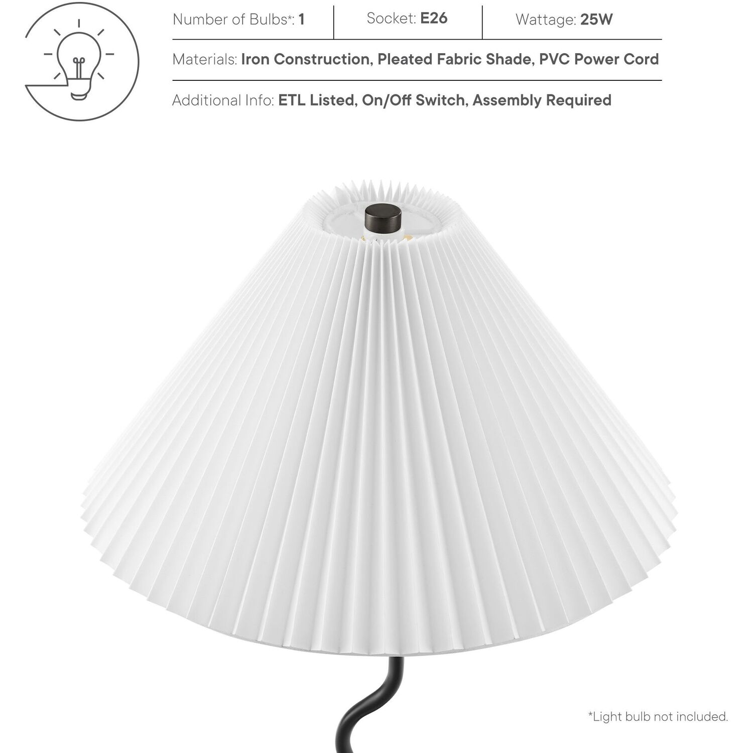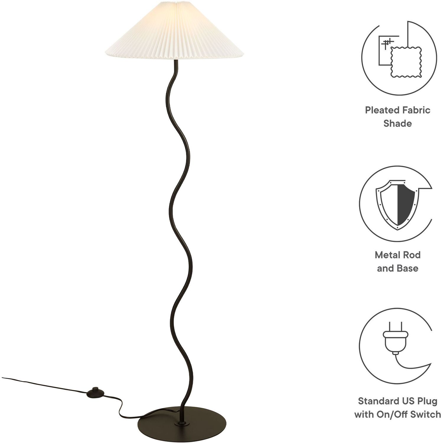 Merging contemporary design with timeless elegance, the Wave Squiggle Floor Lamp features a playful metal squiggle base, reminiscent of ocean waves. This modern floor lamp with a pleated shade stands tall to cast a warm, inviting glow, ideal for a living room light or a sophisticated accent in an office. Its freestanding design ensures a clean look, while the sturdy base provides stability and style. Embrace both form and function with this aesthetic lamp that makes a definitive statement. Perfect for creating ambient lighting in any room, the Wave Squiggle Floor Lamp enhances living spaces as a standing lamp for the living room or a cozy bedroom floor lamp. It’s ETL listed and approved and requires a single E26 25W bulb (not included). Features a PVC power cord and a convenient on/off switch. Assembly required.Modern Standing Lamp