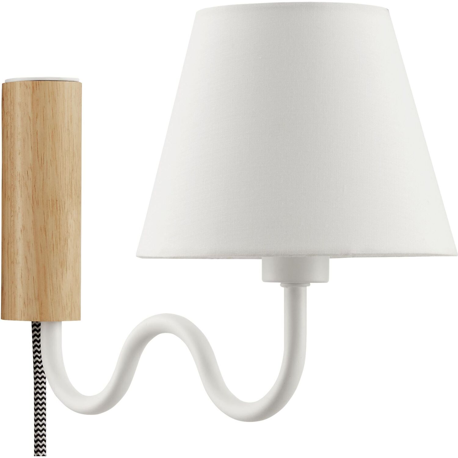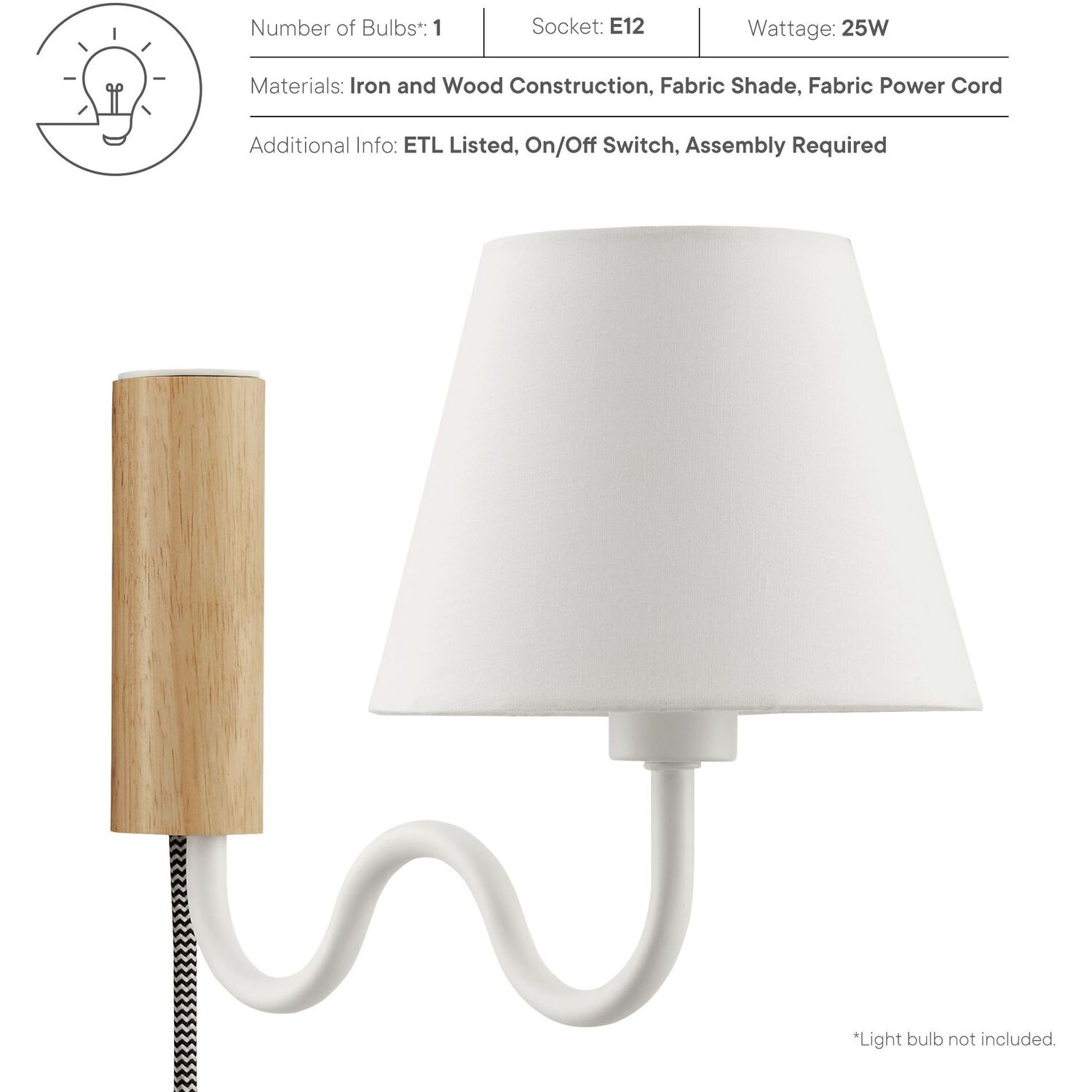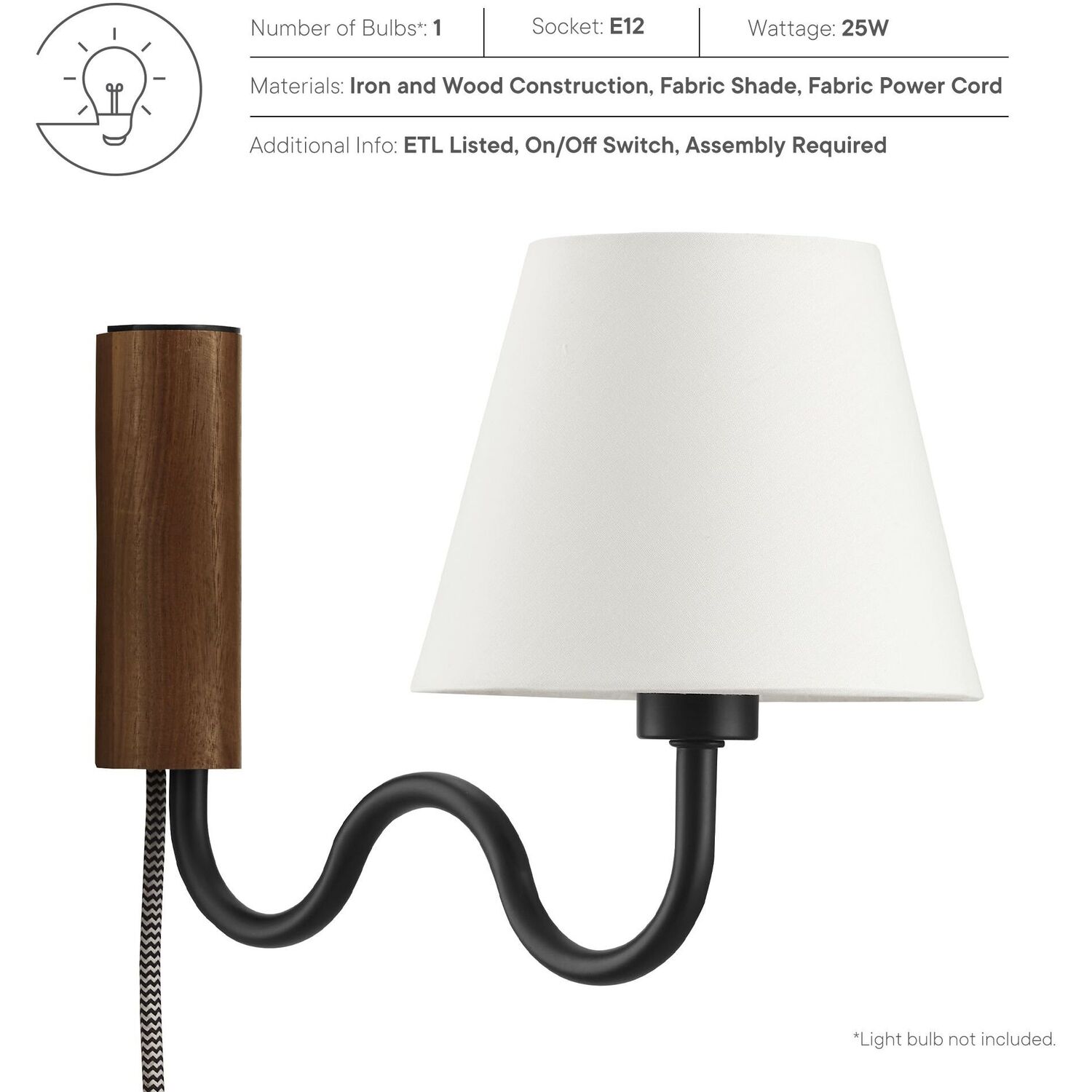 Illuminate your living space with the Sunlit Swivel Wall Sconce. A beautifully crafted wooden backplate anchors the design, offering a touch of natural aesthetics that complements any room. This wall sconce with fabric shade diffuses light to cast a warm, welcoming glow, perfect for a bedroom, living room, lounge space, or hallway. Function meets sophistication in this wall-mounted reading lamp's design, with a 144º swivel that lets you direct light where it's most needed. Conveniently designed, this wall lamp features a plug-in power cord and convenient on/off switch and offers a practical solution to avoid the need for hardwiring. The powder-coated metal rod features an undulating squiggle design reminiscent of ocean waves. Standing as a testament to playful form and modern wall sconce style, the ETL-listed Sunlit Wall Light requires one E12 25W bulb (not included). Assembly required.1-Light Wall Sconce