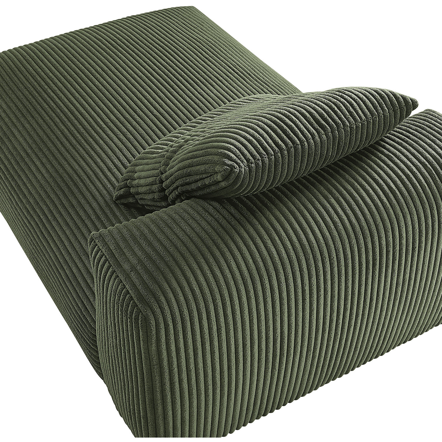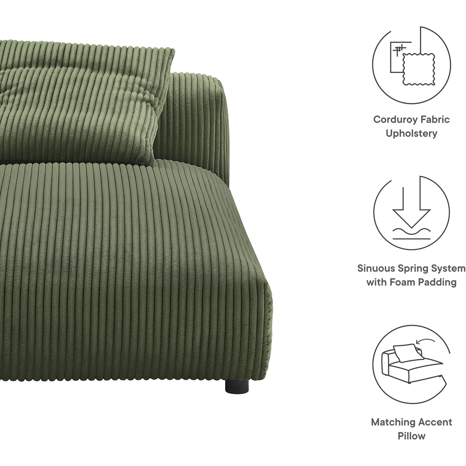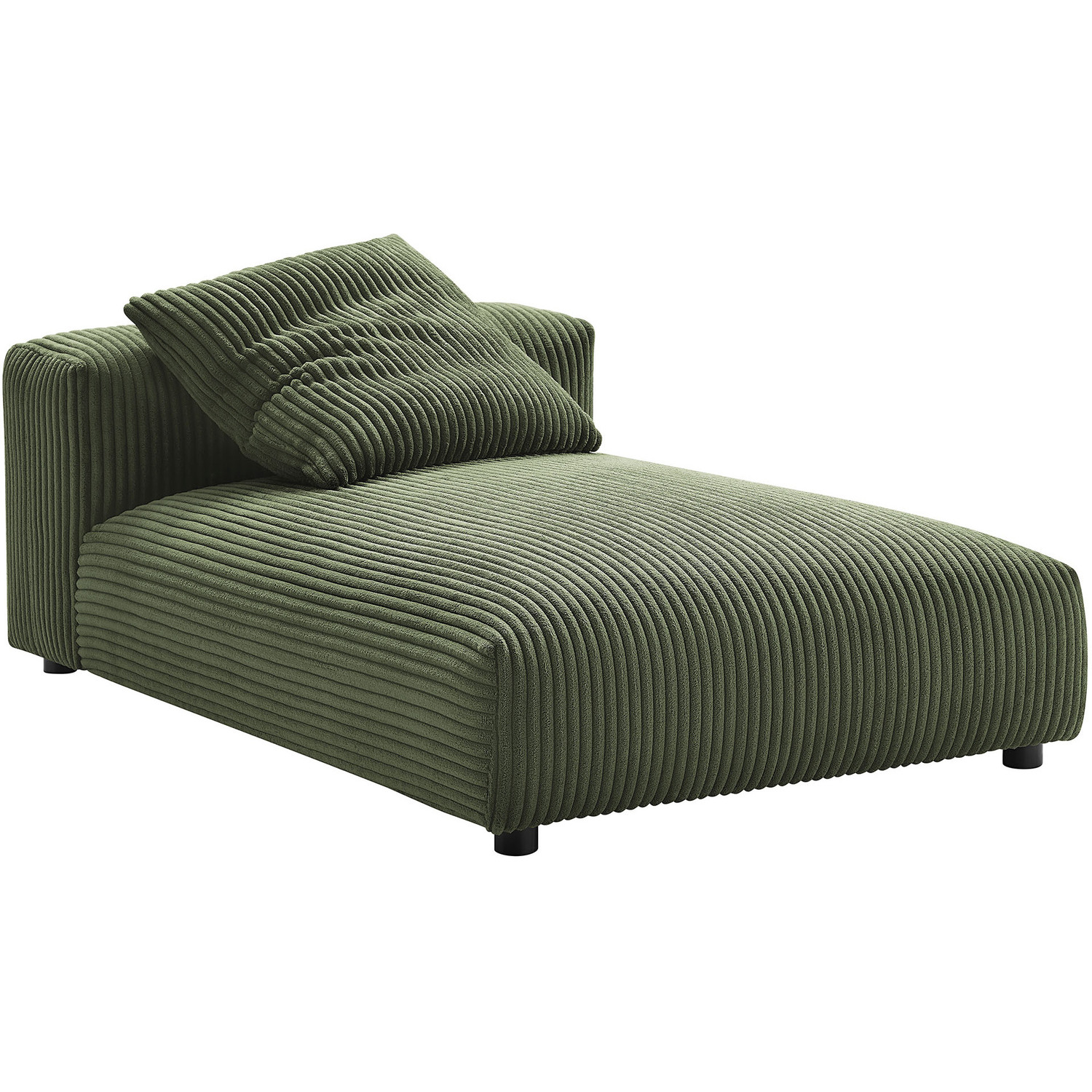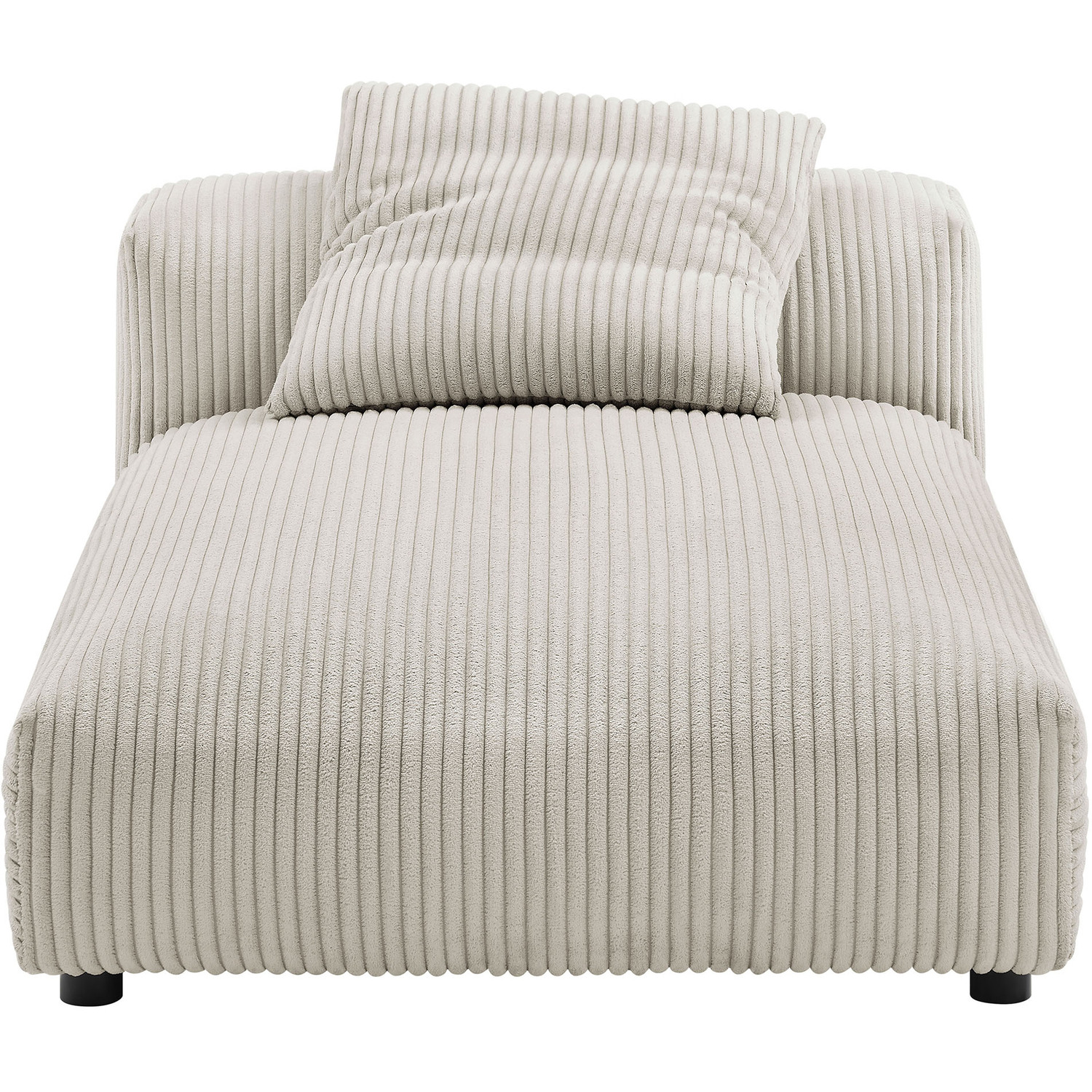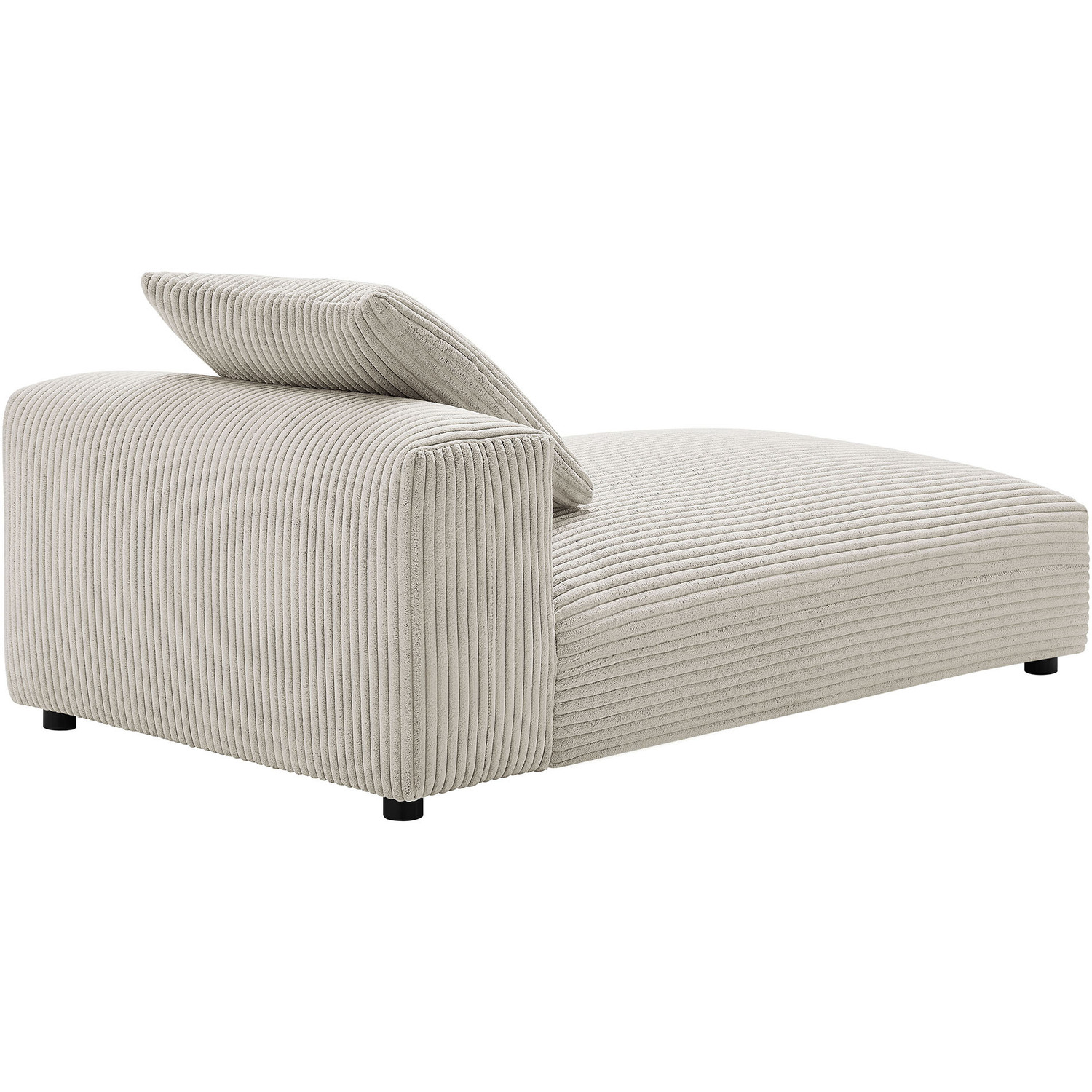 Revel in ultimate comfort and modern style with the Solace Modular Corduroy Chaise Lounge Chair. This oversized corduroy chaise lounge is perfect for any living room or bedroom, offering endless flexibility. Its modular furniture design allows you to change the arrangement to suit the needs of the moment or expand your seating by adding more pieces in the future. Featuring a sturdy frame, dense foam padding, and a sinuous spring support system, the Solace Chaise Lounger grants a premium seating experience. The comfy corduroy upholstery adds a cozy, casual vibe, making this sofa chaise a perfect addition to any living space or lounge area. Equipped with non-marking plastic glides and a complementing accent pillow, this armless chaise lounge chair is both stylish and practical. With easy assembly required, you can enjoy immediate relaxation on this indoor chaise lounge. Weight Capacity: 500 lbs.Modular Armless Chaise Lounge