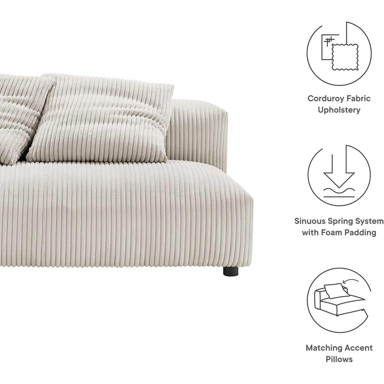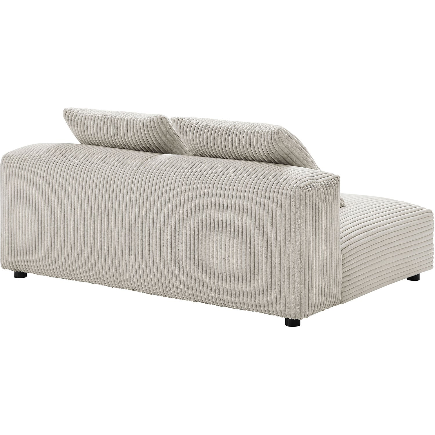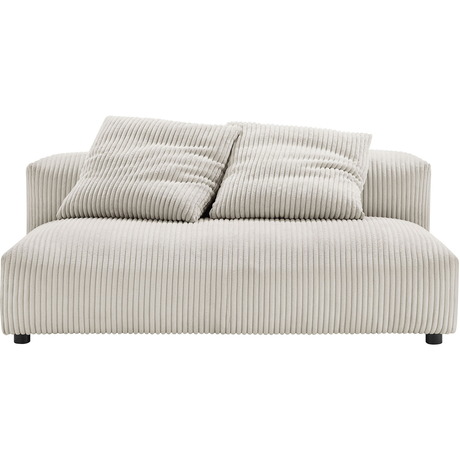 Revel in ultimate comfort and modern style with the Solace Modular Corduroy Loveseat. This oversized corduroy fabric loveseat is perfect for any living room, offering endless flexibility. Its modular furniture design allows you to change the arrangement to suit the needs of the moment or expand your seating by adding more pieces in the future. Featuring a sturdy frame, dense foam padding, and a sinuous spring support system, the Solace Armless Loveseat grants a premium seating experience. The comfy corduroy upholstery adds a cozy, casual vibe, making this modular loveseat a perfect addition to any living space or lounge area. Equipped with non-marking plastic glides and complementing accent pillows, this corduroy modern loveseat sofa couch is both stylish and practical. With easy assembly required, you can enjoy immediate relaxation on this upholstered loveseat. Weight Capacity: 800 lbs.Modular Armless Loveseat