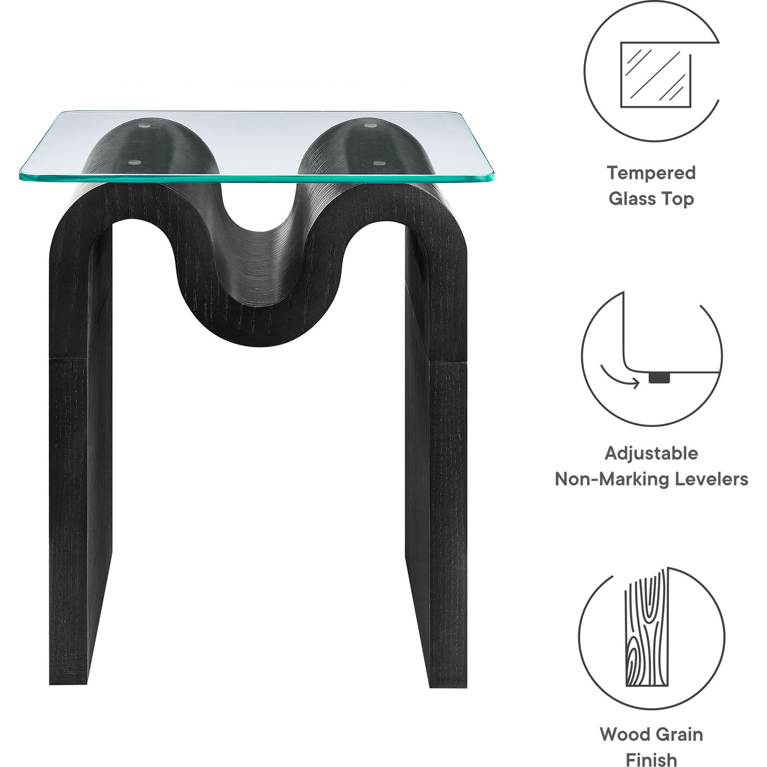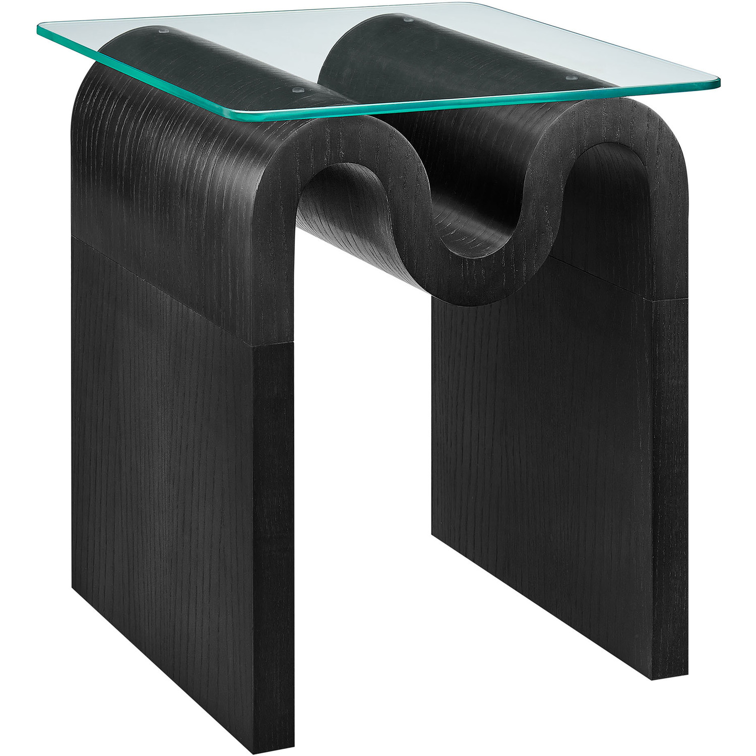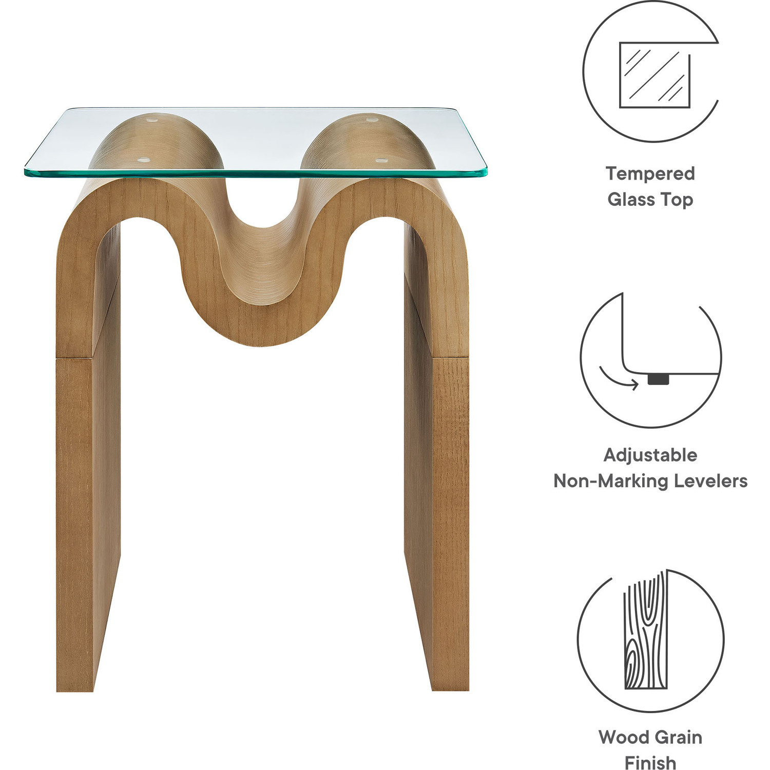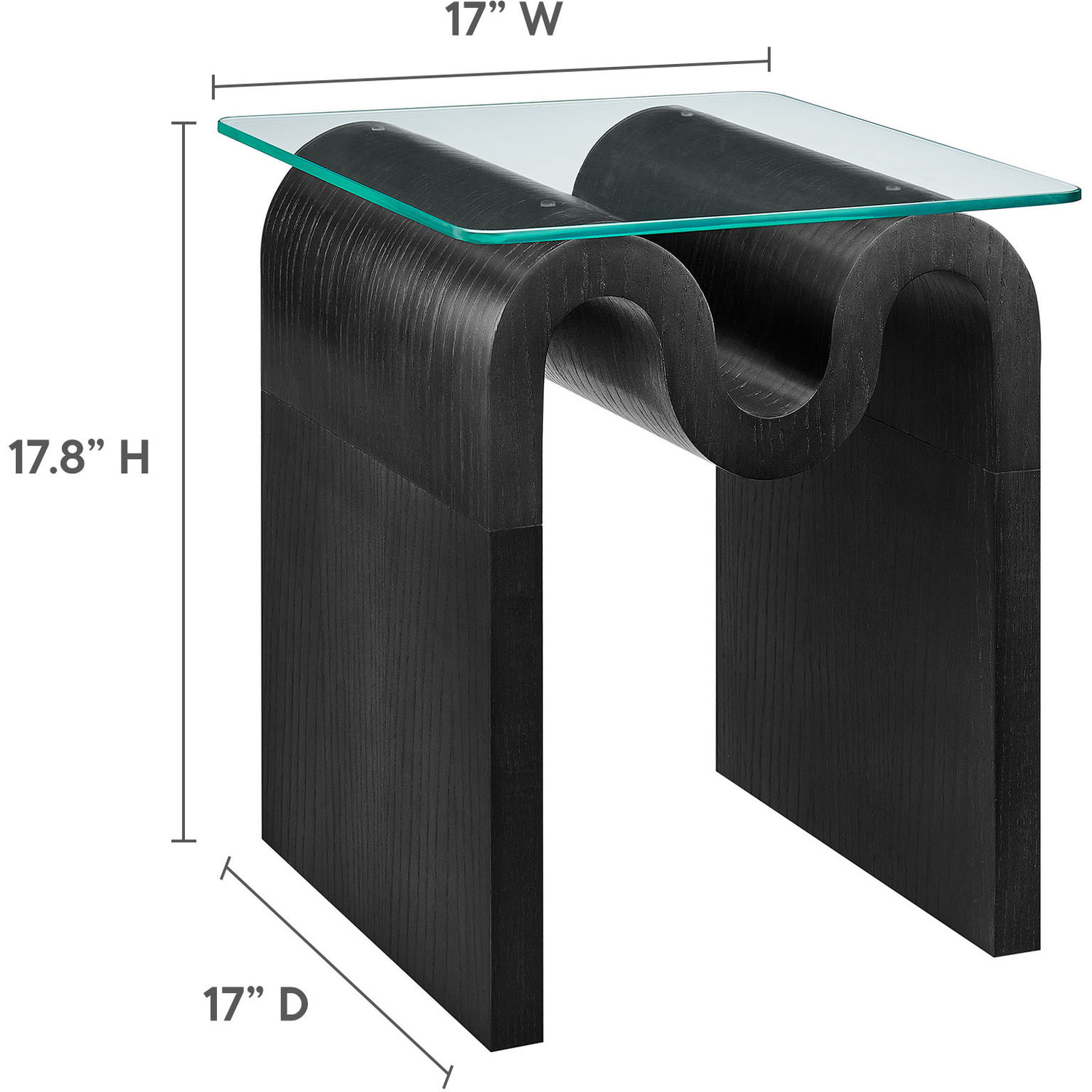 The Ondine Glass Top Side Table stands out with its unique retro design, adding an artistic touch to any space. Its trendy frame, shaped in a bold wave-like form across the top, is crafted from durable materials and finished with a natural ash veneer, providing a rich, textured look or a solid color finish to add some flair to your space. The squiggle-shaped foundation of this minimalist end table brings a sense of movement and fluidity, beautifully contrasted by the clear tempered glass top above it. The glass surface allows the wavy base to remain fully visible, making it the focal point of the design. The rounded edges on this glass side table adds softness to the overall aesthetic, while the clear plastic anti-skid grips offer stability to ensure the glass is secure. The Ondine square accent table is equipped with leveling, non-marking feet that keep the clear side table securely in place without damaging your floors. Whether used as a small drink table in the living room, a plant stand or a boho glass nightstand, this vintage style side table serves as a conversation piece and complements both contemporary and vintage-inspired decor. Glass Accent Side Table Weight Capacity: 88 lbs.Unique Wave-like Shape