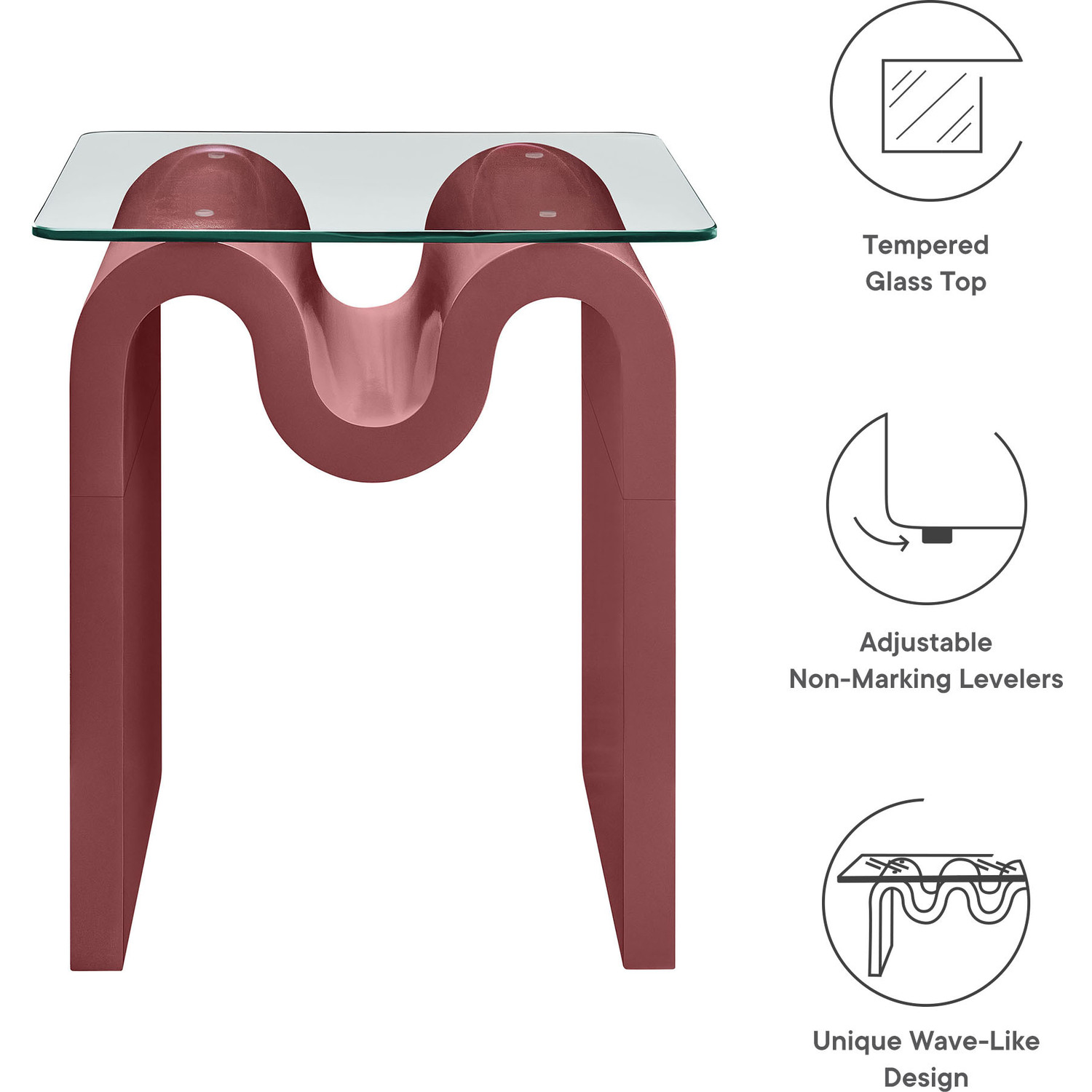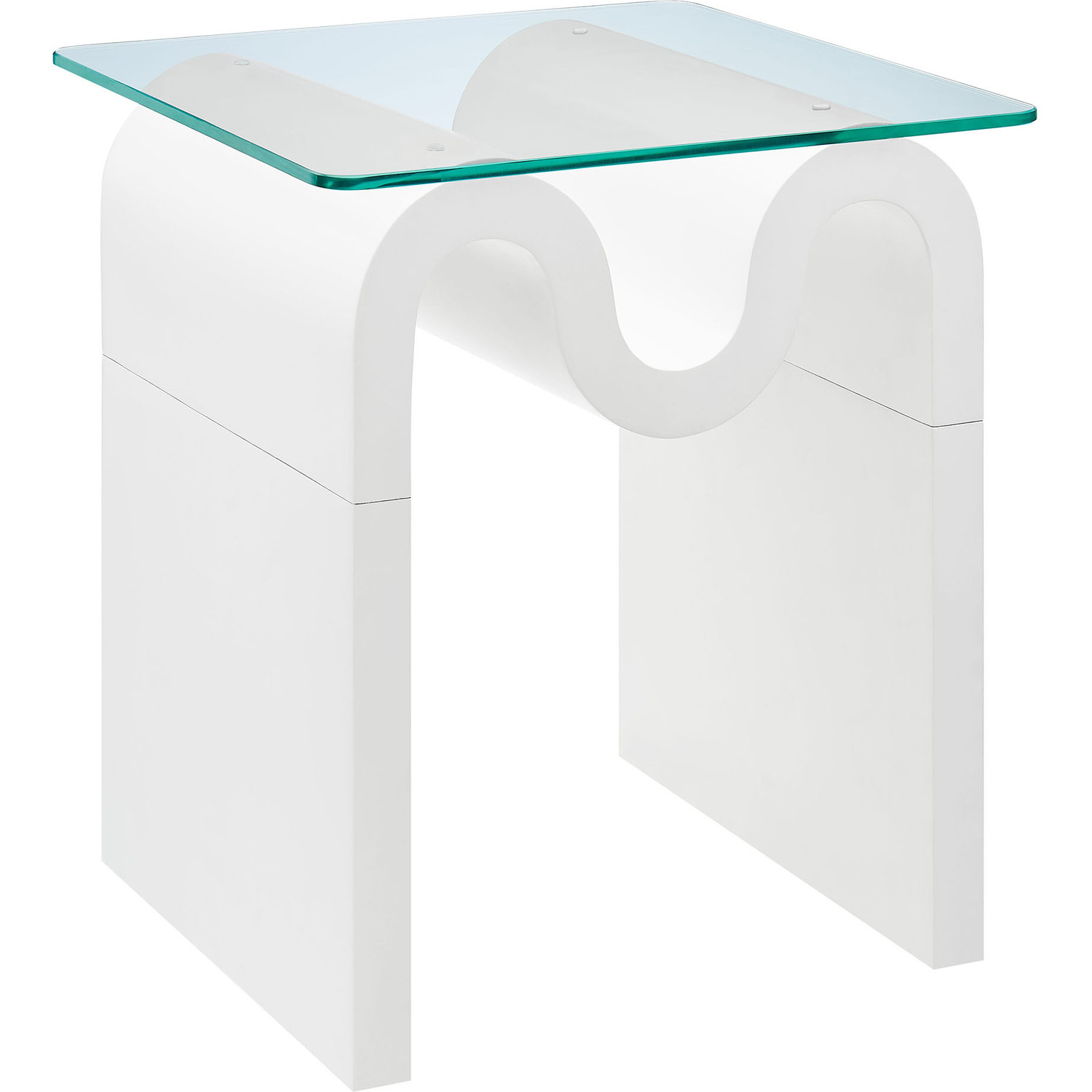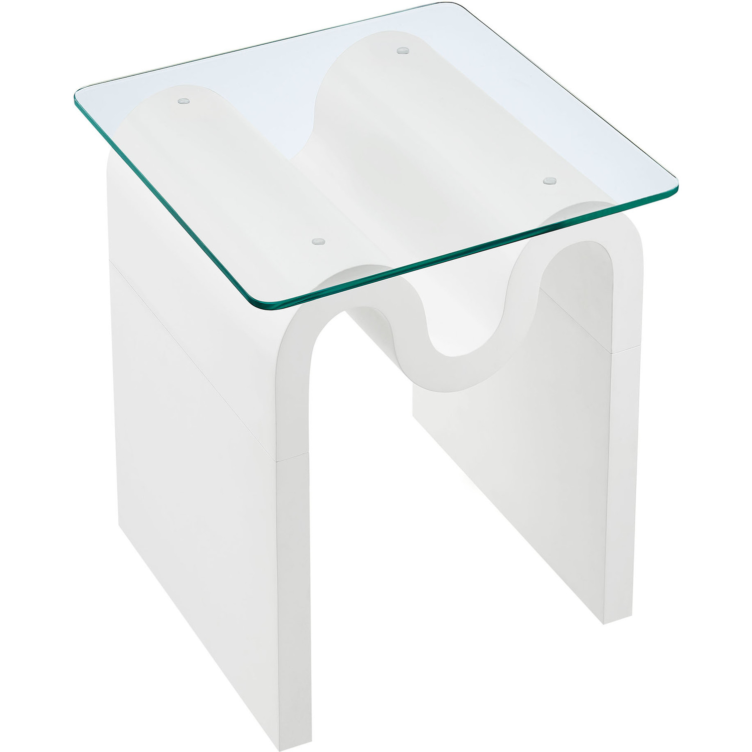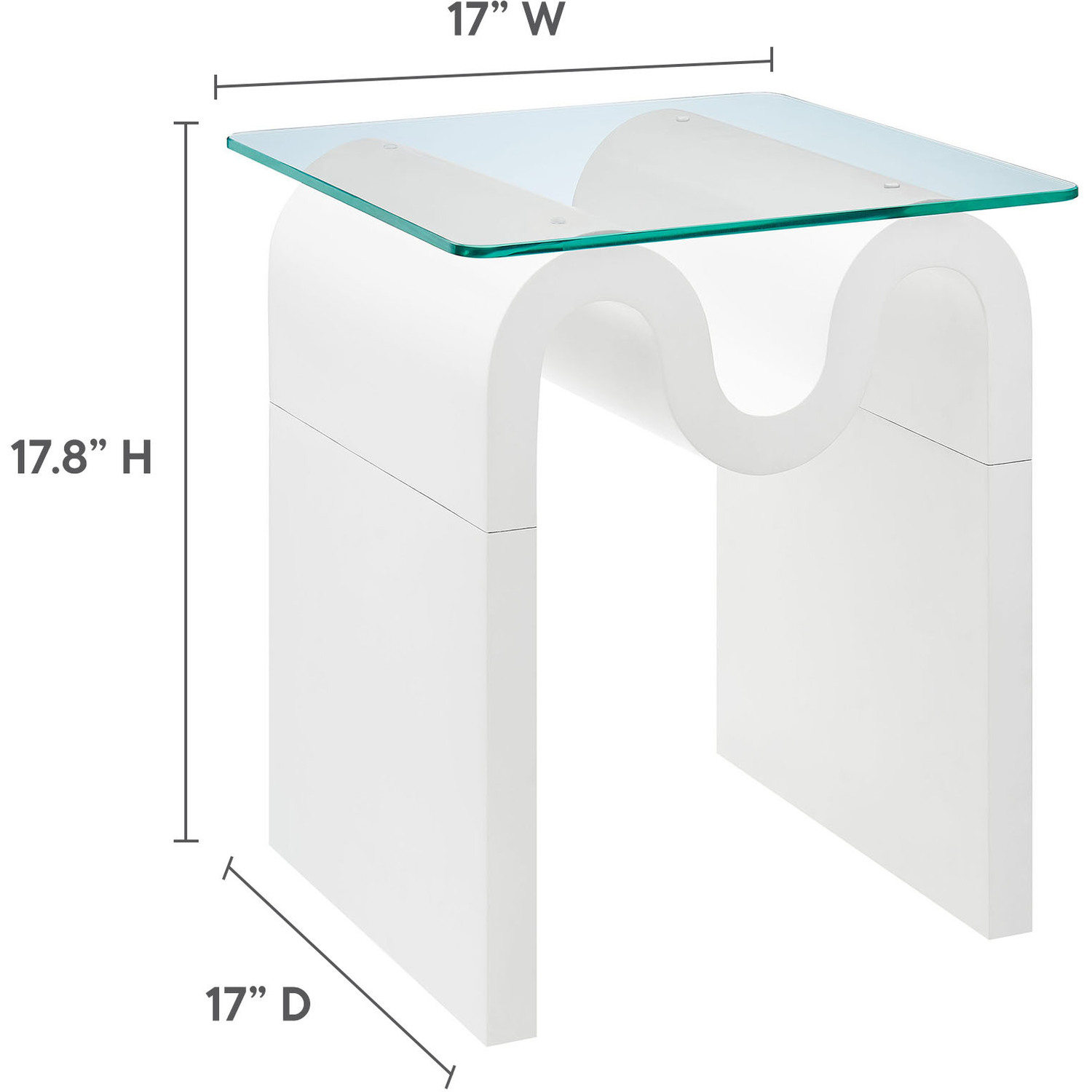 The Ondine Glass Top Side Table stands out with its unique retro design, adding an artistic touch to any space. Its trendy frame, shaped in a bold wave-like form across the top, is crafted from durable materials and finished with a natural ash veneer, providing a rich, textured look or a solid color finish to add some flair to your space. The squiggle-shaped foundation of this minimalist end table brings a sense of movement and fluidity, beautifully contrasted by the clear tempered glass top above it. The glass surface allows the wavy base to remain fully visible, making it the focal point of the design. The rounded edges on this glass side table adds softness to the overall aesthetic, while the clear plastic anti-skid grips offer stability to ensure the glass is secure. The Ondine square accent table is equipped with leveling, non-marking feet that keep the clear side table securely in place without damaging your floors. Whether used as a small drink table in the living room, a plant stand or a boho glass nightstand, this vintage style side table serves as a conversation piece and complements both contemporary and vintage-inspired decor. Glass Accent Side Table Weight Capacity: 88 lbs.Unique Wave-like Shape