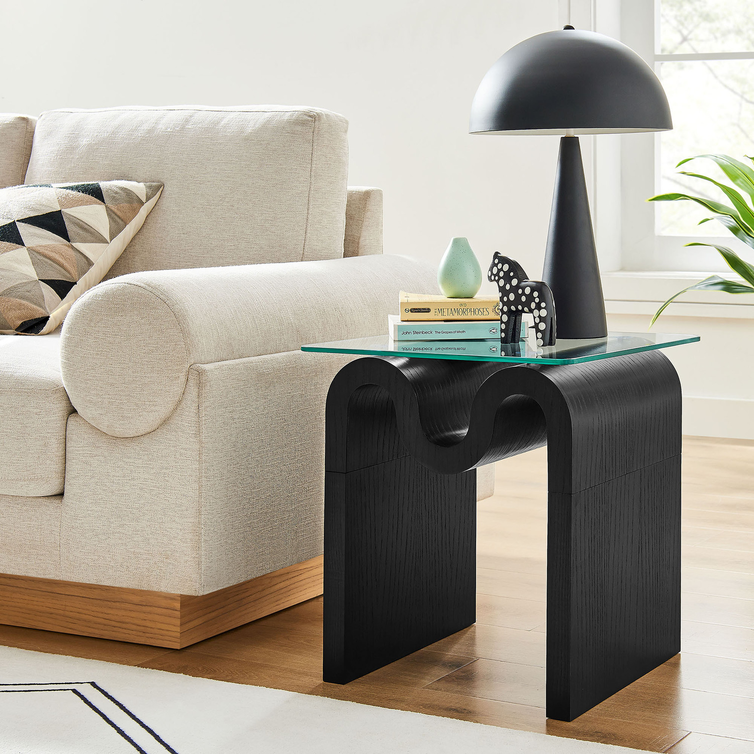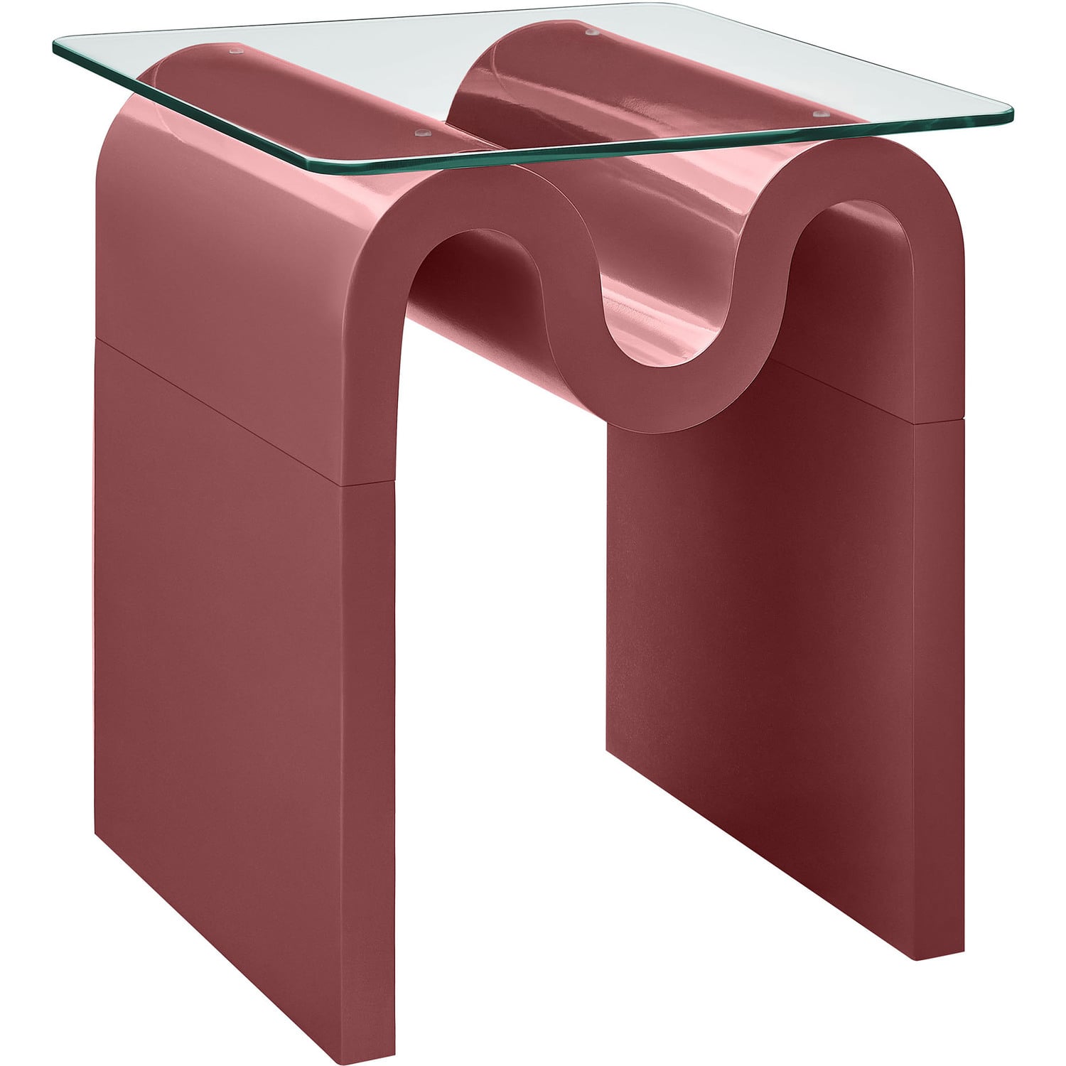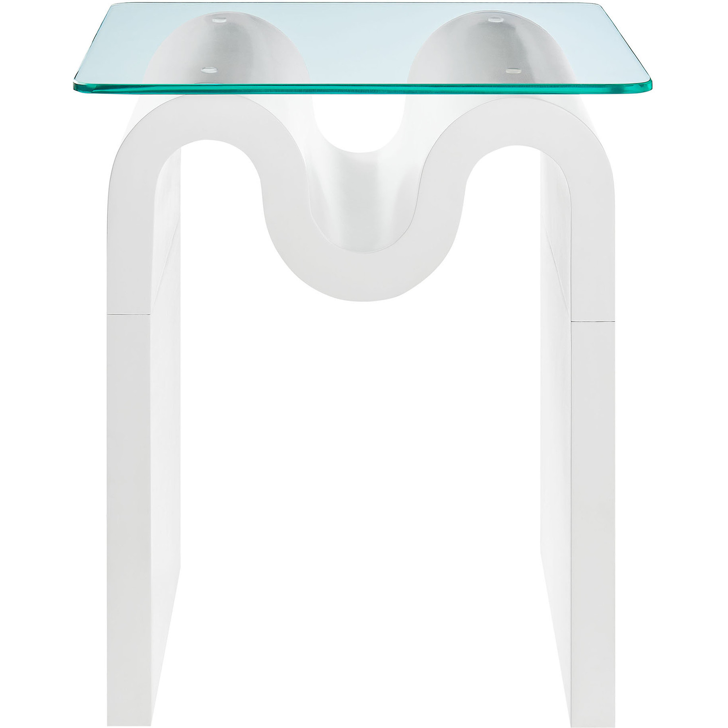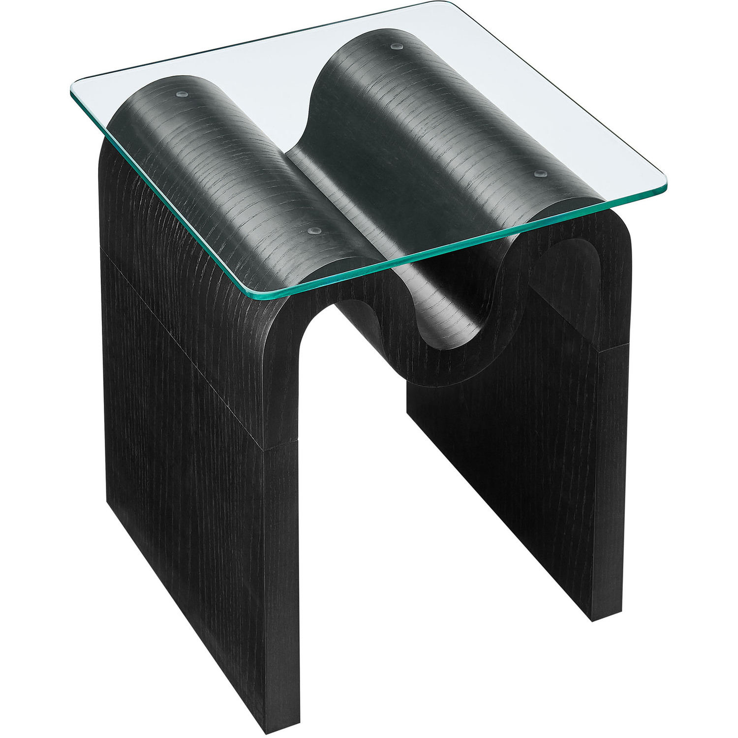 The Ondine Glass Top Side Table stands out with its unique retro design, adding an artistic touch to any space. Its trendy frame, shaped in a bold wave-like form across the top, is crafted from durable materials and finished with a natural ash veneer, providing a rich, textured look or a solid color finish to add some flair to your space. The squiggle-shaped foundation of this minimalist end table brings a sense of movement and fluidity, beautifully contrasted by the clear tempered glass top above it. The glass surface allows the wavy base to remain fully visible, making it the focal point of the design. The rounded edges on this glass side table adds softness to the overall aesthetic, while the clear plastic anti-skid grips offer stability to ensure the glass is secure. The Ondine square accent table is equipped with leveling, non-marking feet that keep the clear side table securely in place without damaging your floors. Whether used as a small drink table in the living room, a plant stand or a boho glass nightstand, this vintage style side table serves as a conversation piece and complements both contemporary and vintage-inspired decor. Glass Accent Side Table Weight Capacity: 88 lbs.Unique Wave-like Shape