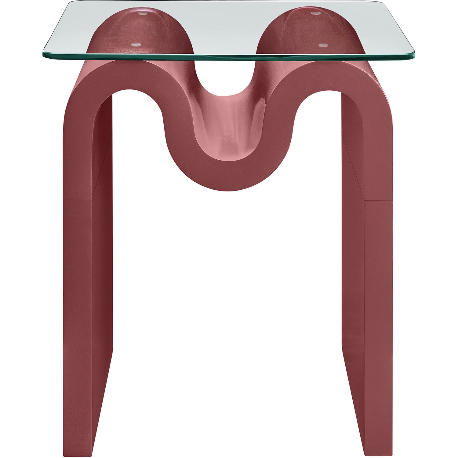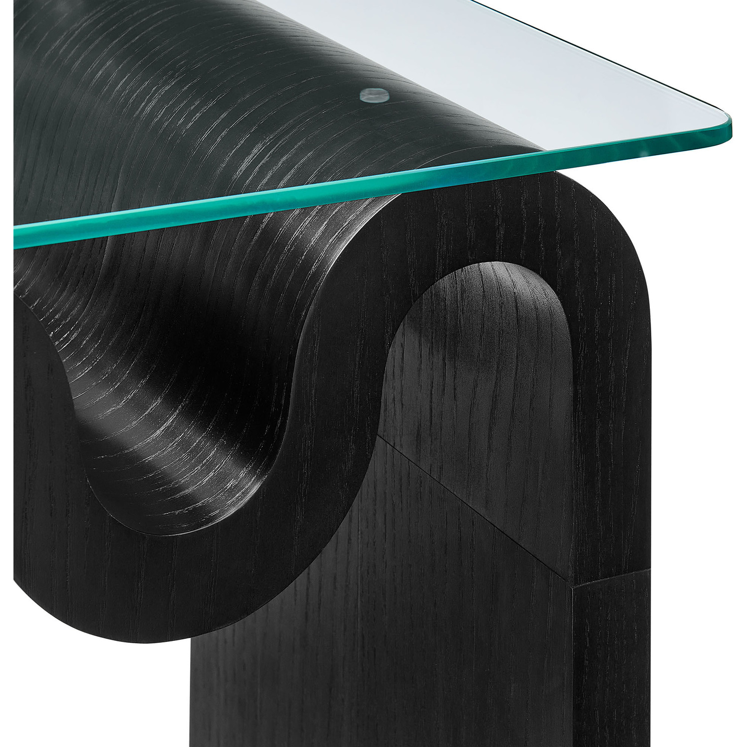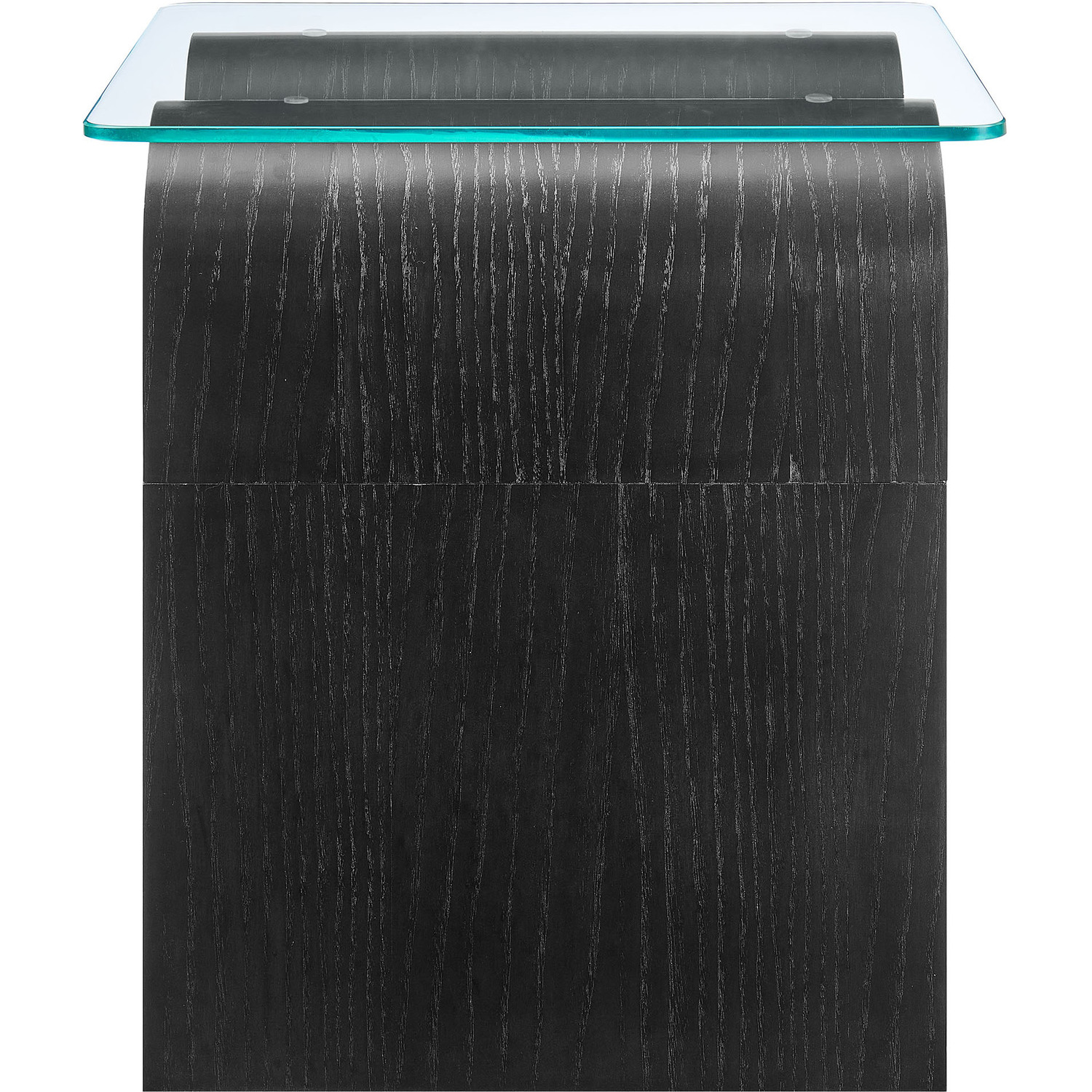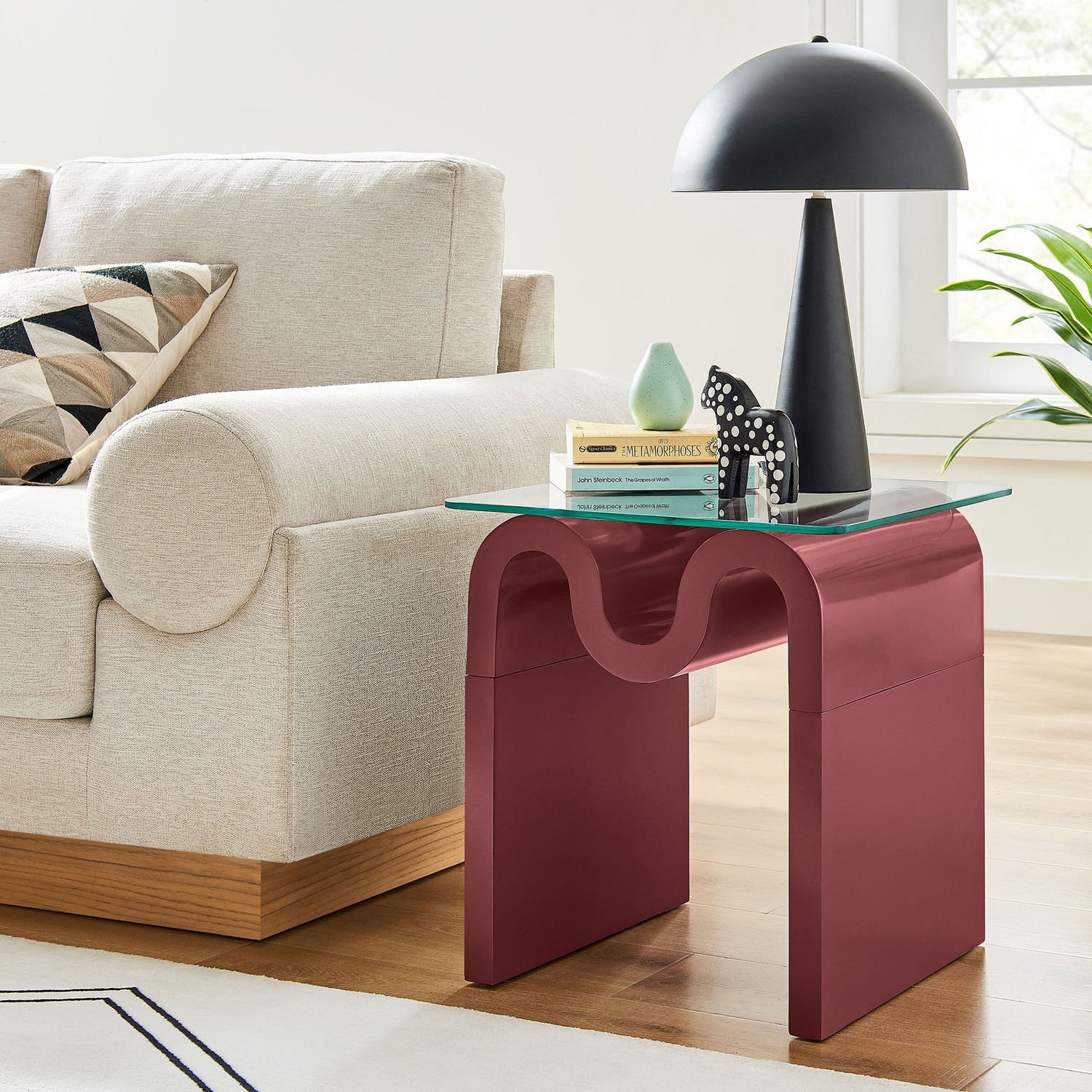 The Ondine Glass Top Side Table stands out with its unique retro design, adding an artistic touch to any space. Its trendy frame, shaped in a bold wave-like form across the top, is crafted from durable materials and finished with a natural ash veneer, providing a rich, textured look or a solid color finish to add some flair to your space. The squiggle-shaped foundation of this minimalist end table brings a sense of movement and fluidity, beautifully contrasted by the clear tempered glass top above it. The glass surface allows the wavy base to remain fully visible, making it the focal point of the design. The rounded edges on this glass side table adds softness to the overall aesthetic, while the clear plastic anti-skid grips offer stability to ensure the glass is secure. The Ondine square accent table is equipped with leveling, non-marking feet that keep the clear side table securely in place without damaging your floors. Whether used as a small drink table in the living room, a plant stand or a boho glass nightstand, this vintage style side table serves as a conversation piece and complements both contemporary and vintage-inspired decor. Glass Accent Side Table Weight Capacity: 88 lbs.Unique Wave-like Shape