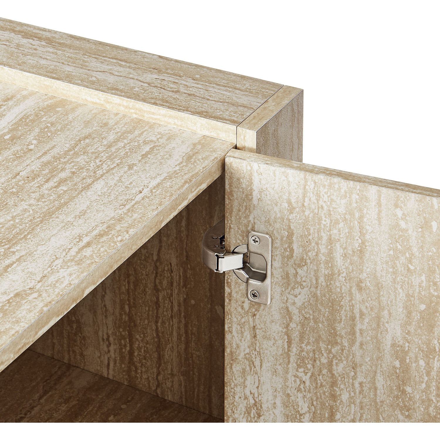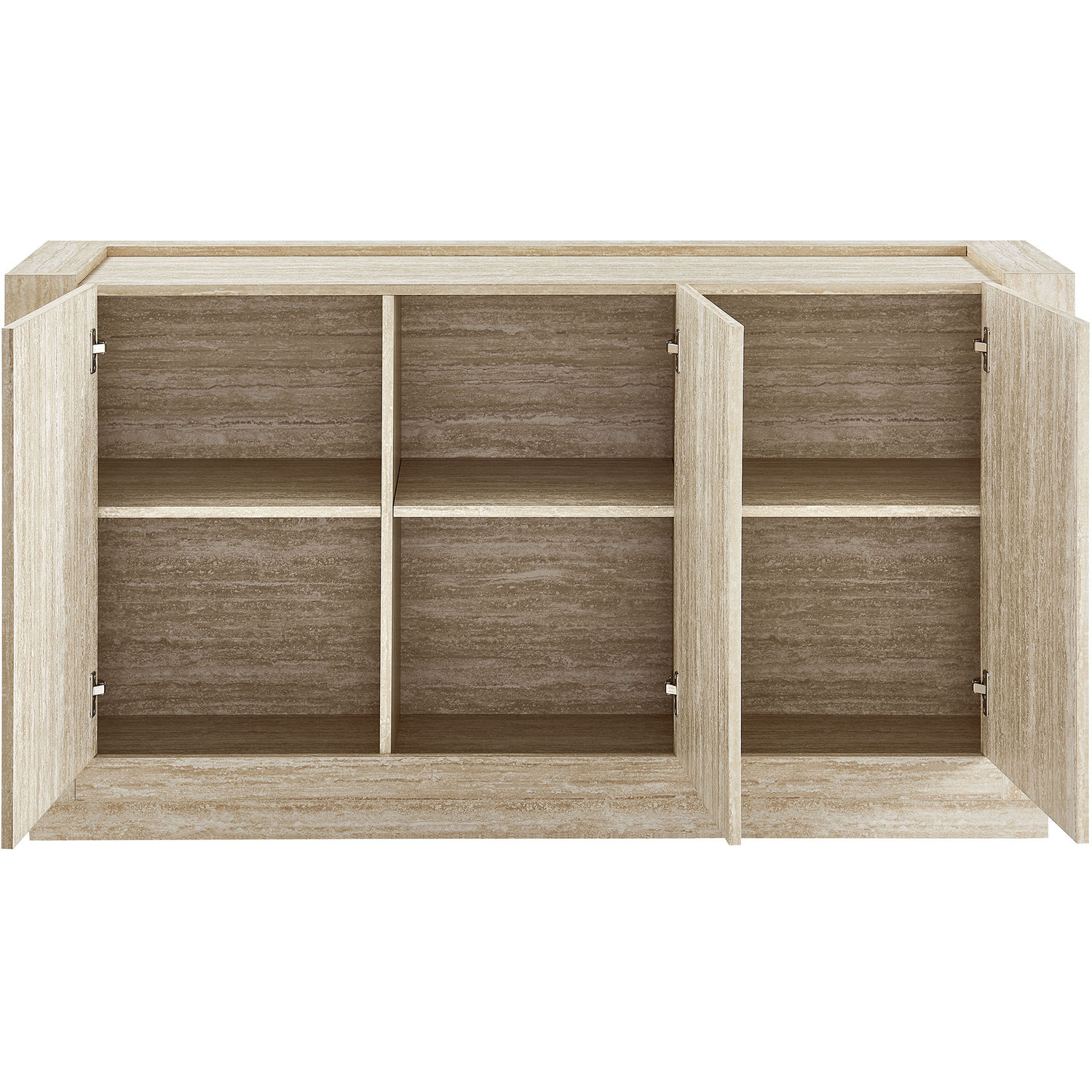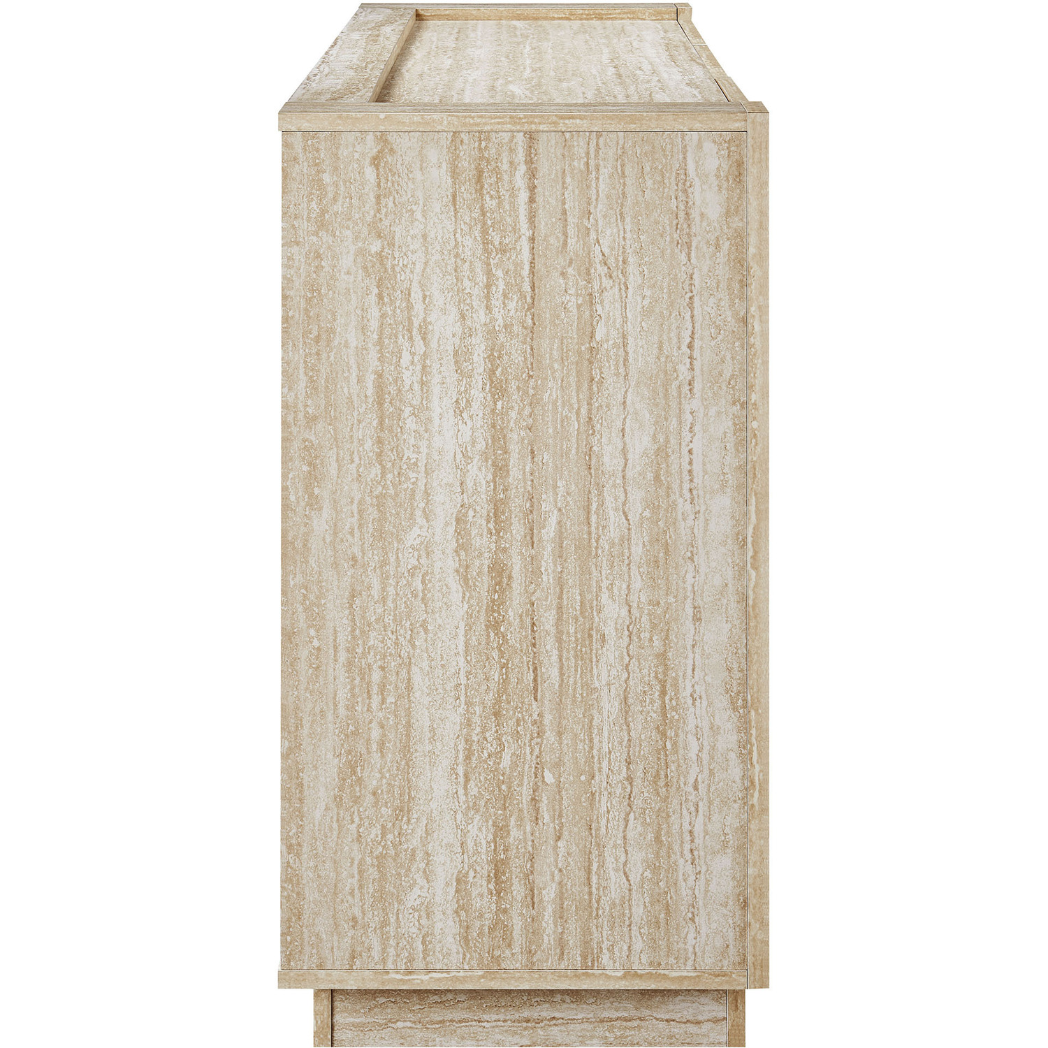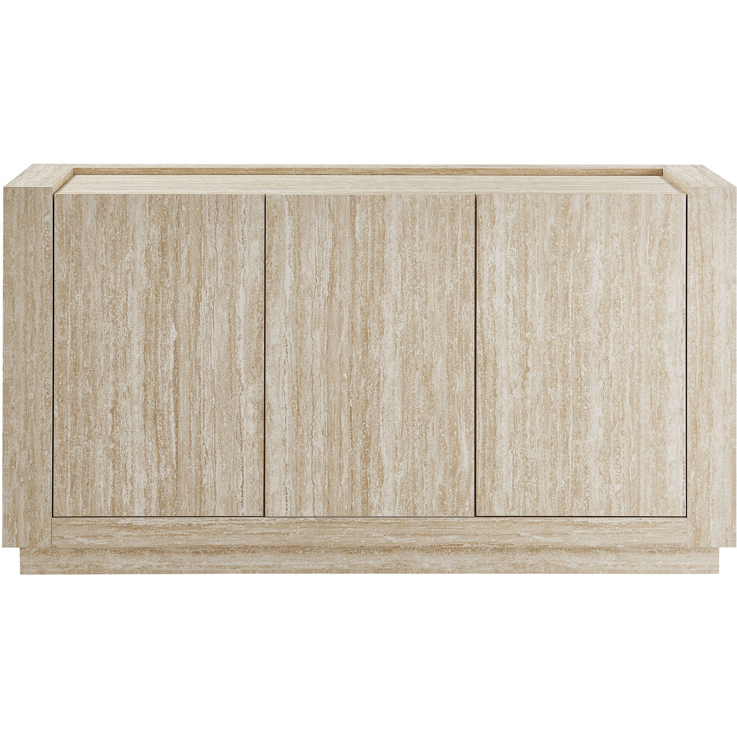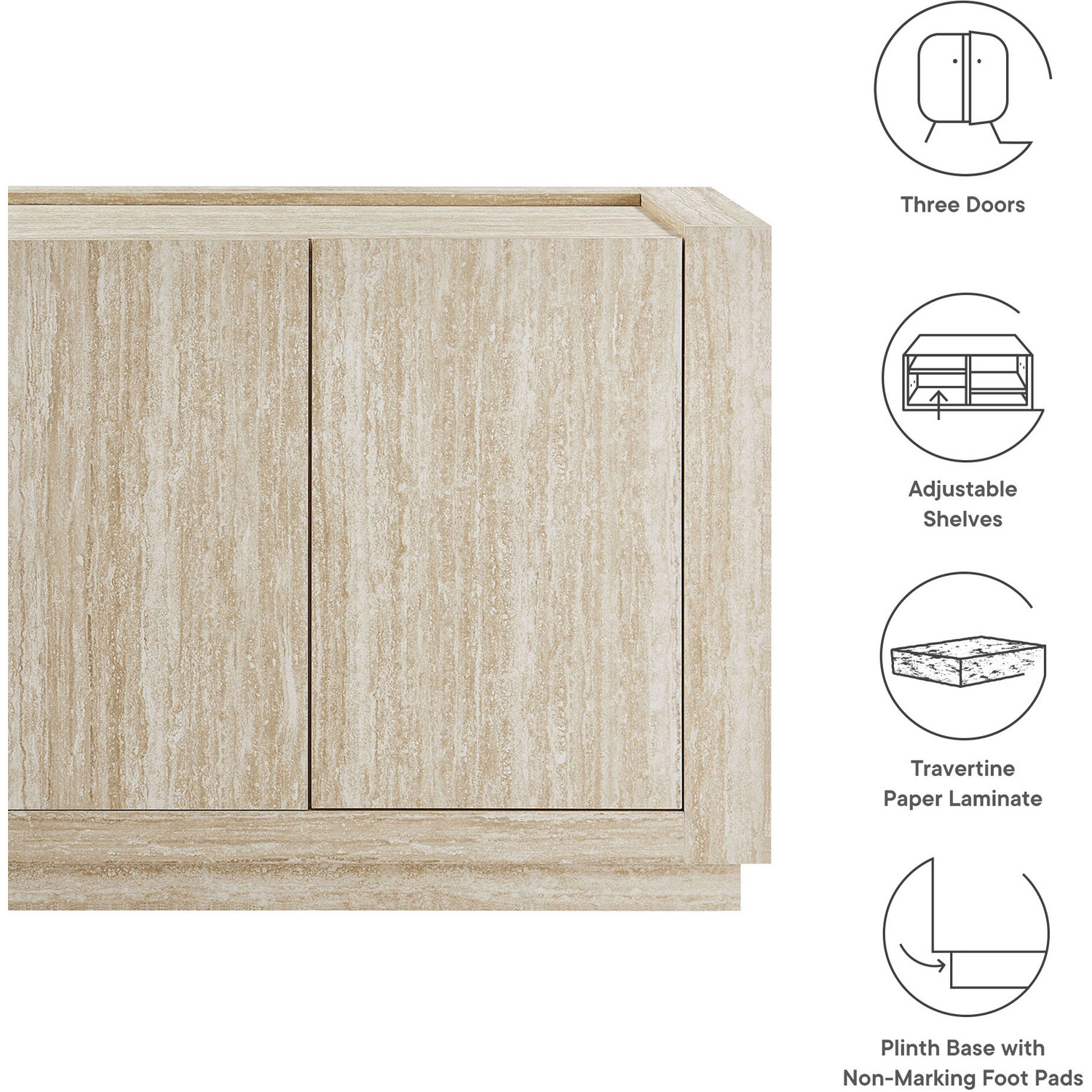 Bring a fresh look to your home with the Hollis Sideboard, a 59-inch cabinet designed to balance functionality and style. Featuring a sleek travertine laminate finish, this sideboard with 3 doors provides ample storage for all your needs, making it a stunning cabinet storage sideboard for your living room or entryway or even a tall TV cabinet for your anchored or wall-mounted TV. The spacious interior includes adjustable shelves, allowing you to customize the storage to suit dinnerware, media essentials, decor, and more. The large storage cabinet structure of this faux travertine sideboard naturally fits into any setting, offering both style and practical storage. Its plinth base and non-marking foot pads ensure stability and floor protection, offering a beautiful storage credenza that compliments your home’s decor. Whether you’re looking for a chic sideboard with storage or a dining room buffet cabinet, Hollis is the storage solution you need every day to keep your space tidy and organized. Top Panel Weight Capacity: 271 lbs, Shelves: 44 lbs.59" Sideboard