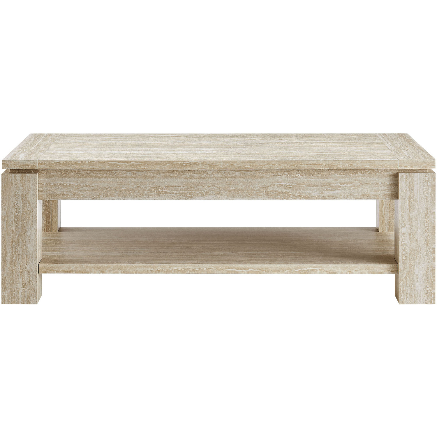 Bring a fresh look to your home with the Hollis Coffee Table, a contemporary rectangular table designed to balance functionality and style. Featuring a faux travertine laminate finish, this coffee table serves as the perfect centerpiece for your living room. It has a spacious lower shelf, providing a convenient spot to store books, magazines, or decor while keeping your tabletop clutter-free. Its thick, square legs provide sturdy support and add to its bold design, while non-marking foot pads ensure stability and floor protection. The Hollis low profile coffee table is great for everyday use, with a chic design that complements your home’s decor. Top Panel Weight Capacity: 302 lbs. Lower Shelf: 264 lbs.Rectangle Coffee Table
