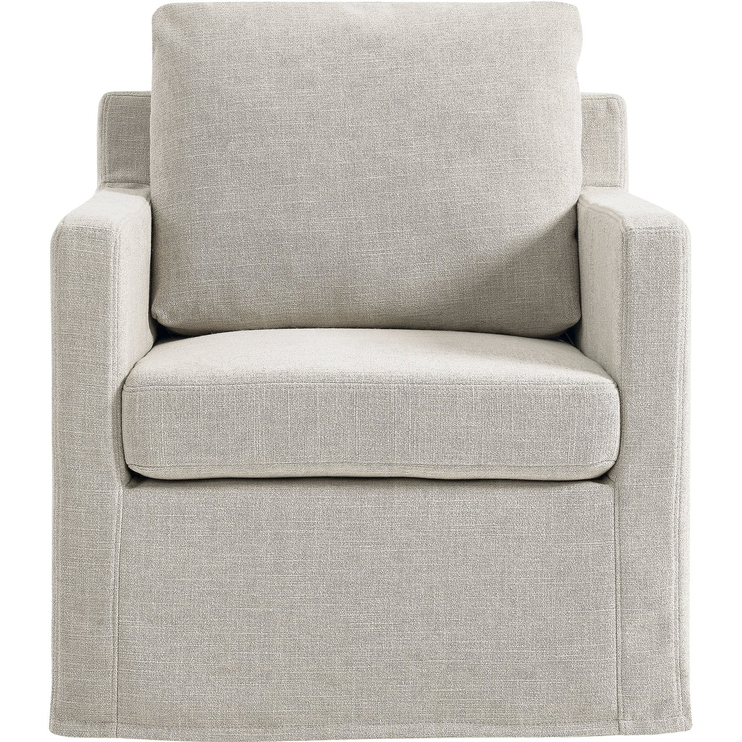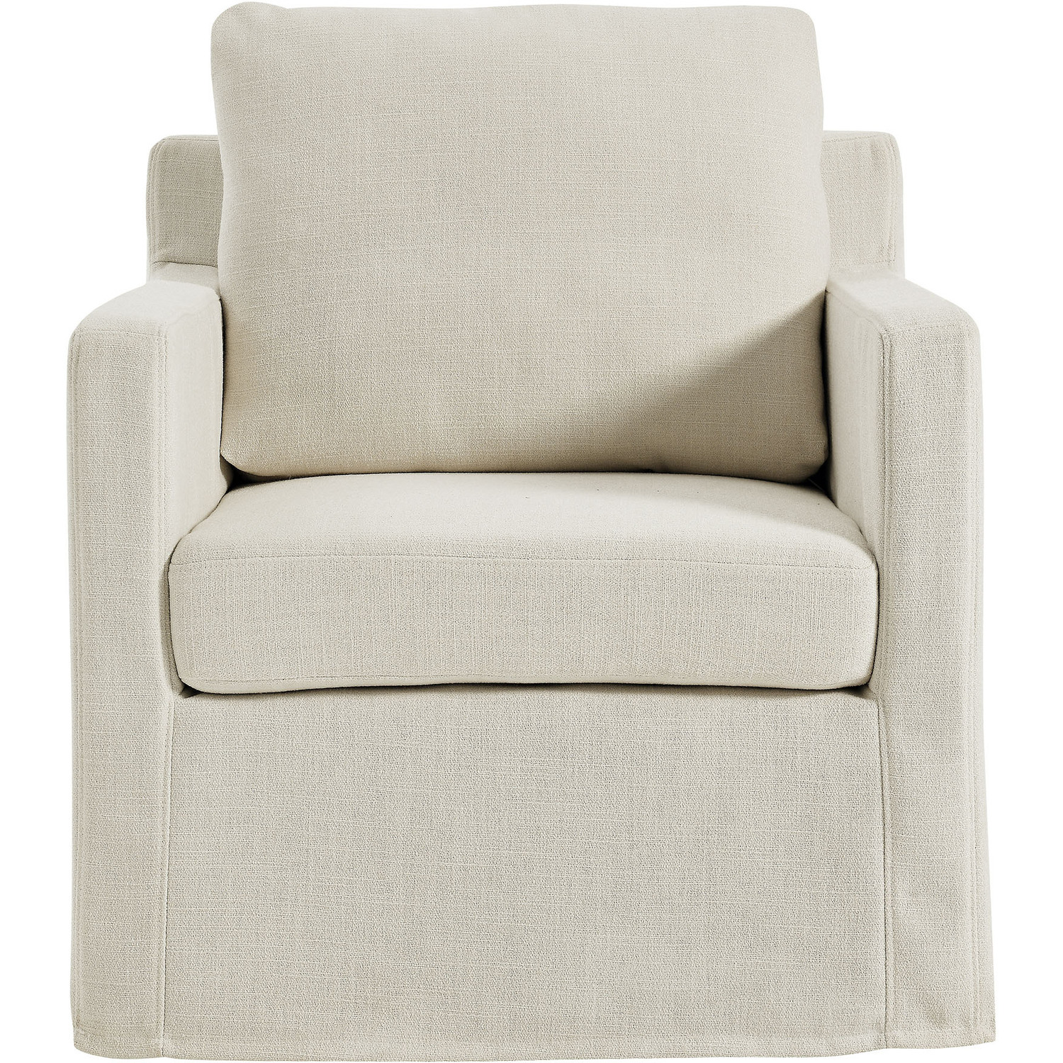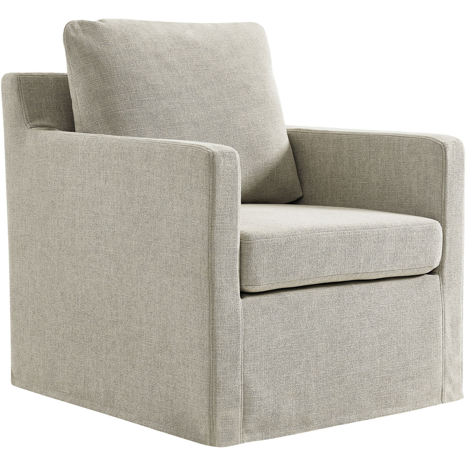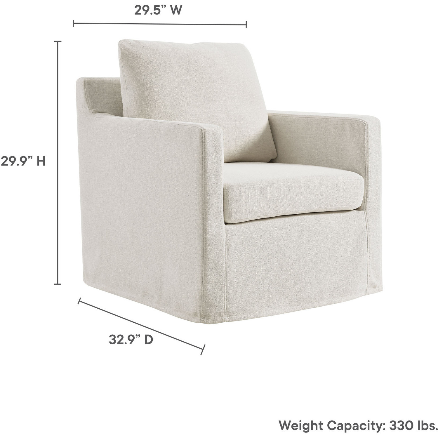 The Serene Slipcovered Swivel Armchair seamlessly combines modern elegance with superior comfort. Upholstered in premium fabric, this upholstered accent chair features a removable, washable slipcover, making cleaning and maintenance a breeze. The swivel chair’s crisp lines and tailored profile enhance any decor style, fitting well in both home and office environments. Enjoy a smooth 360-degree swivel with this modern fabric chair, supported by a robust yet discreet iron base with non-marking floor glides to protect your floors. Dense foam padding and removable cushions provide luxurious comfort and support. Perfect as a stylish accent piece, this slipcovered armchair is a versatile and functional addition to any space in your home. Whether used as an accent chair for bedroom or swivel chair for living room, it showcases a chic and modern look with its polyester upholstery and generous cushioning. Assembly required. Weight Capacity: 330 lbs.Modern Swivel Armchair