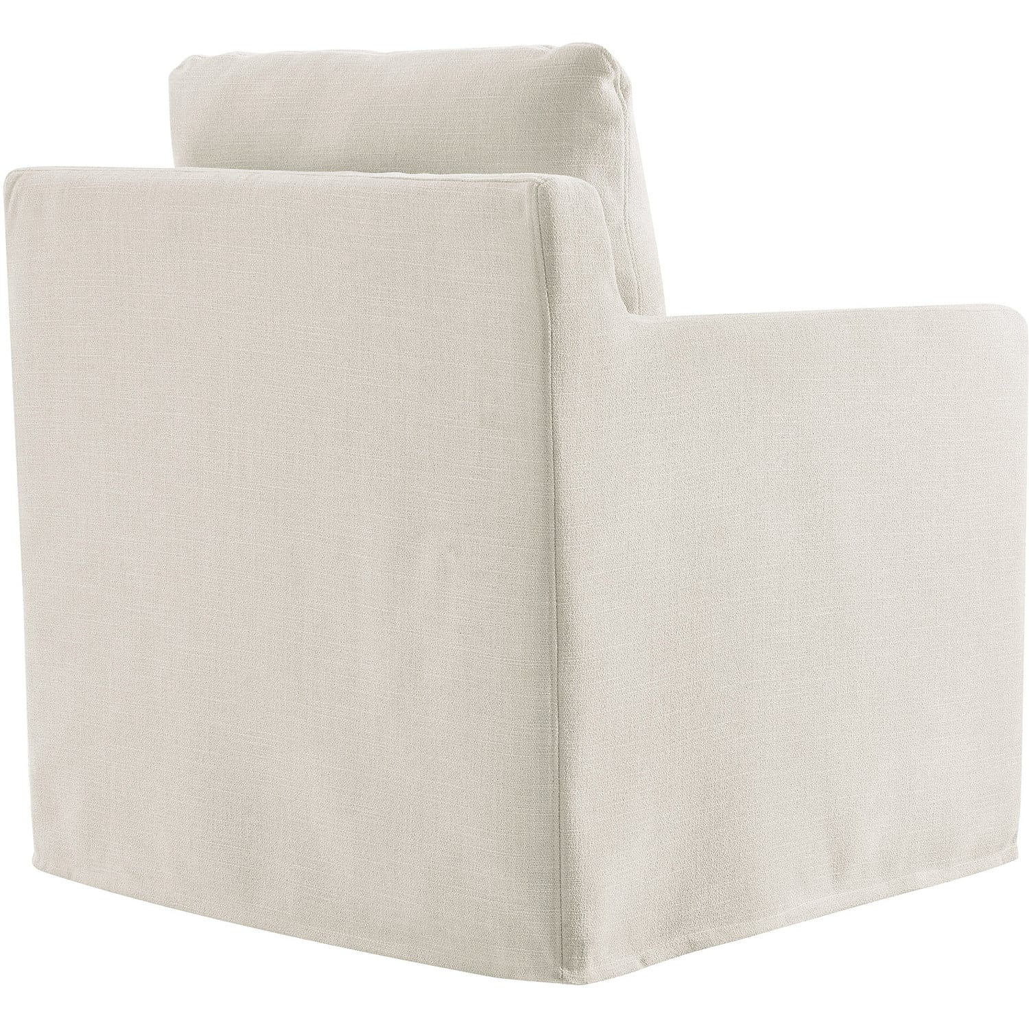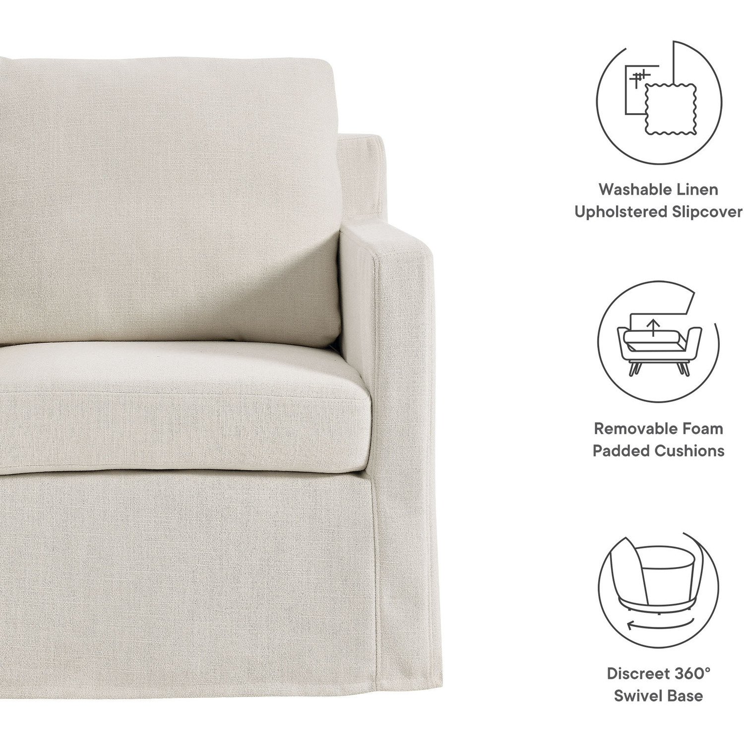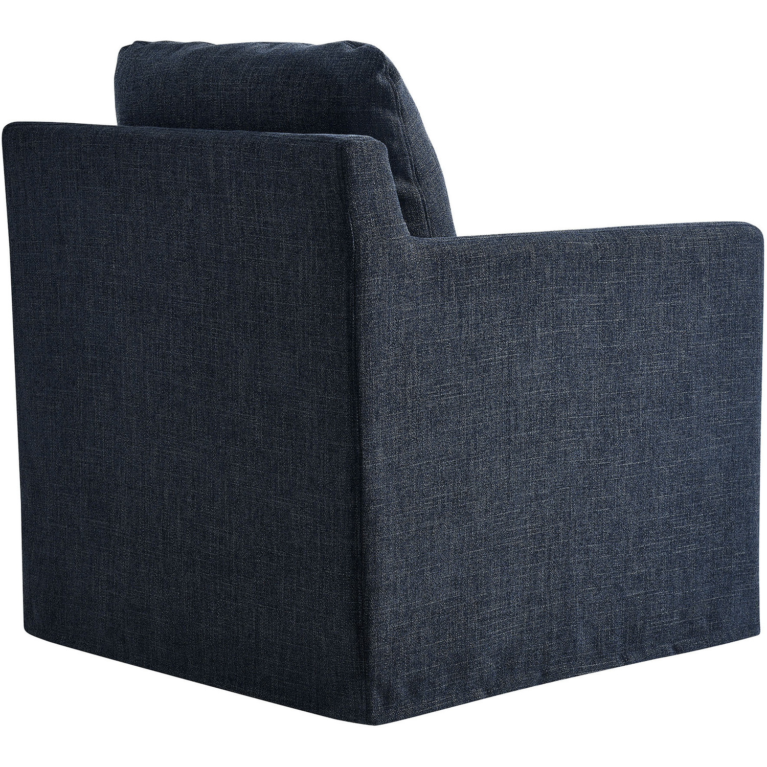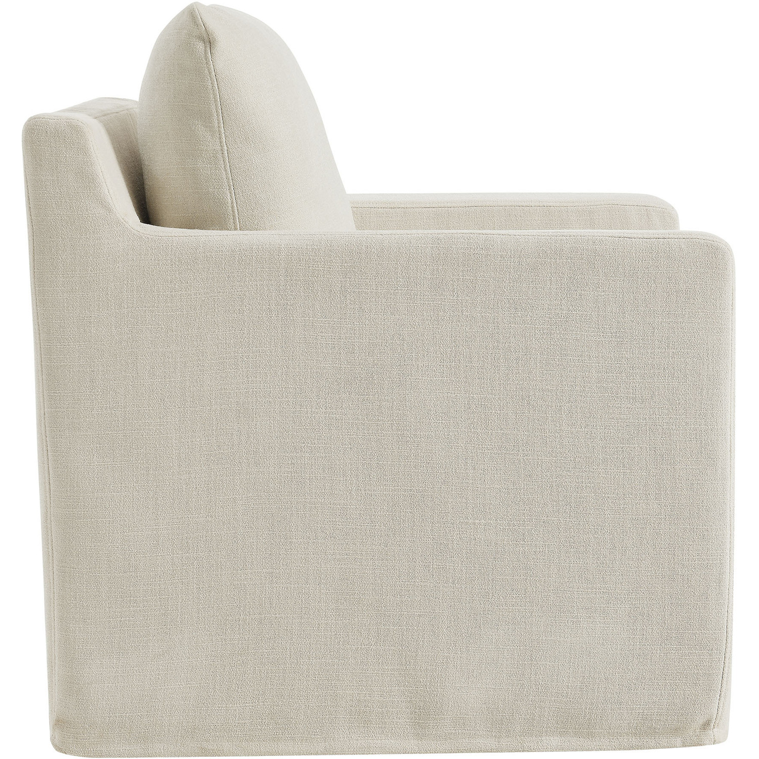 The Serene Slipcovered Swivel Armchair seamlessly combines modern elegance with superior comfort. Upholstered in premium fabric, this upholstered accent chair features a removable, washable slipcover, making cleaning and maintenance a breeze. The swivel chair’s crisp lines and tailored profile enhance any decor style, fitting well in both home and office environments. Enjoy a smooth 360-degree swivel with this modern fabric chair, supported by a robust yet discreet iron base with non-marking floor glides to protect your floors. Dense foam padding and removable cushions provide luxurious comfort and support. Perfect as a stylish accent piece, this slipcovered armchair is a versatile and functional addition to any space in your home. Whether used as an accent chair for bedroom or swivel chair for living room, it showcases a chic and modern look with its polyester upholstery and generous cushioning. Assembly required. Weight Capacity: 330 lbs.Modern Swivel Armchair
