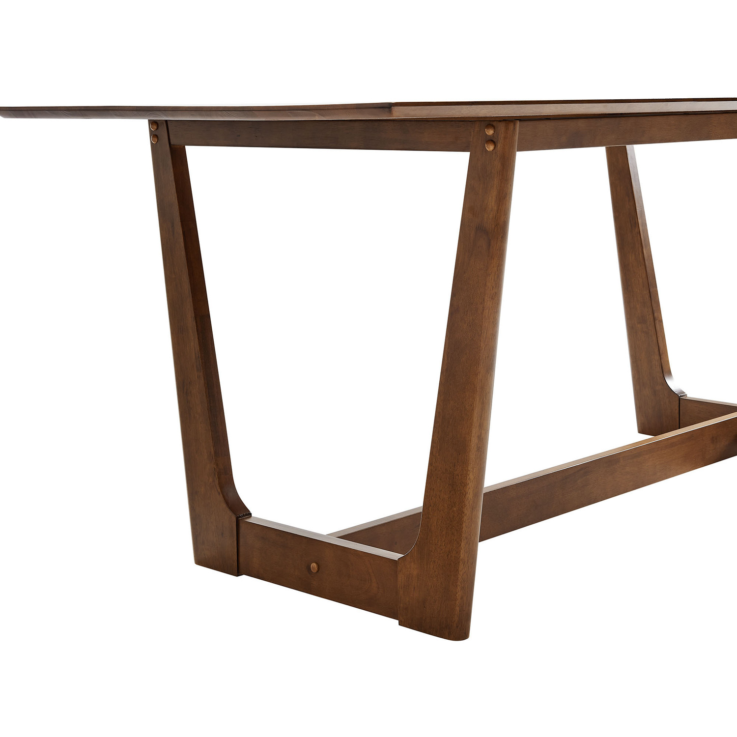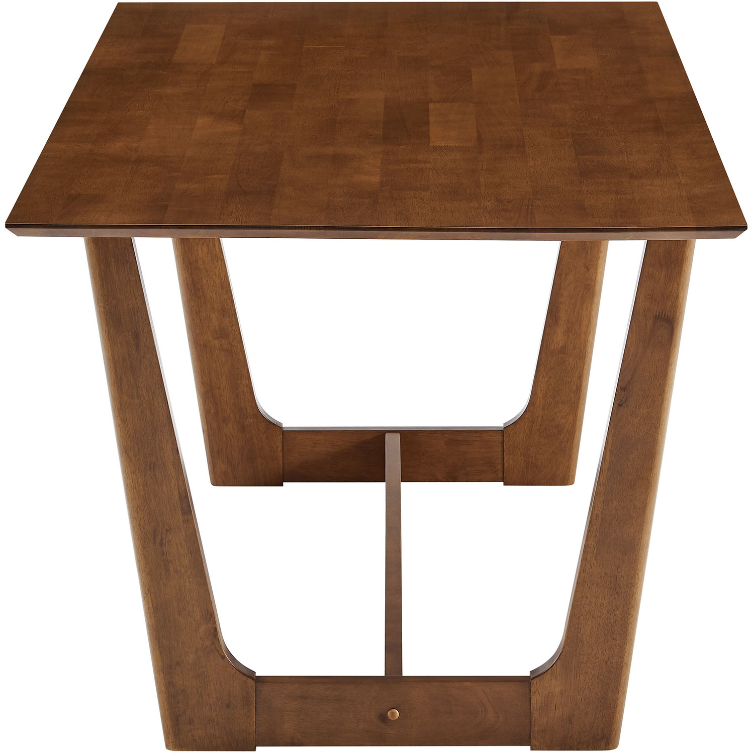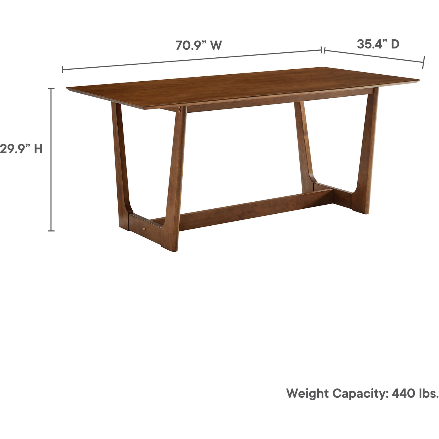 Adorn your dining space with the Solara Wood Dining Table. Seating six comfortably, this 71" dining table is crafted from premium rubberwood. The natural wood finish highlights the rich grain patterns, offering a warm, inviting rectangle table for meals and gatherings. This modern kitchen table's legs are a standout feature with a unique, modern look. Each leg angles outward from the floor to the underside of the tabletop, forming a bold U shape. The legs are connected by a horizontal support beam, which adds stability and strength to the mid-century modern table’s design. Perfect for use in the kitchen or dining room, this 6-person dining table provides ample legroom and a smooth, easy-to-clean tabletop, and can also double as a conference table for your home office. Make the Solara Minimalist Dining Table the centerpiece of your home, combining ageless beauty with everyday practicality. Assembly is simple with clear instructions. Weight Capacity: 440 lbs.71" Rubberwood Dining Table