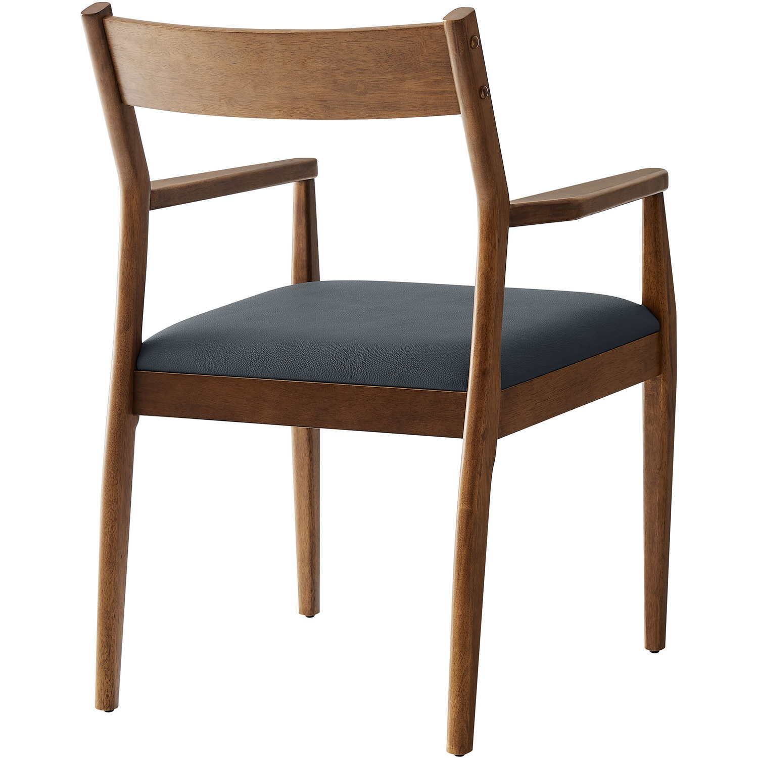 Adorn your dining space with the Solara Vegan Leather and Wood Dining Armchairs. This set of 2 dining accent chairs is crafted from premium rubberwood with a natural wood finish that highlights the rich grain patterns, offering a warm, inviting seating option for meals and gatherings. Designed with a faux leather upholstered seat, these furniture chairs combine comfort with a stylish, sustainable design. Standing on sleek, modern legs that taper gracefully to the floor, the Solara dining table chairs are minimalist yet sturdy. The slim and mid-century modern design of the backrest and arms adds to their simple, sophisticated silhouette, allowing them to easily fit into any contemporary decor. Ideal as both wood kitchen chairs or dining room table chairs, these comfortable faux leather chairs set of 2 can also serve as stylish office chairs for your study. Make the Solara Minimalist Chairs your go-to cushioned dining armchairs, combining mid-century modern beauty with everyday practicality. Assembly is simple with clear instructions. Weight Capacity: 507 lbs.Rubberwood Dining Armchairs Set of 2