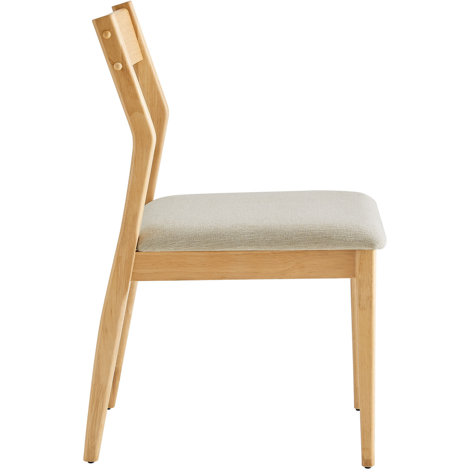 Adorn your dining space with the Solara Wood Armless Dining Chairs. This set of 2 fabric accent chairs is crafted from premium rubberwood with a natural wood finish that highlights the rich grain patterns, offering a warm, inviting seating option for meals and gatherings. Designed with a woven heathered fabric upholstered seat, these furniture chairs combine comfort with a stylish, textured look. Standing on sleek, modern legs that taper gracefully to the floor, the Solara dining table chairs are minimalist yet sturdy. The slim and mid-century modern design of the backrest, combined with its armless frame, adds to its simple, sophisticated silhouette, allowing it to easily fit into any contemporary decor. Ideal as both wood kitchen chairs or dining room table chairs, these armless upholstered dining chairs set of 2 can also serve as stylish office chairs for your study. Make the Solara Minimalist Chairs your go-to cushioned dining side chairs, combining ageless beauty with everyday practicality. Assembly is simple with clear instructions. Weight Capacity: 507 lbs.Rubberwood Dining Side Chairs Set of 2