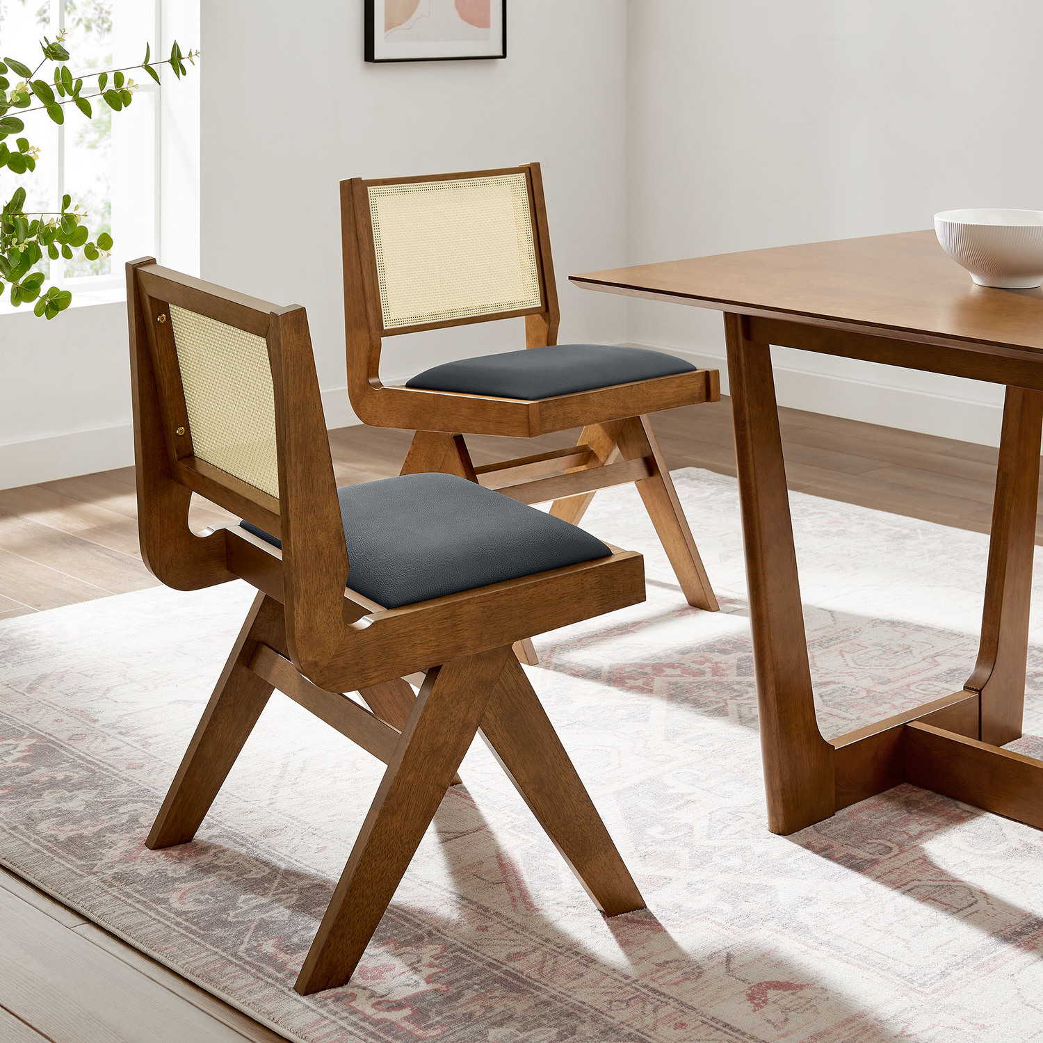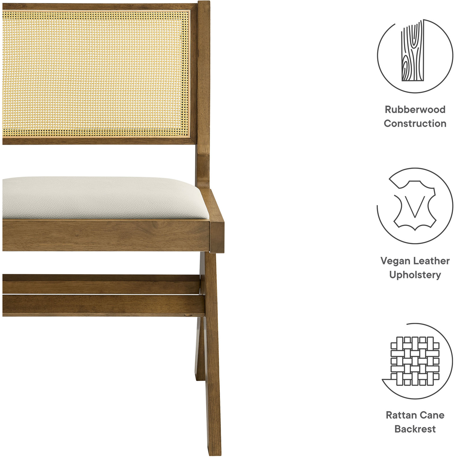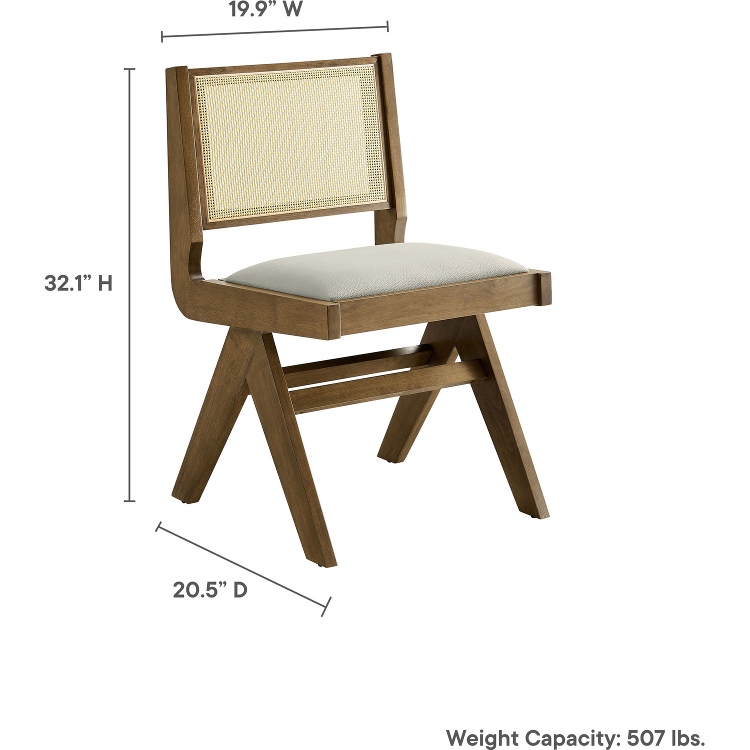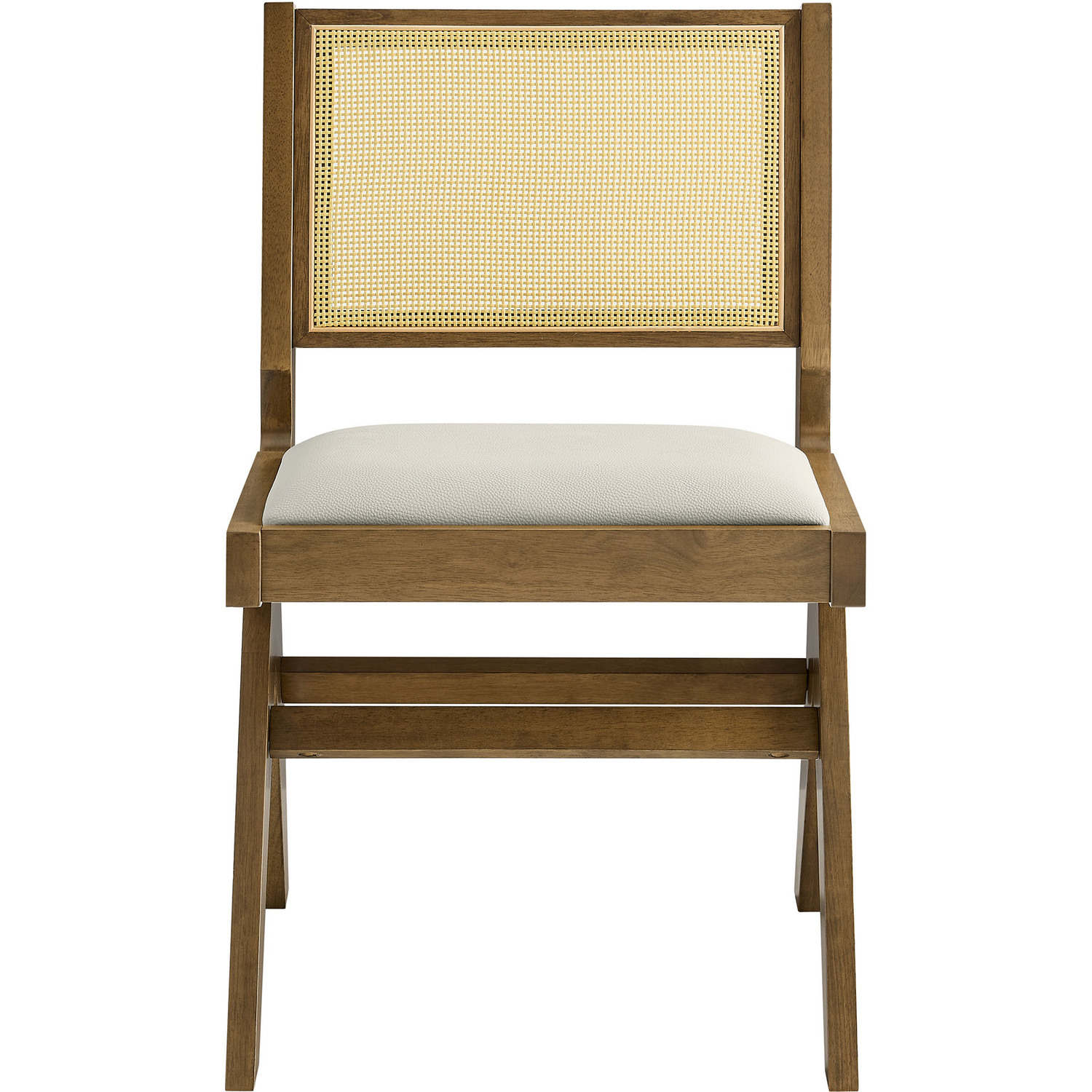 Update your dining decor with the modern allure of the Thera Set of 2 Armless Rattan Dining Chairs. Crafted with a durable rubberwood frame, these wood dining chairs seamlessly blend retro design with modern aesthetics, making them a stylish choice as dining table chairs or kitchen table chairs. Featuring plush faux leather seats and breathable rattan cane backs, the Thera mid century modern dining chairs provide an inviting mix of textures and materials. The armless design of each rattan chair creates a sleek, streamlined silhouette that not only looks great but also fits easily with any dining setup. The legs feature a striking A-frame design that splays outward for added stability, and include horizontal stretchers to enhance the chair's durability and contribute to its contemporary geometric aesthetic. Whether placed around a dining table or used as vegan leather accent chairs in the living room, the Thera cane dining chairs bring modern flair to any setting. Assembly required. Weight Capacity: 507 lbs.Set of 2 Dining Side Chairs
