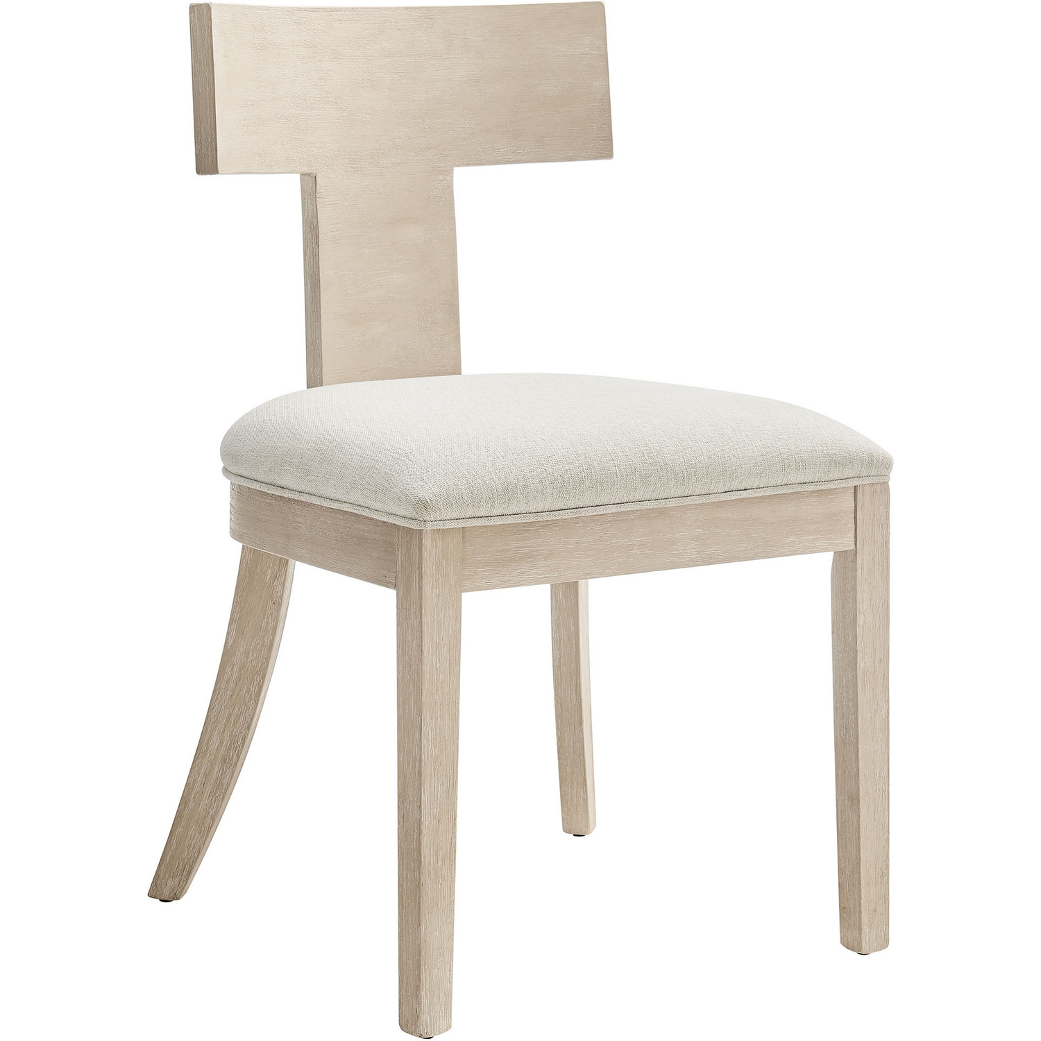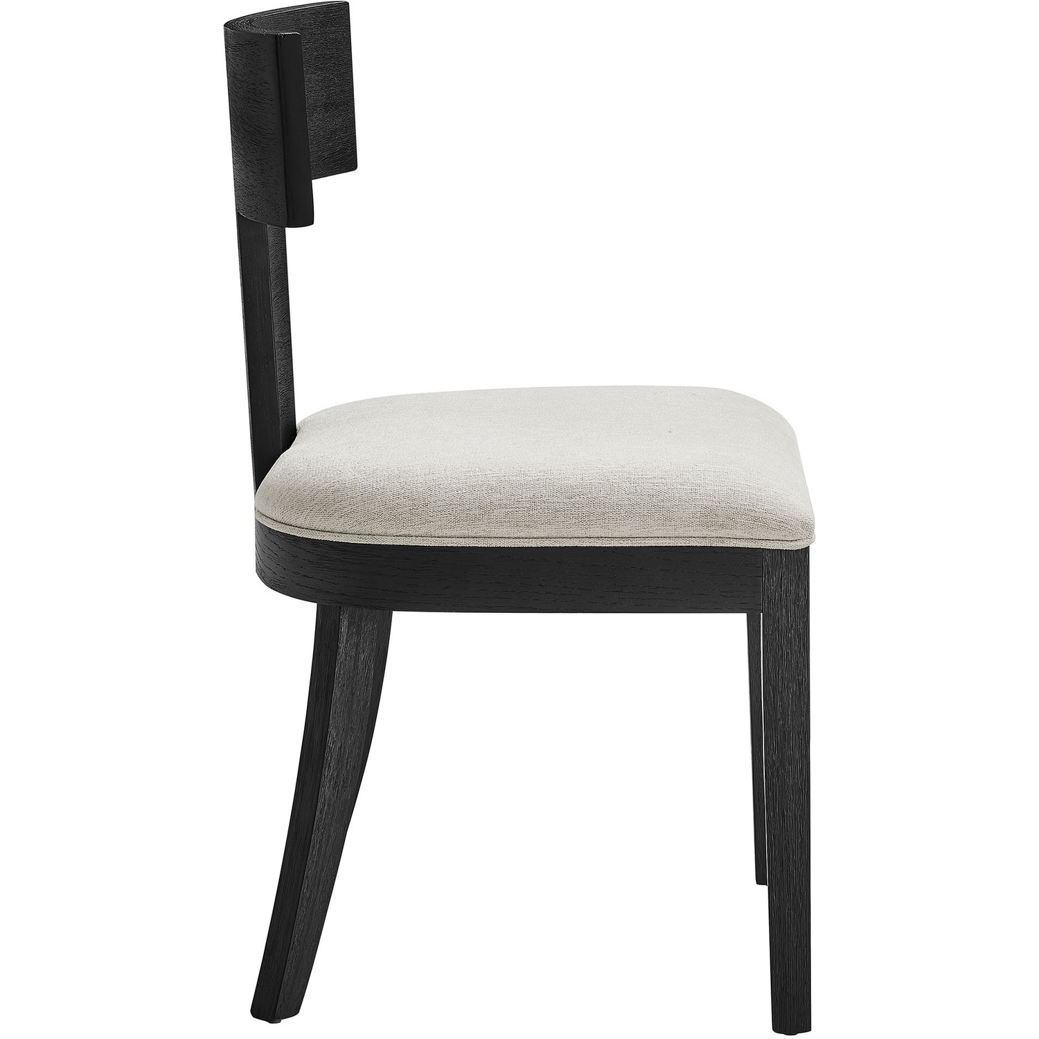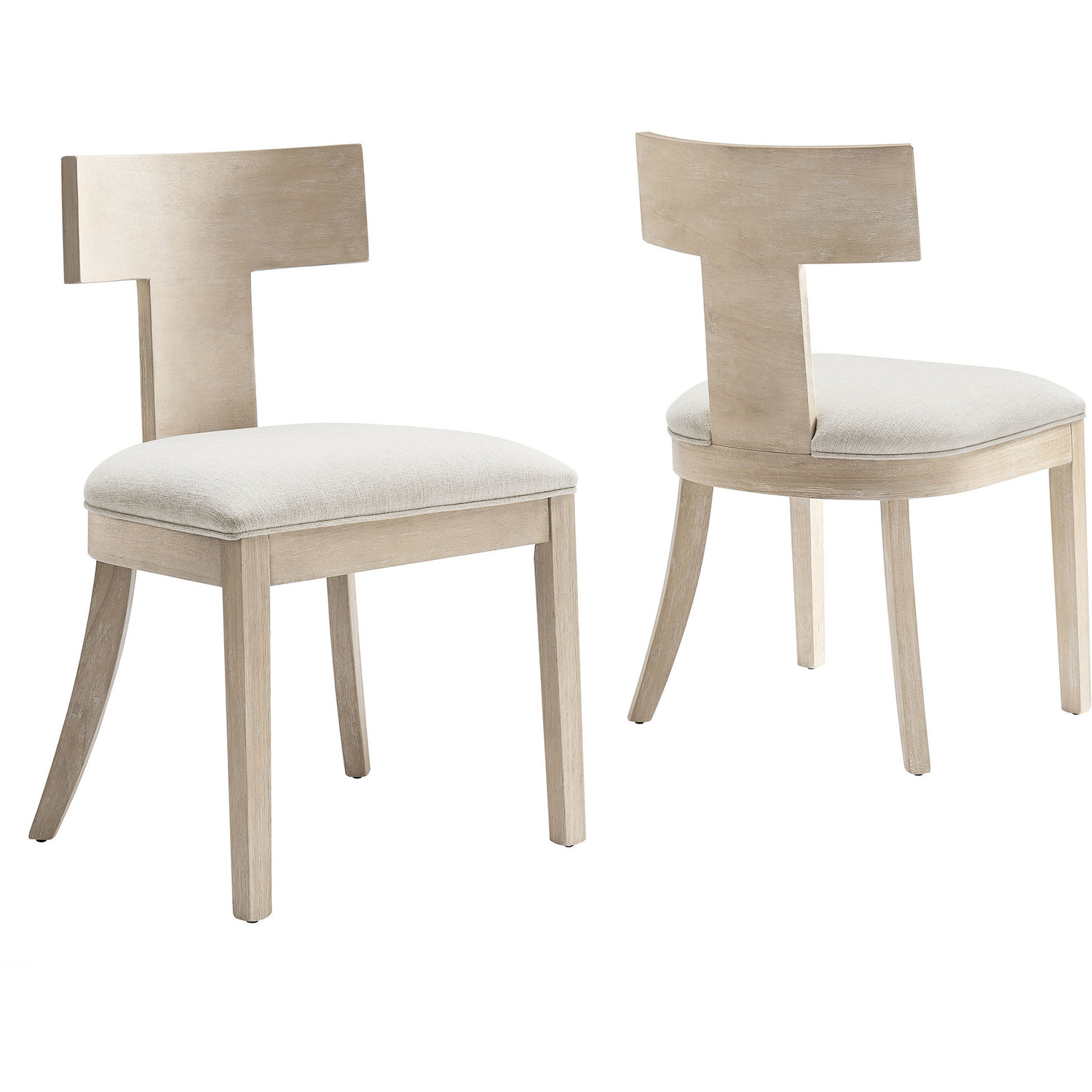 Enhance your living or dining space with the Peregrine Dining Side Chairs, a set of 2 accent chairs beautifully crafted from solid wood with a stunning natural wood grain finish. The unique curved backrest and back saber legs offer a blend of mid-century and modern farmhouse style. Featuring dense foam padding on the seat and heathered weave fabric upholstery, these armless chairs promise comfort and elegance. Ideal for dining rooms, kitchens, or as side chairs in the living room, this set of 2 wood upholstered chairs includes non-marking foot pins and requires assembly. Blending style and practicality, The Peregrine Dining Chairs with Curved Backs are versatile choices for kitchen table chairs or any contemporary dining area. Weight Capacity: 330 lbs.Set of 2 Dining Chairs