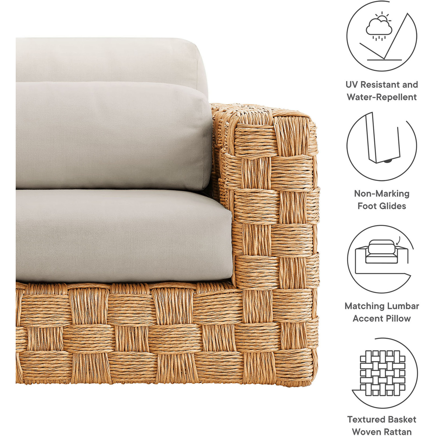 Create a serene outdoor retreat with the Thames Patio Armchair. Constructed with a sturdy powder-coated aluminum frame and enveloped in premium synthetic woven rattan that boasts a textured, basket-like weave, this wicker armchair brings earthy tones to your outdoor decor. Fitted with upholstered fabric cushions that have rolled edges and a lumbar throw pillow for added comfort, the Thames Patio Wicker Single Sofa is ideal for relaxation. Its deep seat is perfect for cozy evenings or lazy weekend mornings. Non-marking foot caps protect your outdoor surfaces, allowing you to move and position the rattan sofa chair with ease. The entire Thames Outdoor Patio Collection is UV-resistant and water-repellent, offering comfort that lasts season after season, making it an ideal addition for your patio, deck, or garden. With no assembly required and easy maintenance, this outdoor backyard chair invites you to unwind in style. Weight Capacity: 400 lbs.Textured Basket Woven Rattan