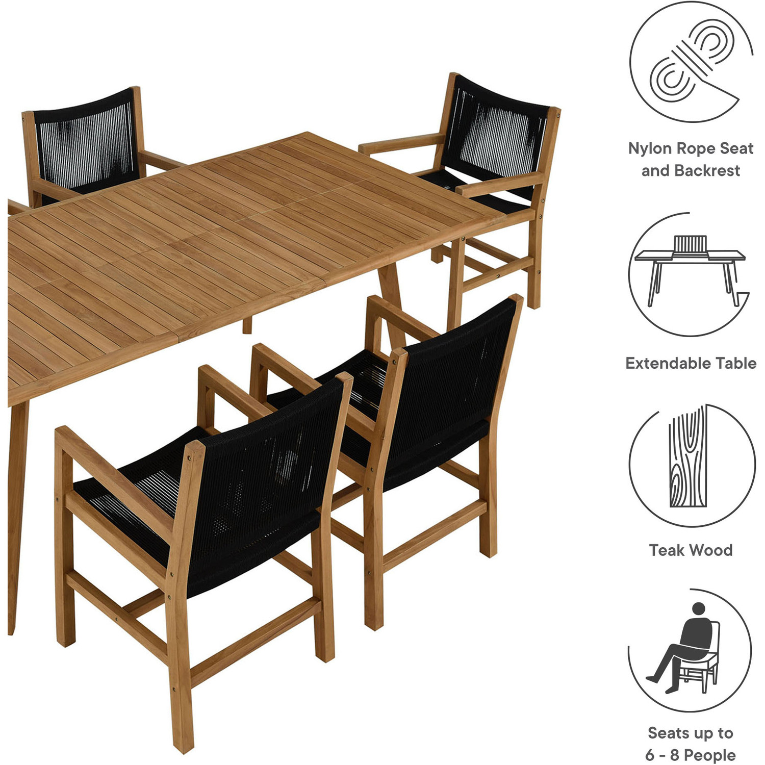 Refresh your outdoor dining experience with the 7-Piece Teak Rectangular Table Patio Furniture Set. This modern outside patio set includes the Vienna Extendable Teak Dining Table and 6 Vienna Outdoor Dining Armchairs, effortlessly accommodating larger gatherings along with everyday outside dining. The naturally weather-resistant teak outdoor dining table features a slatted surface and extends from 71" to 94.5", making it perfect for hosting more guests or adjusting to fit your outdoor patio needs. Add to that, its wood dining chairs with armrests and seats woven with high-quality nylon rope, and this patio dining furniture set for 6 creates a contemporary and cohesive look ideal for any patio or garden setting. Whether used on its own or mixed with other outdoor patio furniture, the Vienna 7 piece patio dining set blends effortlessly, complementing a diverse range of outdoor patios. Assembly Required.Extendable Outdoor Dining Table with Slatted Top