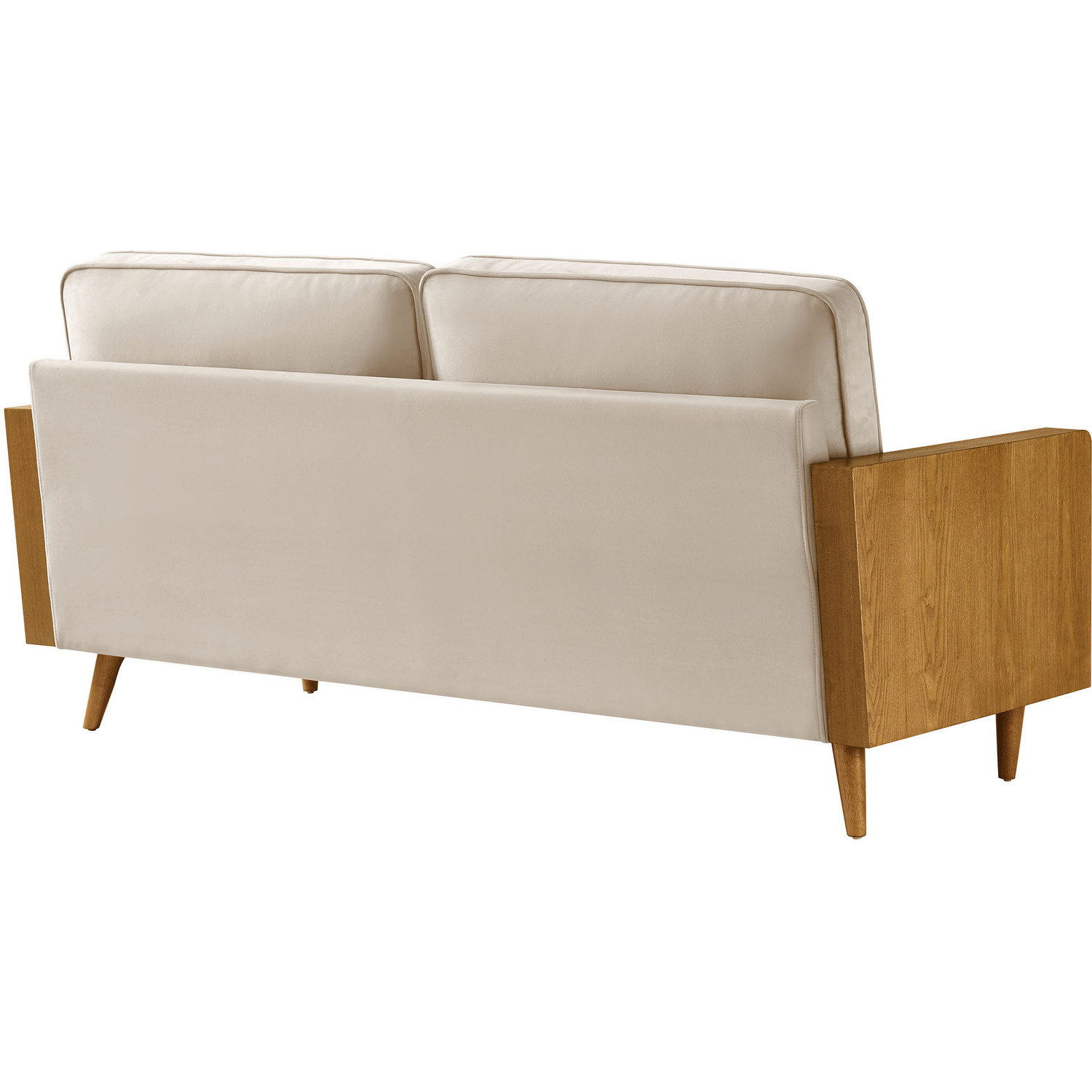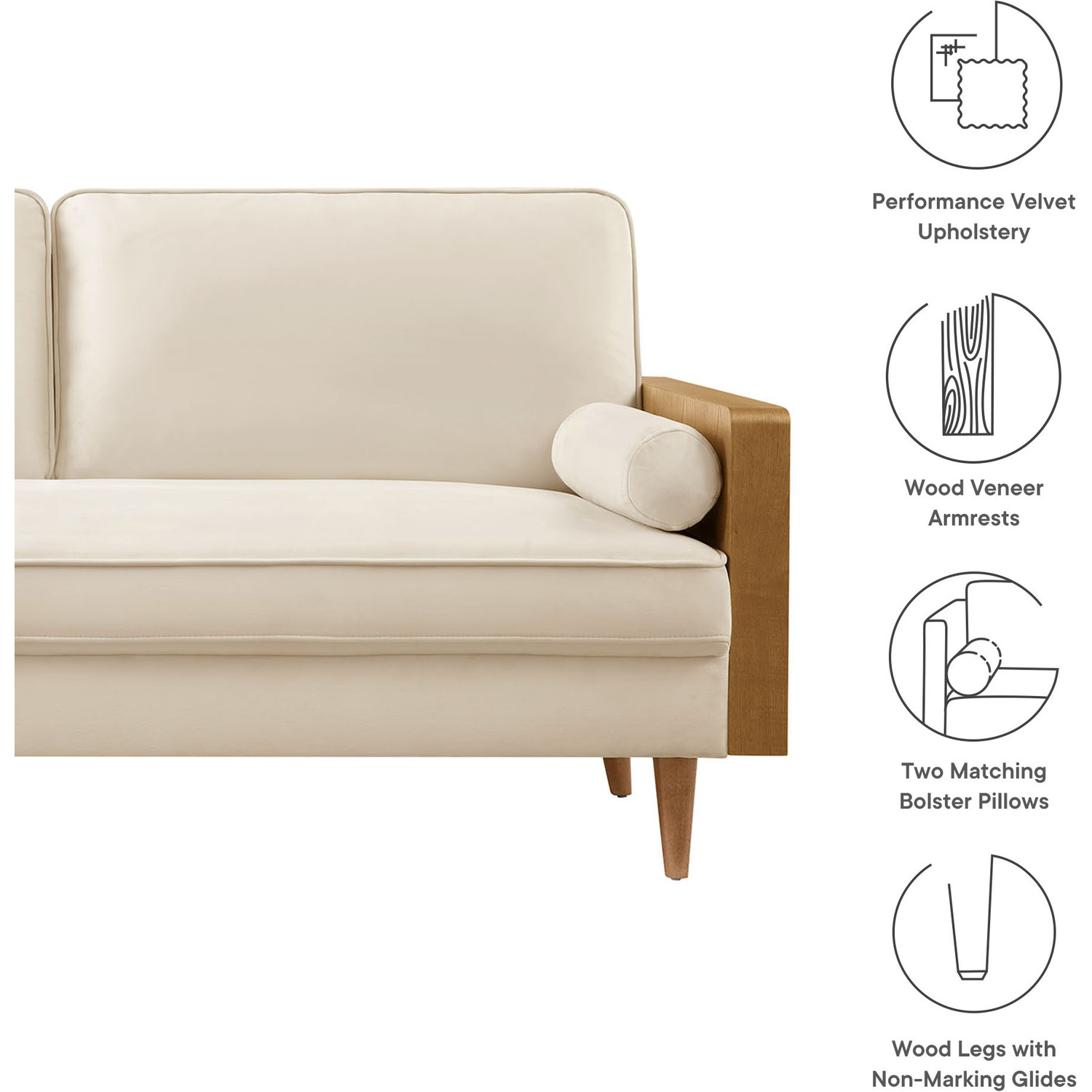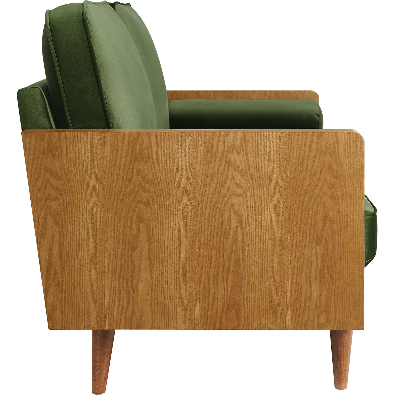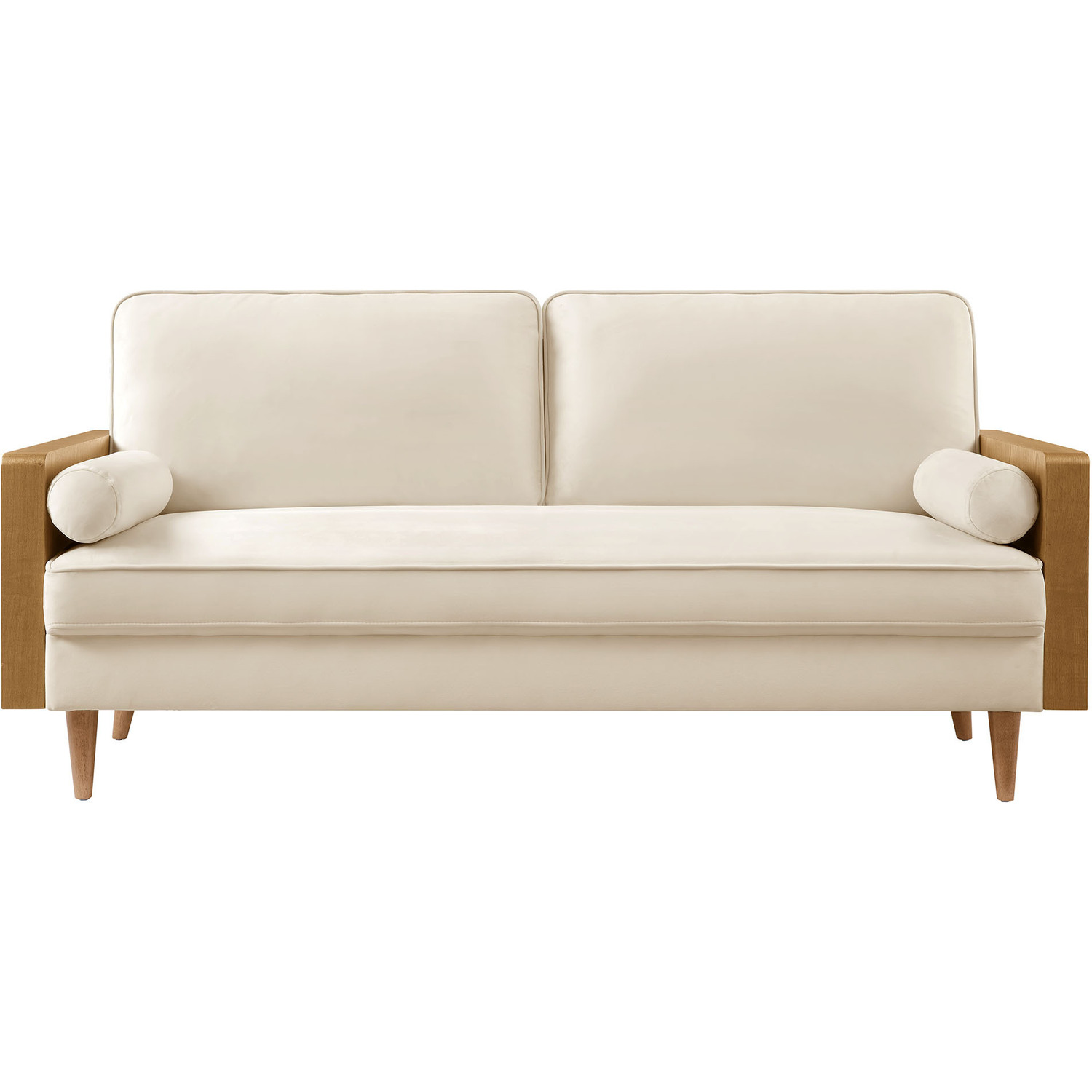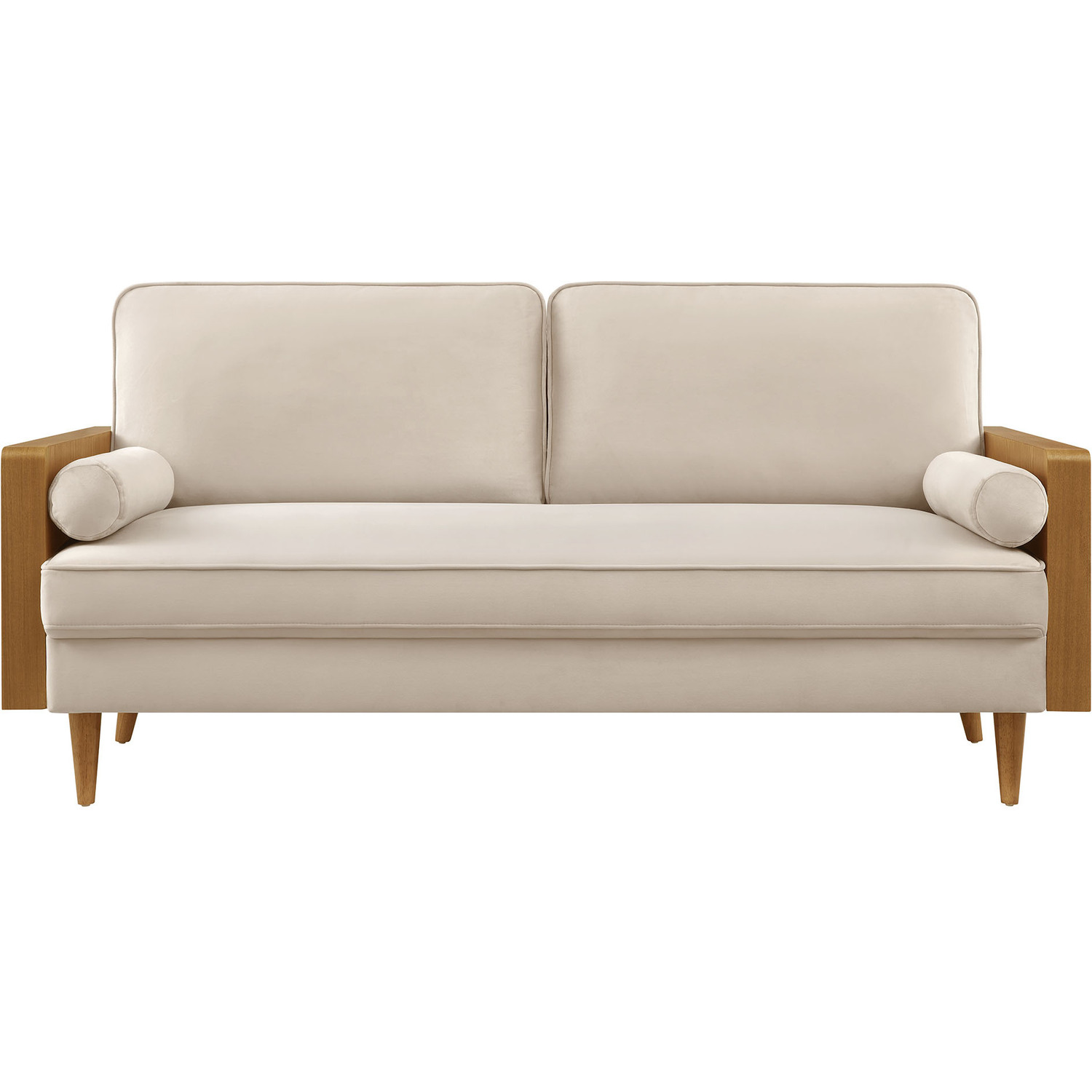 A statement piece for the discerning home, the Kellan Wood Velvet Sofa brings together style and comfort in an updated retro design. This stain-resistant couch is upholstered in luxurious performance velvet, offering a plush, sophisticated look that stands up to everyday life. The beautiful wood grain armrests, crafted from rich veneer, add a touch of natural warmth to its mid century modern contemporary aesthetic. Supported by tapered wood legs with non-marking floor glides, this deep seat sofa provides both style and practicality, protecting your flooring while enhancing the ambiance of your living room, bedroom, office, or reception area. High-density foam padding and zigzag spring support ensure a premium seating experience, while the down feather blend of the back and bolster cushions adds an extra layer of luxury. Whether as a mid century office couch or a plush couch for lounging, the Kellan Retro Sofa is a versatile velvet sofa that will elevate your living space with its refined style and supportive comfort. Assembly required. 3 Seater Sofa Weight Capacity: 893 lbs.Stain-Resistant Performance Velvet Upholstery