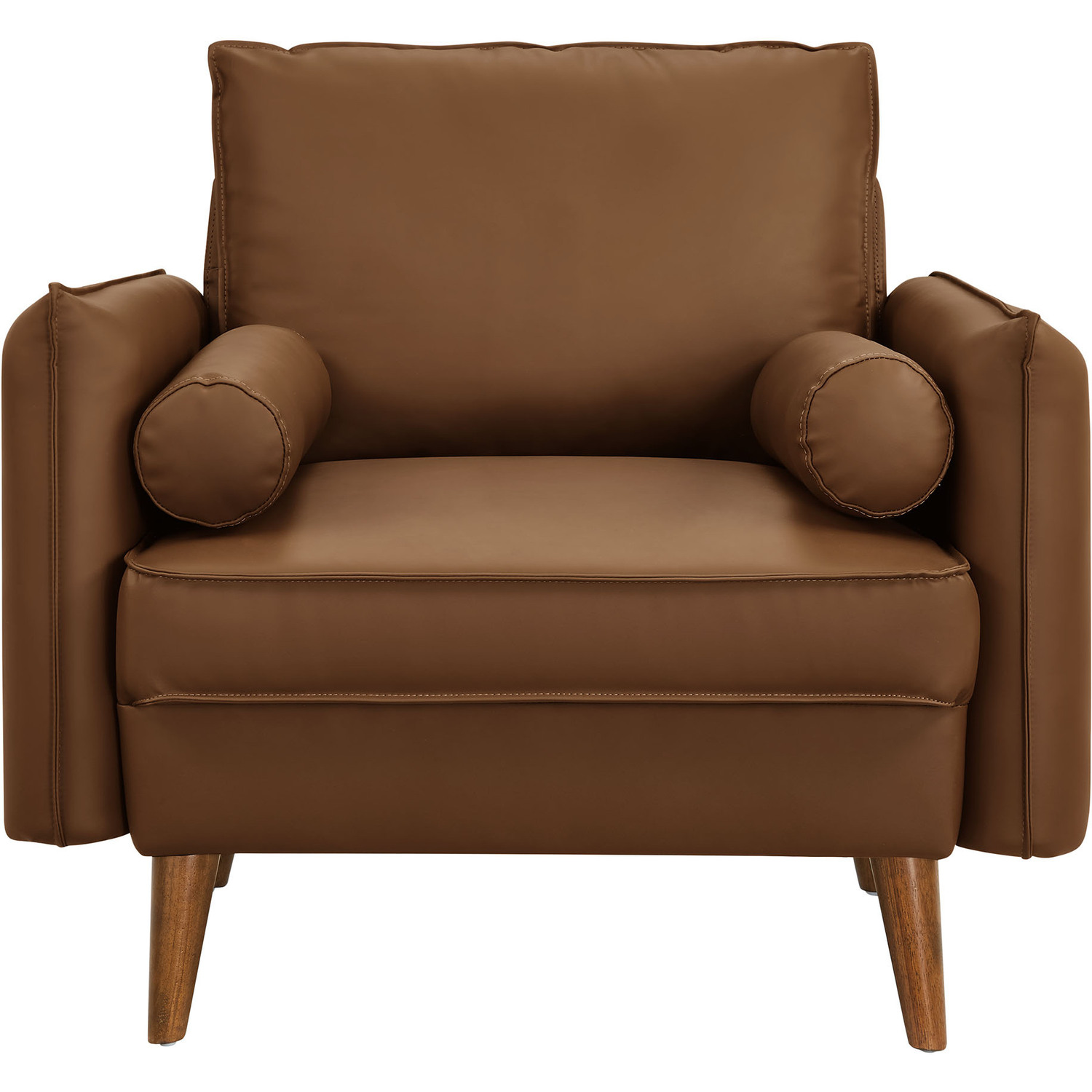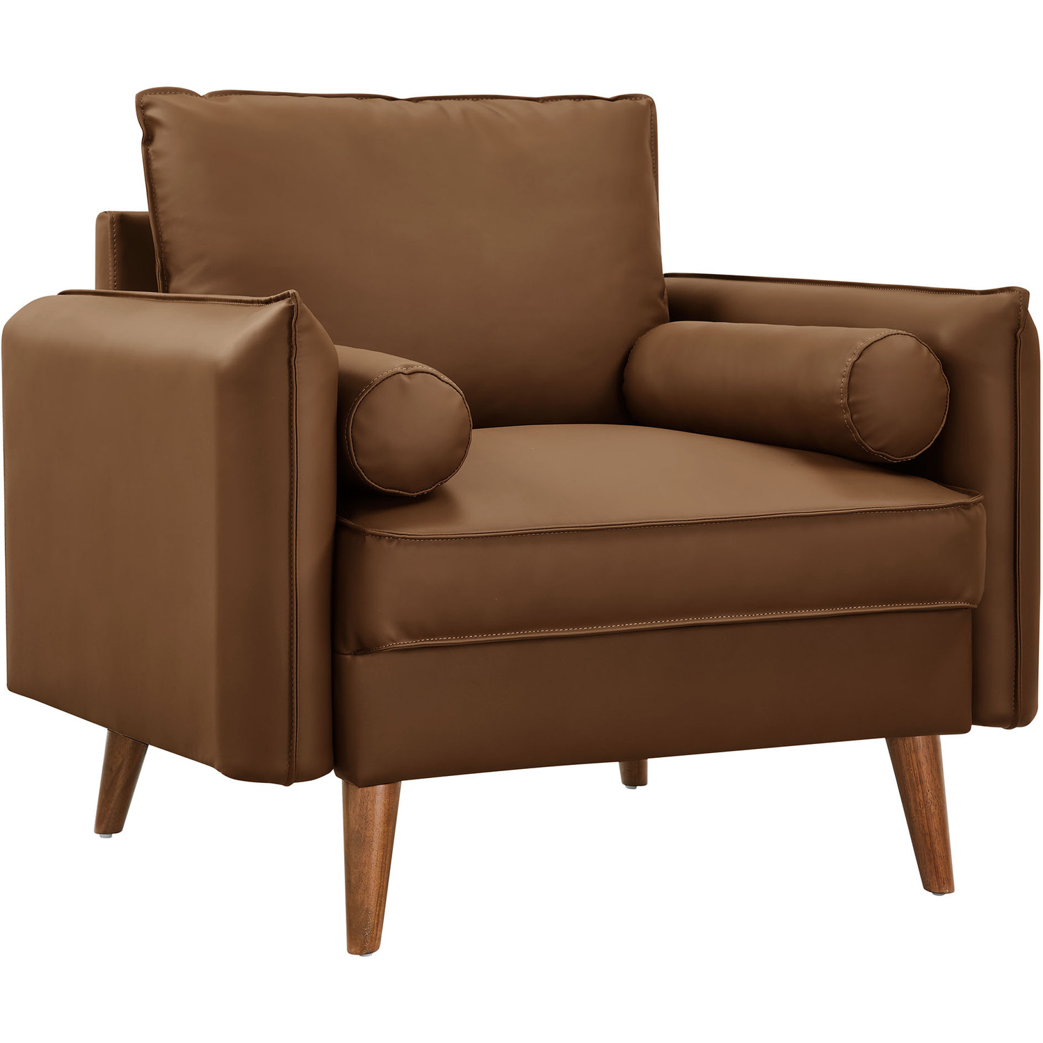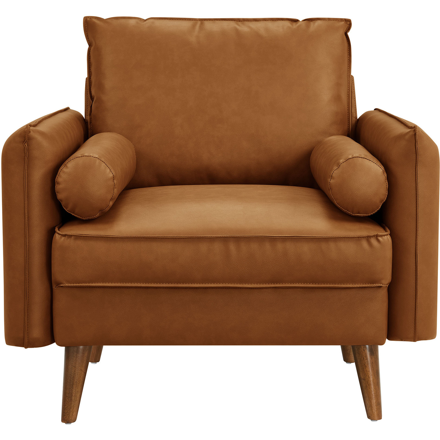Give new vitality to your home or apartment with the Revive Faux Leather Accent Armchair. With its sleek, tailored profile and plush bolster pillows, this PU leather club chair invites you to sit back and relax in style. Upholstered in rich vegan leather, this accent chair with arms exudes an approachable elegance, perfectly complemented by its clean lines and splayed wood legs. Designed for both comfort and style, the durable faux leather upholstery ensures this vintage chair maintains its charm through everyday use. Whether positioned as a corner chair, an accent piece in the living room, or a cozy lounge office chair, the Revive Sofa Chair offers a welcoming spot for relaxation and conversation. With its perfect blend of mid-century modern design and classic comfort, the Revive 1-Seater Armchair effortlessly enhances the ambiance of any space. Wide Arm Chair Weight Capacity: 400 lbs.Vegan Leather Upholstery